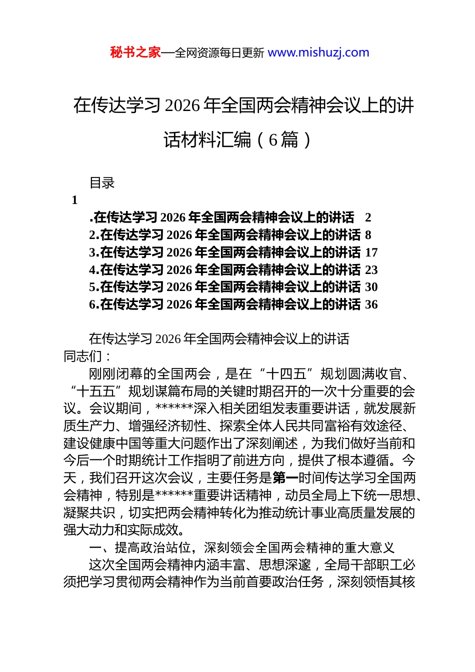 秘书之家—全网资源每日更新 www.mishuzj.com在传达学习 2026 年全国两会精神会议上的讲话材料汇编(6 篇)目录1.在传达学习 2026 年全国两会精神会议上的讲话22.在传达学习 2026 年全国两会精神会议上的讲话 83.在传达学习 2026 年全国两会精神会议上的讲话 174.在传达学习 2026 年全国两会精神会议上的讲话 235.在传达学习 2026 年全国两会精神会议上的讲话 306.在传达学习 2026 年全国两会精神会议上的讲话 36在传达学习 2026 年全国两会精神会议上的讲话同志们:刚刚闭幕的全国两会,是在“十四五”规划圆满收官、“十五五”规划谋篇布局的关键时期召开的一次十分重要的会议。会议期间,******深入相关团组发表重要讲话,就发展新质生产力、增强经济韧性、探索全体人民共同富裕有效途径、建设健康中国等重大问题作出了深刻阐述,为我们做好当前和今后一个时期统计工作指明了前进方向,提供了根本遵循。今天,我们召开这次会议,主要任务是第一时间传达学习全国两会精神,特别是******重要讲话精神,动员全局上下统一思想、凝聚共识,切实把两会精神转化为推动统计事业高质量发展的强大动力和实际成效。一、提高政治站位,深刻领会全国两会精神的重大意义这次全国两会精神内涵丰富、思想深邃,全局干部职工必须把学习贯彻两会精神作为当前首要政治任务,深刻领悟其核秘书之家—全网资源每日更新 www.mishuzj.com心要义和实践要求。一要深刻领悟“两个确立”的决定性意义。过去一年,面对复杂严峻的国际环境和艰巨繁重的国内改革发展稳定任务,我国经济社会发展取得新的重大成就,根本在于******领航掌舵,在于**************思想科学指引。全局上下必须深刻认识“两个确立”是战胜一切艰难险阻、应对一切不确定性的最大确定性、最大底气、最大保证,必须把对*绝对忠诚融入血脉、注入灵魂,坚决在思想上政治上行动上同以***同志为核心的*中央保持高度一致。二要深刻把握发展新质生产力的实践要求。******深刻阐述了新质生产力的科学内涵、核心要义和实践要求,强调要牢牢把握高质量发展这个首要任务,因地制宜发展新质生产力。今年政府工作报告将“大力推进现代化产业体系建设,加快发展新质生产力”列为首要任务,这既是理论概括,又是实践指南。统计部门作为经济社会发展的“晴雨表”“测量仪”,必须准确把握新质生产力的时代特征,积极探索建立新质生产力统计监测体系,科学反映新质生产力的演进规律和发展成效。三要深刻认识统计工作面临的新形势新任务。两会期间,******对统计工作提出了新的更高要求,强调要增强经济韧性,提升宏观调控的前瞻性、针对性。当前,xx 正处于转型升级的关键期,经济运行稳中有变、变中有忧,统计部门必须准确把握宏观经济运行态势,加强对重点领域、重点行业的监测预警,为*委政府科学决策提供坚实的数据支撑和优质的统计服务。二、聚焦主责主业,全力服务经济社会高质量发展贯彻落实全国两会精神,关键在于立足统计职能,找准服务大局的切入点和着力点,以高质量统计服务全市经济社会高质量发展。一要精准开展经济运行监测分析。要密切关注全市经济运行态势,聚焦“十五五”规划实施,围绕地区生产总值、规模以上工业增加值、社会消费品零售总额等核心指标,强化动态监测和趋势研判。要建立健全经济运行分析研判机制,加秘书之家—全网资源每日更新 www.mishuzj.com强对重点行业、重点企业的调研走访,及时发现经济运行中的苗头性、倾向性问题,提出有针对性的对策建议。特别是要针对当前经济复苏基础尚不牢固的情况,重点关注中小微企业经营状况、民间投资信心恢复情况、消费市场回暖程度等,为增强经济韧性提供精准的统计参考。二要探索完善新质生产力统计监测体系。发展新质生产力是推动高质量发展的内在要求和重要着力点。统计部门要主动适应新质生产力发展需要,积极探索建立新质生产力统计监测指标体系。要聚焦科技创新与产业创新融合、生物医药产业发展、低空经济、未来能源等领域,深入研究新产业、新业态、新商业模式的统计调查方法,科学测算新质生产力的规模、结构和贡献率。要加强对数字经济、绿色低...