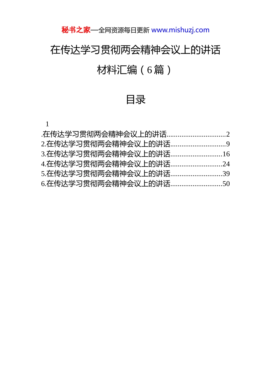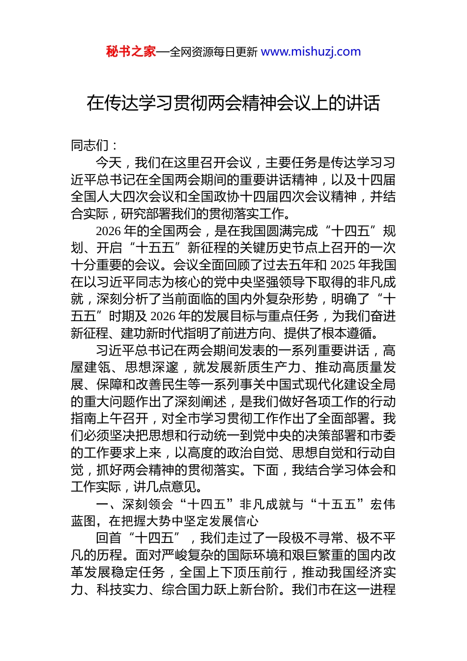 秘书之家—全网资源每日更新 www.mishuzj.com在传达学习贯彻两会精神会议上的讲话材料汇编(6 篇)目录1.在传达学习贯彻两会精神会议上的讲话................................22.在传达学习贯彻两会精神会议上的讲话..............................93.在传达学习贯彻两会精神会议上的讲话............................164.在传达学习贯彻两会精神会议上的讲话............................245.在传达学习贯彻两会精神会议上的讲话............................396.在传达学习贯彻两会精神会议上的讲话............................50秘书之家—全网资源每日更新 www.mishuzj.com在传达学习贯彻两会精神会议上的讲话同志们:今天,我们在这里召开会议,主要任务是传达学习习近平总书记在全国两会期间的重要讲话精神,以及十四届全国人大四次会议和全国政协十四届四次会议精神,并结合实际,研究部署我们的贯彻落实工作。2026 年的全国两会,是在我国圆满完成“十四五”规划、开启“十五五”新征程的关键历史节点上召开的一次十分重要的会议。会议全面回顾了过去五年和 2025 年我国在以习近平同志为核心的党中央坚强领导下取得的非凡成就,深刻分析了当前面临的国内外复杂形势,明确了“十五五”时期及 2026 年的发展目标与重点任务,为我们奋进新征程、建功新时代指明了前进方向、提供了根本遵循。习近平总书记在两会期间发表的一系列重要讲话,高屋建瓴、思想深邃,就发展新质生产力、推动高质量发展、保障和改善民生等一系列事关中国式现代化建设全局的重大问题作出了深刻阐述,是我们做好各项工作的行动指南上午召开,对全市学习贯彻工作作出了全面部署。我们必须坚决把思想和行动统一到党中央的决策部署和市委的工作要求上来,以高度的政治自觉、思想自觉和行动自觉,抓好两会精神的贯彻落实。下面,我结合学习体会和工作实际,讲几点意见。一、深刻领会“十四五”非凡成就与“十五五”宏伟蓝图,在把握大势中坚定发展信心回首“十四五”,我们走过了一段极不寻常、极不平凡的历程。面对严峻复杂的国际环境和艰巨繁重的国内改革发展稳定任务,全国上下顶压前行,推动我国经济实力、科技实力、综合国力跃上新台阶。我们市在这一进程秘书之家—全网资源每日更新 www.mishuzj.com中也取得了长足进步,这些成绩来之不易。展望“十五五”,两会擘画了新的发展蓝图。政府工作报告明确提出,“十五五”时期的主要目标任务涵盖经济发展、创新驱动、民生福祉、绿色低碳、安全保障等五大方面,并细化了包括国内生产总值增长保持在合理区间、全社会研发经费投入年均增长 7%以上、单位国内生产总值二氧化碳排放累计降低 17%等在内的 20 项主要指标。这充分体现了党中央对高质量发展的坚定决心和对人民福祉的高度重视。2026 年作为“十五五”开局之年,全国经济增长的预期目标设定在 5%左右,这是一个积极稳健、催人奋进的目标。对于我们而言,2026 年的地区生产总值增长目标同样设定为 5%以上。实现这一目标,需要我们准确把握国家战略导向,紧密结合自身优势,全力以赴抓落实、求突破。全市正在纵深推进的“六区一高地”建设,正是我们贯彻落实国家战略、推动高质量发展的总抓手。我们要深刻认识到,每一个指标的完成,都关系到现代化新建设的全局;“六区一高地”的每一项进展,都是对全国发展大局的有力贡献。我们必须胸怀“国之大者”,把发展置于全国发展大格局中去谋划和推进,以一域之光为全局添彩。二、聚焦发展新质生产力核心要义,在科技创新与产业升级上实现新突破习近平总书记在两会期间,特别是在参加江苏代表团审议时,深刻阐述了“新质生产力”这一重大理论和实践问题,强调要“因地制宜发展新质生产力”。这是我们理解和把握未来产业发展方向的关键所在。政府工作报告也将“大力推进现代化产业体系建设,加快发展新质生产力”列为 2026 年政府工作任务的首位,凸显了其极端重要性。发展新质生产力,主阵地在产业,关键靠创新。xx 市委明确要求,要着力打造产业创新和科技创新深度融合的标志性成果。结合我们 xx 的实际,必须做好以下几点。秘书之家...