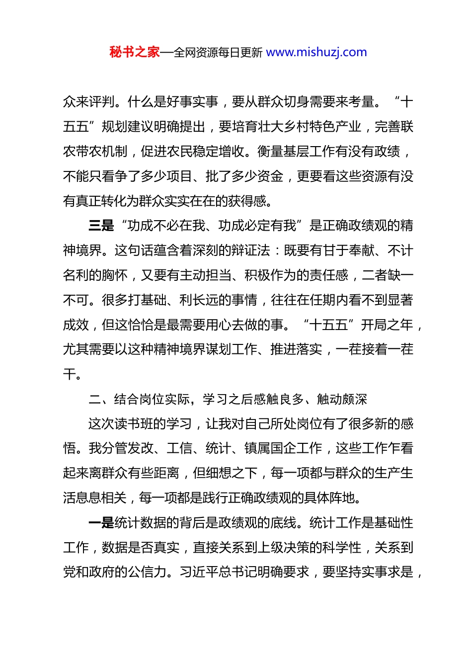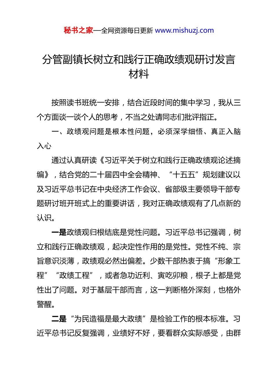 秘书之家—全网资源每日更新 www.mishuzj.com分管副镇长树立和践行正确政绩观研讨发言材料 按照读书班统一安排,结合近段时间的集中学习,我从三个方面谈一谈个人的思考,不当之处请同志们批评指正。一、政绩观问题是根本性问题,必须深学细悟、真正入脑入心通过认真研读《习近平关于树立和践行正确政绩观论述摘编》,结合党的二十届四中全会精神、“十五五”规划建议以及习近平总书记在中央经济工作会议、省部级主要领导干部专题研讨班开班式上的重要讲话,我对正确政绩观有了几点新的认识。一是政绩观归根结底是党性问题。习近平总书记强调,树立和践行正确政绩观,起决定性作用的是党性。党性不纯、宗旨意识淡薄,政绩观必然出偏差。少数干部热衷于搞“形象工程”“政绩工程”,或者急功近利、寅吃卯粮,根子上都是党性出了问题。对于基层干部而言,这一判断格外深刻,也格外警醒。二是“为民造福是最大政绩”是检验工作的根本标准。习近平总书记反复强调,业绩好不好,要看群众实际感受,由群秘书之家—全网资源每日更新 www.mishuzj.com众来评判。什么是好事实事,要从群众切身需要来考量。“十五五”规划建议明确提出,要培育壮大乡村特色产业,完善联农带农机制,促进农民稳定增收。衡量基层工作有没有政绩,不能只看争了多少项目、批了多少资金,更要看这些资源有没有真正转化为群众实实在在的获得感。三是“功成不必在我、功成必定有我”是正确政绩观的精神境界。这句话蕴含着深刻的辩证法:既要有甘于奉献、不计名利的胸怀,又要有主动担当、积极作为的责任感,二者缺一不可。很多打基础、利长远的事情,往往在任期内看不到显著成效,但这恰恰是最需要用心去做的事。“十五五”开局之年,尤其需要以这种精神境界谋划工作、推进落实,一茬接着一茬干。二、结合岗位实际,学习之后感触良多、触动颇深这次读书班的学习,让我对自己所处岗位有了很多新的感悟。我分管发改、工信、统计、镇属国企工作,这些工作乍看起来离群众有些距离,但细想之下,每一项都与群众的生产生活息息相关,每一项都是践行正确政绩观的具体阵地。一是统计数据的背后是政绩观的底线。统计工作是基础性工作,数据是否真实,直接关系到上级决策的科学性,关系到党和政府的公信力。习近平总书记明确要求,要坚持实事求是,秘书之家—全网资源每日更新 www.mishuzj.com不搞数字游戏。这次学习让我深切感受到,维护统计数据的真实性,不是一项简单的业务要求,而是政绩观的底线,是对党和人民最基本的诚实。二是产业发展的落脚点必须是农民增收。XX 镇高山蜜薯已入选“全国名特优新农产品”名录,蔬菜产业年产值近千万元,云埔蔬菜合作社带动周边 7 个村村均增收超 30 万元、提供就业岗位 300 多个。这些数字背后,是一户户农民家庭实实在在的生活改善。这次学习让我更加清晰地认识到,推动产业发展不是为了数据好看,而是为了让更多群众从中受益。产业链延伸到哪里、联农带农机制建立到哪里,政绩观才真正落地到哪里。三是镇属国企的价值不在规模而在服务。在分管镇属国企工作中,这次学习让我重新思考了一个问题:国企存在的意义是什么?习近平总书记强调,要增强国有企业核心功能。对于乡镇一级的国企而言,核心功能不是追求利润最大化,而是在市场失灵的地方补位、在群众需要的地方发力,在服务地方发展大局中体现价值。这是我以前想得不够透彻的地方,这次学习让我想清楚了。三、脚踏实地、久久为功,在“十五五”开局之年干出经得起检验的实绩秘书之家—全网资源每日更新 www.mishuzj.com认识和体会最终要落到行动上。结合“十五五”开局之年的工作实际,我对下一步践行正确政绩观有以下几点打算。一是把调查研究的功课做在决策前面。无论是发改项目谋划、工信产业培育,还是镇属国企发展方向的研判,都要把调查研究放在决策之前,多到田间地头、企业一线走一走、看一看,把实情摸清楚、把问题找准确,用第一手资料支撑决策,不拍脑袋、不想当然。“十五五”规划建议提出要发展各具特色的县域经济,XX 镇的比较优势在哪里、短板制约在哪里,需要通过扎实调研来回答,坐在办公室里是推...