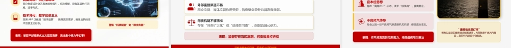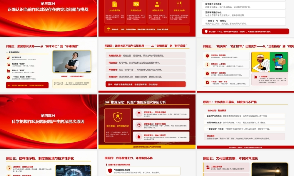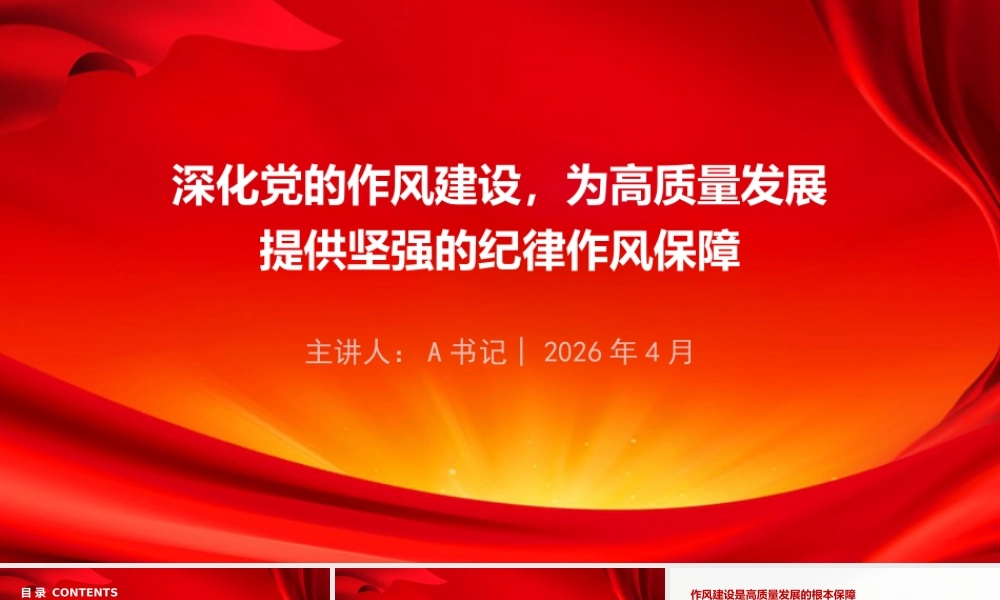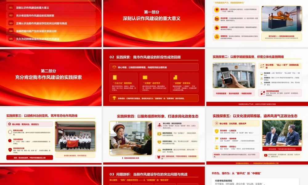 深化党的作风建设,为高质量发展提供坚强的纪律作风保障主讲人: A 书记 | 2026 年 4 月目 录 CONTENTS01深刻认识作风建设的重大意义02充分肯定我市作风建设的实践探索03正确认识当前作风建设存在的突出问题与挑战04准确把握问题产生的深层次原因分析05久久为功持续加强和改进党的作风建设第一部分深刻认识作风建设的重大意义作风建设是高质量发展的根本保障“ 作风就是生产力,效能就是竞争力”服务大局:立足区域中心城市定位,以优良作风保障全省“十五五”发展大局。优化环境:打造高效廉洁政务服务,以一流作风构筑一流营商环境,激发市场活力。破解难题:以过硬作风直面发展挑战,精准施策突破瓶颈,推动事业行稳致远。保障民生:解决群众急难愁盼,将作风转变成效转化为群众的获得感与幸福感。现代化港口——高质量发展的生动实践高效运转的港口物流是区域经济活力与优良作风的直接体现第二部分充分肯定我市作风建设的实践探索02 实践探索:我市作风建设的阶段性成效回顾核心举措:以制度创新解难题,构建高效能治理机制“ 三法三化”制度落地推行任务项目化、清单化、具体化,落实一线工作法,确保政令畅通、执行有力。“ 红黑榜”动态考评建立常态化考评机制,强化结果运用,奖优罚劣,激发干部担当作为的内生动力。“ 放管服”改革深化推进政务服务“一网通办”,开设“办不成事”兜底窗口,切实解决群众急难愁盼问题。改革成效:打破传统行政壁垒,推动机关运行从“流程导向”向“效果导向”根本性转变。实践探索二:以数字赋能强监督,织密立体化监督网络科技赋能监督 · 指尖传递民意 · 构建阳光政府核心举措:“线上 + 线下”深度融合监督指尖监督:上线“我市评议”“码上反映”平台,一键直达资源聚合:整合 12345 热线与纪检举报平台,打破信息壁垒实地巡察:聚焦重点领域开展专项行动,深化“阳光政府”建设闭环管理成效显著实现“群众点单、部门接单、社会评单”全流程监督,精准高效。持续推进全面从严治党,以数字化手段提升监督执纪效能实践探索三:以顽疾纠治刹歪风,筑牢常态化作风防线核心举措:靶向纠治,精准发力聚焦突出问题印发专项整治方案,集中纠治党员干部违规饮酒等易发多发问题。深挖问题根源以“小切口”推动“大整治”,从制度机制层面堵塞漏洞,标本兼治。坚持零容忍态度做到“查实一起、曝光一起、处理一起”,形成有力震慑,绝不姑息。成效:坚决刹住歪风,铲除作风问题滋生土壤参观警示教育基地,筑牢思想防线实践探索四:以服务提质树形象,打造亲民化政务生态▌ 民族语言服务窗口实景核心举措:角色深度转型从传统“管理者”向主动“服务者”转变,以群众需求为导向。服务民族团结:开设“双语窗口”,消除语言隔阂,实现沟通零距离。改善民生福祉:深化“我为群众办实事”,精准解决群众急难愁盼问题。优化营商环境:建立企业专员制度,提供全流程“一站式”帮办服务。成效:服务有温度,干群关系更密切,形象显著提升实践探索五:以文化浸润筑根基,涵养风清气正政治生态核心举措:文化育廉,润物无声警示教育 · 以案促改拍摄《警钟长鸣》专题片,用“身边事”教育“身边人”红色传承 · 精神铸魂弘扬“老山精神”“西畴精神”,打造党性党风教育基地民族特色 · 院坝连心通过“院坝会”“火塘会”等形式,实现干群零距离沟通实践成效:形成具有边疆民族特色的作风建设范式,拉近干群距离。院坝会现场:干部与群众面对面亲切交流把政策送到家,把问题解决掉,真正做到“从群众中来,到群众中去”。作风建设永远在路上 —— 持续推进新时代党的建设新的伟大工程第三部分正确认识当前作风建设存在的突出问题与挑战03 问题剖析:当前作风建设存在的突出问题与挑战核心聚焦:“四风”问题依然存在 —— 从“反弹回潮”到“隐形变异”文山会海反弹重复开会、冗长低效,文件数量泛滥但质量低下,基层不堪重负。数字形式主义过度依赖电子台账、 APP 打卡留痕,手段数字化,本质却加重了形式主义。官僚主义作祟决策“拍脑袋”脱离实际,调 研 “ 走 马 观 花 ” 不 接 地气,缺乏担当精神。...