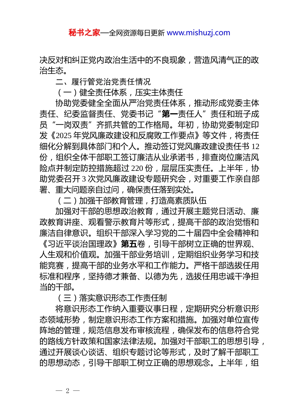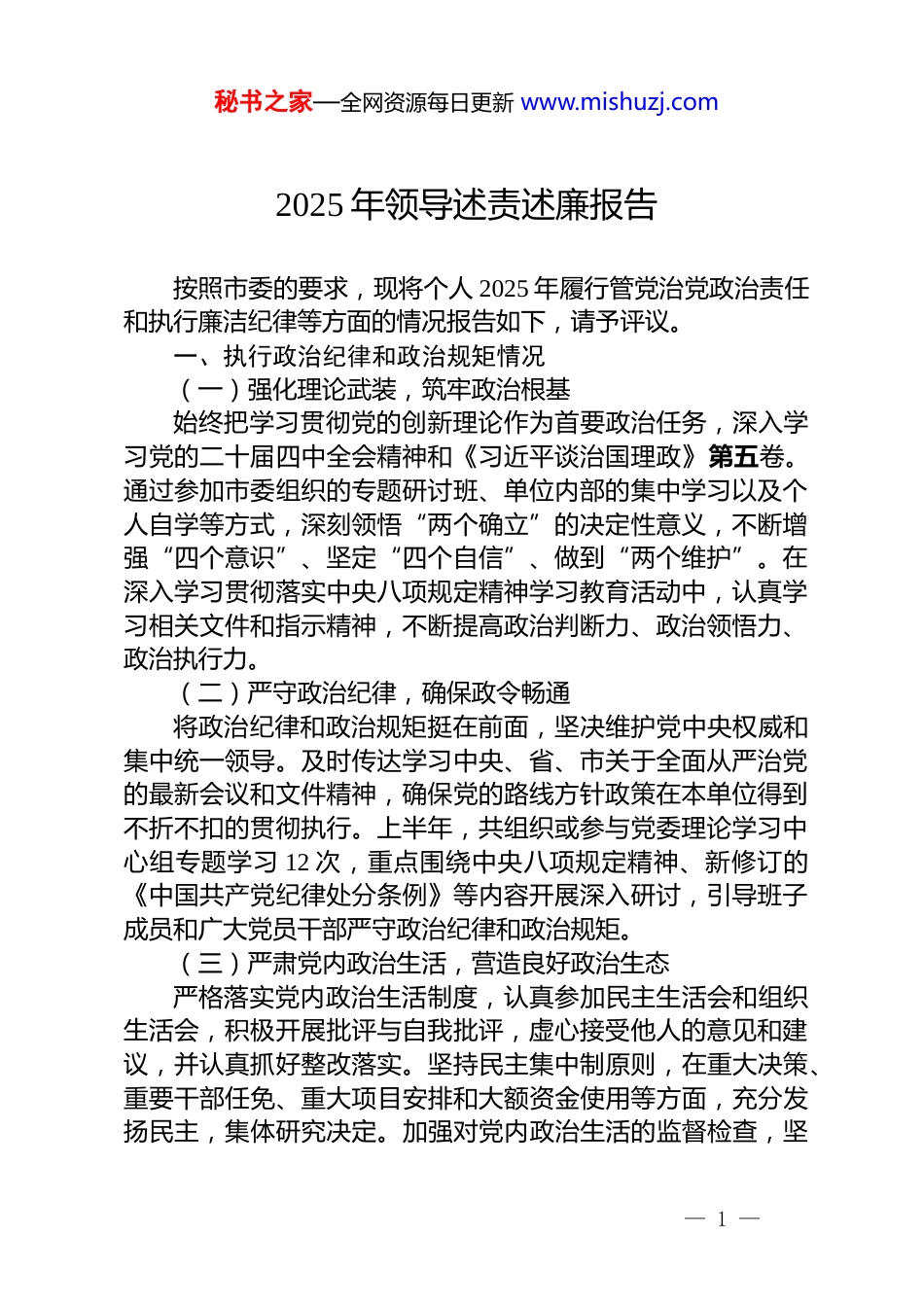 秘书之家—全网资源每日更新 www.mishuzj.com2025 年领导述责述廉报告按照市委的要求,现将个人 2025 年履行管党治党政治责任和执行廉洁纪律等方面的情况报告如下,请予评议。一、执行政治纪律和政治规矩情况(一)强化理论武装,筑牢政治根基始终把学习贯彻党的创新理论作为首要政治任务,深入学习党的二十届四中全会精神和《习近平谈治国理政》第五卷。通过参加市委组织的专题研讨班、单位内部的集中学习以及个人自学等方式,深刻领悟“两个确立”的决定性意义,不断增强“四个意识”、坚定“四个自信”、做到“两个维护”。在深入学习贯彻落实中央八项规定精神学习教育活动中,认真学习相关文件和指示精神,不断提高政治判断力、政治领悟力、政治执行力。(二)严守政治纪律,确保政令畅通将政治纪律和政治规矩挺在前面,坚决维护党中央权威和集中统一领导。及时传达学习中央、省、市关于全面从严治党的最新会议和文件精神,确保党的路线方针政策在本单位得到不折不扣的贯彻执行。上半年,共组织或参与党委理论学习中心组专题学习 12 次,重点围绕中央八项规定精神、新修订的《中国共产党纪律处分条例》等内容开展深入研讨,引导班子成员和广大党员干部严守政治纪律和政治规矩。(三)严肃党内政治生活,营造良好政治生态严格落实党内政治生活制度,认真参加民主生活会和组织生活会,积极开展批评与自我批评,虚心接受他人的意见和建议,并认真抓好整改落实。坚持民主集中制原则,在重大决策、重要干部任免、重大项目安排和大额资金使用等方面,充分发扬民主,集体研究决定。加强对党内政治生活的监督检查,坚— 1 —秘书之家—全网资源每日更新 www.mishuzj.com决反对和纠正党内政治生活中的不良现象,营造风清气正的政治生态。二、履行管党治党责任情况(一)健全责任体系,压实主体责任协助党委健全全面从严治党责任体系,推动形成党委主体责任、纪委监督责任、党委书记“第一责任人”责任和班子成员“一岗双责”齐抓共管的工作格局。年初,协助党委制定印发《2025 年党风廉政建设和反腐败工作要点》等文件,将责任细化分解到具体部门和个人。推动签订党风廉政建设责任书 12份,组织全体干部职工签订廉洁从业承诺书,排查岗位廉洁风险点并制定防控措施超过 220 份,层层压实责任。上半年,协助党委召开 3 次党风廉政建设专题研究会,对重要工作亲自部署、重大问题亲自过问,确保责任落到实处。(二)加强干部教育管理,打造高素质队伍加强对干部的思想政治教育,通过开展主题党日活动、廉政教育讲座、观看警示教育片等形式,提高干部的政治觉悟和廉洁自律意识。组织干部深入学习党的二十届四中全会精神和《习近平谈治国理政》第五卷,引导干部树立正确的世界观、人生观和价值观。加强干部业务培训,定期组织业务学习和技能竞赛,提高干部的业务水平和工作能力。严格干部选拔任用标准和程序,坚持德才兼备、以德为先,选拔任用忠诚干净担当的干部。(三)落实意识形态工作责任制将意识形态工作纳入重要议事日程,定期研究分析意识形态领域形势,制定意识形态工作方案和措施。加强对单位宣传阵地的管理,规范信息发布审核流程,确保发布的信息符合党的路线方针政策和国家法律法规。加强对干部职工的思想引导,通过开展谈心谈话、组织专题讨论等形式,及时了解干部职工的思想动态,引导干部职工树立正确的思想观念。上半年,组— 2 —秘书之家—全网资源每日更新 www.mishuzj.com织开展意识形态专题学习 5 次,对意识形态工作进行专项检查 2次。三、推进党风廉政建设和反腐败工作情况(一)加强廉政教育,增强廉洁意识坚持把廉洁教育作为一体推进“三不腐”的基础性工程来抓。以深入贯彻中央八项规定精神学习教育为契机,牵头组织开展形式多样的警示教育活动 9 次,内容涵盖节前廉政提醒谈话、专题讲座、观看警示教育片及学习典型案例通报等。上半年,累计开展各层级谈心谈话 9 次,重点覆盖新任职干部、关键岗位人员等,做到早提醒、早纠正。充分运用单位微信公众号等新媒体平台,常态化推送廉洁文化信息,营造“以清为美、以廉为荣”的浓厚氛围。(...