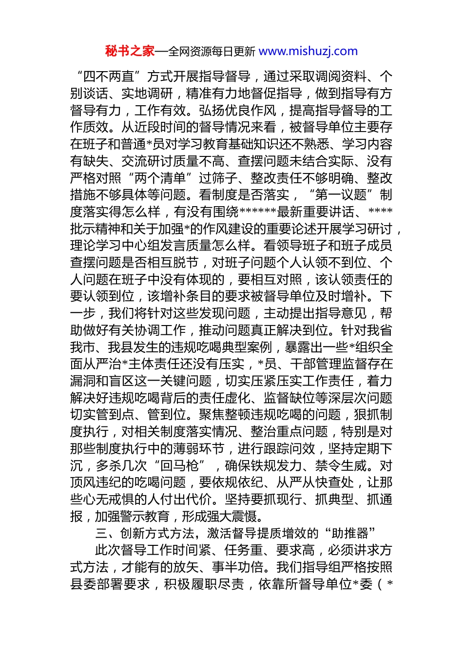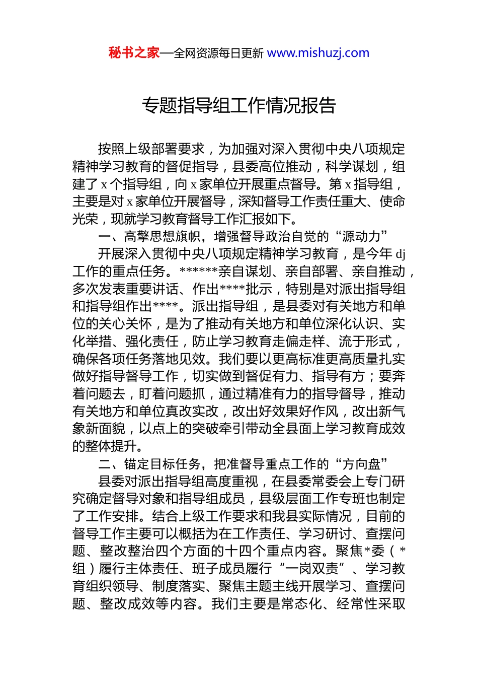 秘书之家—全网资源每日更新 www.mishuzj.com专题指导组工作情况报告按照上级部署要求,为加强对深入贯彻中央八项规定精神学习教育的督促指导,县委高位推动,科学谋划,组建了 x 个指导组,向 x 家单位开展重点督导。第 x 指导组,主要是对 x 家单位开展督导,深知督导工作责任重大、使命光荣,现就学习教育督导工作汇报如下。一、高擎思想旗帜,增强督导政治自觉的“源动力”开展深入贯彻中央八项规定精神学习教育,是今年 dj工作的重点任务。******亲自谋划、亲自部署、亲自推动,多次发表重要讲话、作出****批示,特别是对派出指导组和指导组作出****。派出指导组,是县委对有关地方和单位的关心关怀,是为了推动有关地方和单位深化认识、实化举措、强化责任,防止学习教育走偏走样、流于形式,确保各项任务落地见效。我们要以更高标准更高质量扎实做好指导督导工作,切实做到督促有力、指导有方;要奔着问题去,盯着问题抓,通过精准有力的指导督导,推动有关地方和单位真改实改,改出好效果好作风,改出新气象新面貌,以点上的突破牵引带动全县面上学习教育成效的整体提升。二、锚定目标任务,把准督导重点工作的“方向盘”县委对派出指导组高度重视,在县委常委会上专门研究确定督导对象和指导组成员,县级层面工作专班也制定了工作安排。结合上级工作要求和我县实际情况,目前的督导工作主要可以概括为在工作责任、学习研讨、查摆问题、整改整治四个方面的十四个重点内容。聚焦*委(*组)履行主体责任、班子成员履行“一岗双责”、学习教育组织领导、制度落实、聚焦主题主线开展学习、查摆问题、整改成效等内容。我们主要是常态化、经常性采取秘书之家—全网资源每日更新 www.mishuzj.com“四不两直”方式开展指导督导,通过采取调阅资料、个别谈话、实地调研,精准有力地督促指导,做到指导有方督导有力,工作有效。弘扬优良作风,提高指导督导的工作质效。从近段时间的督导情况来看,被督导单位主要存在班子和普通*员对学习教育基础知识还不熟悉、学习内容有缺失、交流研讨质量不高、查摆问题未结合实际、没有严格对照“两个清单”过筛子、整改责任不够明确、整改措施不够具体等问题。看制度是否落实,“第一议题”制度落实得怎么样,有没有围绕******最新重要讲话、****批示精神和关于加强*的作风建设的重要论述开展学习研讨,理论学习中心组发言质量怎么样。看领导班子和班子成员查摆问题是否相互脱节,对班子问题个人认领不到位、个人问题在班子中没有体现的,要相互对照,该认领责任的要认领到位,该增补条目的要求被督导单位及时增补。下一步,我们将针对这些发现问题,主动提出指导意见,帮助做好有关协调工作,推动问题真正解决到位。针对我省我市、我县发生的违规吃喝典型案例,暴露出一些*组织全面从严治*主体责任还没有压实,*员、干部管理监督存在漏洞和盲区这一关键问题,切实压紧压实工作责任,着力解决好违规吃喝背后的责任虚化、监督缺位等深层次问题切实管到点、管到位。聚焦整顿违规吃喝的问题,狠抓制度执行,对相关制度落实情况、整治重点问题,特别是对那些制度执行中的薄弱环节,进行跟踪问效,坚持定期下沉,多杀几次“回马枪”,确保铁规发力、禁令生威。对顶风违纪的吃喝问题,要依规依纪、从严从快查处,让那些心无戒惧的人付出代价。坚持要抓现行、抓典型、抓通报,加强警示教育,形成强大震慑。三、创新方式方法,激活督导提质增效的“助推器”此次督导工作时间紧、任务重、要求高,必须讲求方式方法,才能有的放矢、事半功倍。我们指导组严格按照县委部署要求,积极履职尽责,依靠所督导单位*委(*秘书之家—全网资源每日更新 www.mishuzj.com组)开展督导工作,与所督导的单位共同学习提高,把解决问题作为分内之事、应尽之责,做到真诚帮助、同心同向、同题共答。督促各级*委(*组)坚决扛牢主体责任,始终从政治上看违规吃喝问题的本质和危害,对违规吃喝问题集中整治,统筹谋划部署,强力推进落实。主要负责同志要履行好第一责任人职责,亲自上手抓、直接带头管不能简单把任务交给纪委、分管领导。领导班子成员要认真落实“...