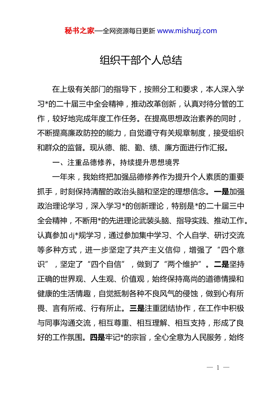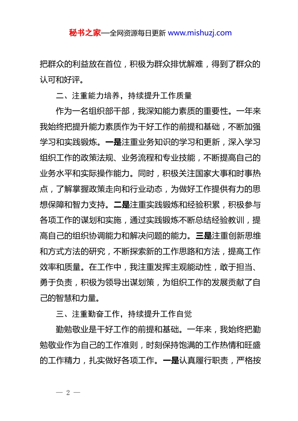 秘书之家—全网资源每日更新 www.mishuzj.com组织干部个人总结在上级有关部门的指导下,按照分工和要求,本人深入学习*的二十届三中全会精神,推动改革创新,认真对待分管的工作,较好地完成年度工作任务。在提高思想政治素养的同时,不断提高廉政防控的能力,自觉遵守有关规章制度,接受组织和群众的监督。现从德、能、勤、绩、廉方面进行作汇报。一、注重品德修养,持续提升思想境界一年来,我始终把加强品德修养作为提升个人素质的重要抓手,时刻保持清醒的政治头脑和坚定的理想信念。一是加强政治理论学习,深入学习*的创新理论,特别是*的二十届三中全会精神,不断用*的先进理论武装头脑、指导实践、推动工作。认真参加 dj*规学习,通过参加集中学习、个人自学、研讨交流等多种方式,进一步坚定了共产主义信仰,增强了“四个意识”,坚定了“四个自信”,做到了“两个维护”。二是坚持正确的世界观、人生观、价值观,始终保持高尚的道德情操和健康的生活情趣,自觉抵制各种不良风气的侵蚀,做到心有所畏、言有所戒、行有所止。三是注重团结协作,在工作中积极与同事沟通交流,相互尊重、相互理解、相互支持,形成了良好的工作氛围。四是牢记*的宗旨,全心全意为人民服务,始终— 1 —秘书之家—全网资源每日更新 www.mishuzj.com把群众的利益放在首位,积极为群众排忧解难,得到了群众的认可和好评。二、注重能力培养,持续提升工作质量作为一名组织部干部,我深知能力素质的重要性。一年来我始终把提升能力素质作为干好工作的前提和基础,不断加强学习和实践锻炼。一是注重业务知识的学习和更新,深入学习组织工作的政策法规、业务流程和专业技能,不断提高自己的业务水平和实际操作能力。同时,积极关注国家大事和时事热点,了解掌握政策走向和行业动态,为做好工作提供有力的思想保障和智力支持。二是注重实践锻炼和经验积累,积极参与各项工作的谋划和实施,通过实践锻炼不断总结经验教训,提高自己的组织协调能力和解决问题的能力。三是注重创新思维和方式方法的研究,不断探索新的工作思路和方法,提高工作效率和质量。在工作中,我注重发挥主观能动性,敢于担当、勇于负责,积极为领导出谋划策,为组织工作的发展贡献了自己的智慧和力量。三、注重勤奋工作,持续提升工作自觉勤勉敬业是干好工作的前提和基础。一年来,我始终把勤勉敬业作为自己的工作准则,时刻保持饱满的工作热情和旺盛的工作精力,扎实做好各项工作。一是认真履行职责,严格按— 2 —秘书之家—全网资源每日更新 www.mishuzj.com照组织工作的要求和规定,认真完成各项工作任务。在工作中,我注重细节和过程管理,确保每一项工作都能够按照计划有序推进、按时完成。二是注重工作质量和效率,始终坚持高标准、严要求,力求每一项工作都能够达到最佳效果。在工作中,我注重创新和优化工作流程和方法,提高工作效率和质量。三是注重服务意识和态度的提升,始终把群众的利益放在首位,积极为群众提供优质高效的服务。在工作中,我注重与群众的沟通交流和互动反馈,及时了解群众的需求和意见,不断改进和提升服务水平。四是注重团队协作和配合,在工作中积极与同事沟通交流、相互支持配合,形成了良好的工作氛围和团队精神。四、注重磨砺锤炼,持续提升工作实绩一年来,在领导的指导和同事们的帮助下,我取得了一些优异的成绩和成绩。一是圆满完成了各项工作任务和目标,包括干部选拔任用、*员教育管理、基层组织建设、人才队伍建设等方面的工作都取得了显著的成效。在工作中,我注重总结和提炼工作经验和做法,形成了一些具有创新性和可操作性的工作成果和亮点。二是积极参与和推动了组织工作的改革和创新,包括干部选拔任用制度改革、*员教育管理方式创新、基层组织建设模式创新等方面都取得了一些突破和进展。在工作中,我— 3 —秘书之家—全网资源每日更新 www.mishuzj.com注重学习和借鉴先进经验和做法,不断探索和尝试新的工作思路和方法,为组织工作的改革和创新贡献了自己的智慧和力量。三是注重个人成长和进步,通过不断学习和实践锻炼,自己的综合素质和能力水平得到了明显的提升和...