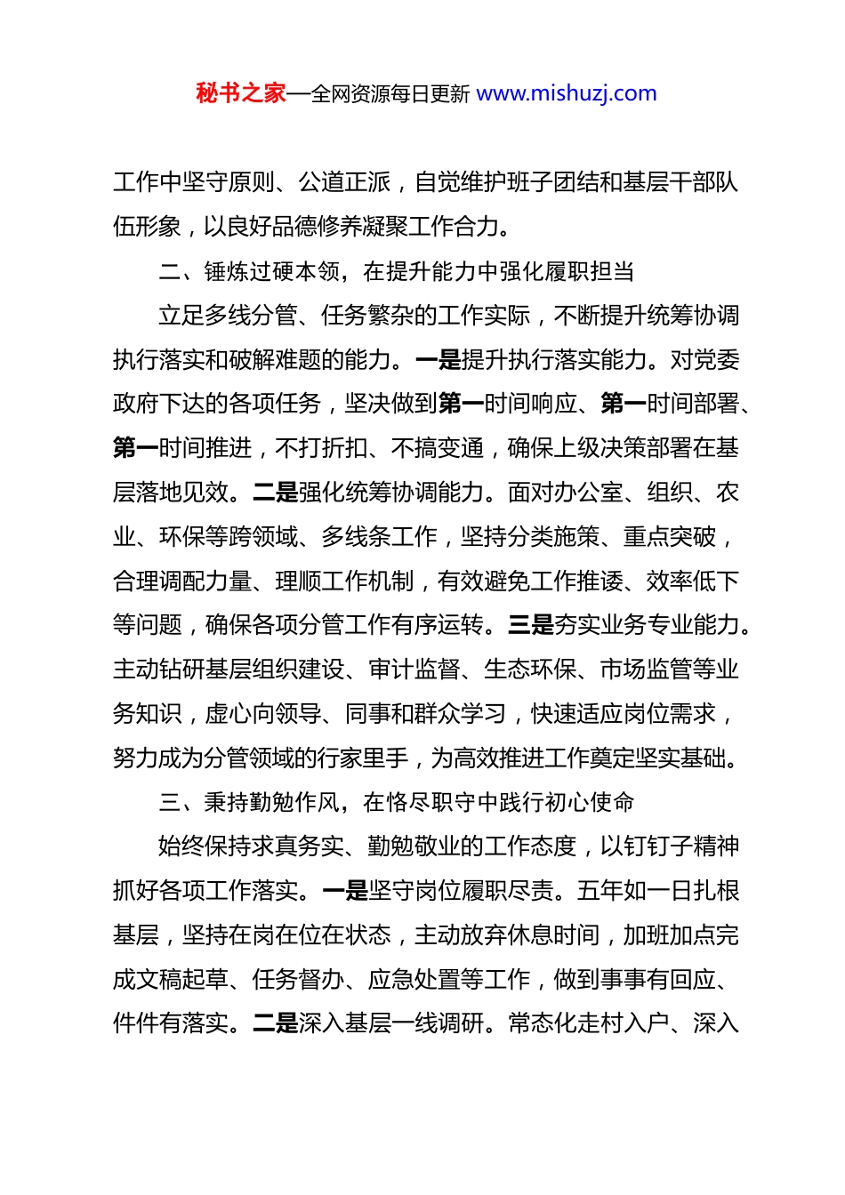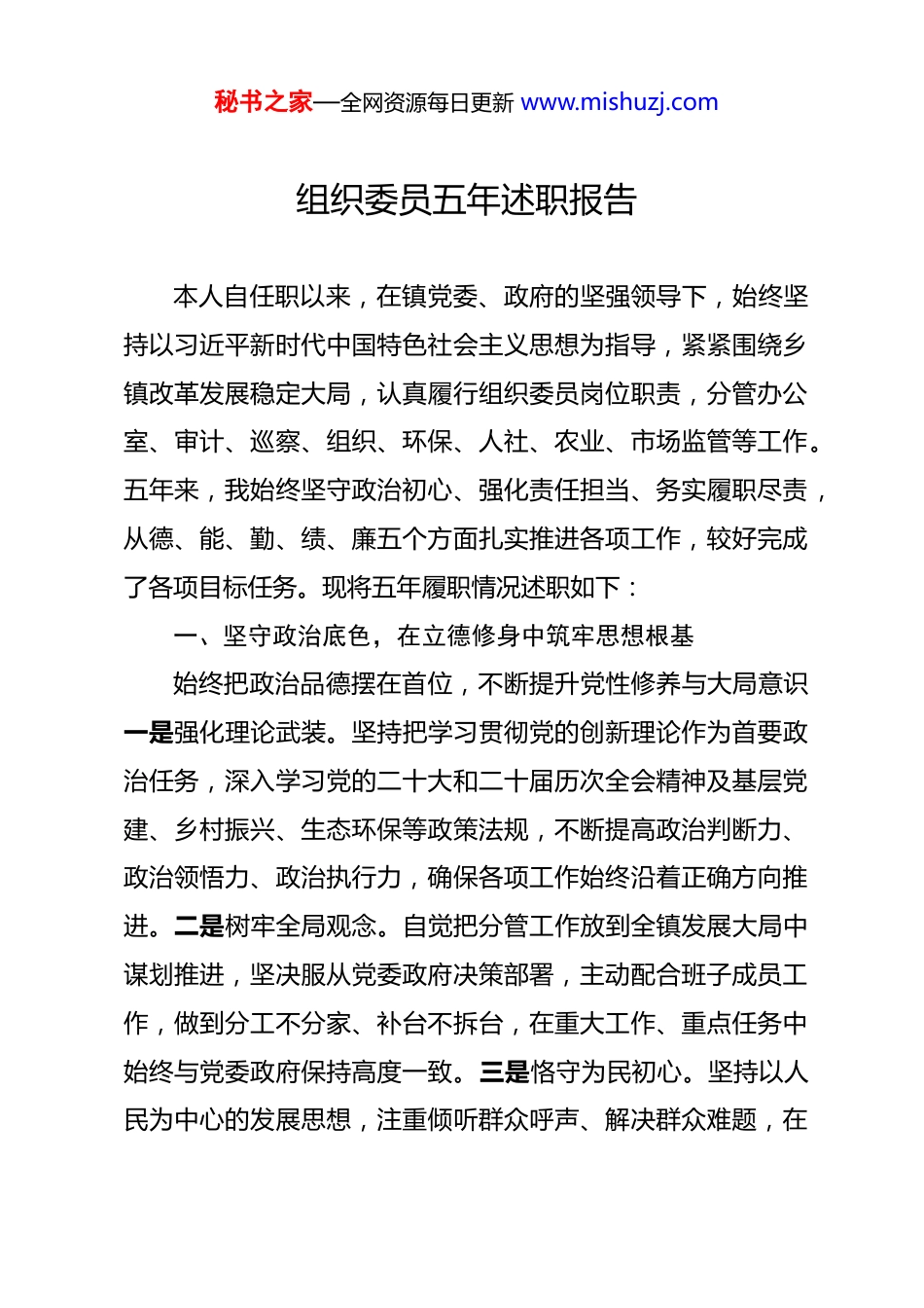 秘书之家—全网资源每日更新 www.mishuzj.com组织委员五年述职报告 本人自任职以来,在镇党委、政府的坚强领导下,始终坚持以习近平新时代中国特色社会主义思想为指导,紧紧围绕乡镇改革发展稳定大局,认真履行组织委员岗位职责,分管办公室、审计、巡察、组织、环保、人社、农业、市场监管等工作。五年来,我始终坚守政治初心、强化责任担当、务实履职尽责,从德、能、勤、绩、廉五个方面扎实推进各项工作,较好完成了各项目标任务。现将五年履职情况述职如下:一、坚守政治底色,在立德修身中筑牢思想根基始终把政治品德摆在首位,不断提升党性修养与大局意识一是强化理论武装。坚持把学习贯彻党的创新理论作为首要政治任务,深入学习党的二十大和二十届历次全会精神及基层党建、乡村振兴、生态环保等政策法规,不断提高政治判断力、政治领悟力、政治执行力,确保各项工作始终沿着正确方向推进。二是树牢全局观念。自觉把分管工作放到全镇发展大局中谋划推进,坚决服从党委政府决策部署,主动配合班子成员工作,做到分工不分家、补台不拆台,在重大工作、重点任务中始终与党委政府保持高度一致。三是恪守为民初心。坚持以人民为中心的发展思想,注重倾听群众呼声、解决群众难题,在秘书之家—全网资源每日更新 www.mishuzj.com工作中坚守原则、公道正派,自觉维护班子团结和基层干部队伍形象,以良好品德修养凝聚工作合力。二、锤炼过硬本领,在提升能力中强化履职担当立足多线分管、任务繁杂的工作实际,不断提升统筹协调执行落实和破解难题的能力。一是提升执行落实能力。对党委政府下达的各项任务,坚决做到第一时间响应、第一时间部署、第一时间推进,不打折扣、不搞变通,确保上级决策部署在基层落地见效。二是强化统筹协调能力。面对办公室、组织、农业、环保等跨领域、多线条工作,坚持分类施策、重点突破,合理调配力量、理顺工作机制,有效避免工作推诿、效率低下等问题,确保各项分管工作有序运转。三是夯实业务专业能力。主动钻研基层组织建设、审计监督、生态环保、市场监管等业务知识,虚心向领导、同事和群众学习,快速适应岗位需求,努力成为分管领域的行家里手,为高效推进工作奠定坚实基础。三、秉持勤勉作风,在恪尽职守中践行初心使命始终保持求真务实、勤勉敬业的工作态度,以钉钉子精神抓好各项工作落实。一是坚守岗位履职尽责。五年如一日扎根基层,坚持在岗在位在状态,主动放弃休息时间,加班加点完成文稿起草、任务督办、应急处置等工作,做到事事有回应、件件有落实。二是深入基层一线调研。常态化走村入户、深入秘书之家—全网资源每日更新 www.mishuzj.com田间地头、企业门店,精准掌握基层党建、农业生产、人社服务、环保整治等实际情况,及时发现问题、解决问题,让工作更贴合基层实际、更贴合群众需求。三是勇于担当主动作为。面对繁重工作任务,不推诿、不退缩,始终以饱满的热情投入工作,以务实作风推动分管领域工作提质增效。四、聚焦实干实效,在争先创优中彰显工作业绩五年来,紧扣全镇中心工作,聚焦分管领域重点任务,狠抓落实、大胆创新,在完成常规工作的同时,全力攻坚急难险重任务,取得扎实成效。在组织工作上,抓实基层党建提质增效,规范基层党组织生活,优化村(社区)班子队伍结构,发展培育优秀党员,推进村级集体经济发展,夯实基层战斗堡垒,为全镇发展提供坚强组织保障。在办公室工作上,强化政务运转、后勤保障、文稿服务、督查督办职能,规范办文办会办事流程,提升机关行政效能,当好党委政府的“坚强前哨”和“巩固后院”在审计、巡察工作上,严格落实审计监督职责,紧盯村级财务、项目资金、惠民政策落实等关键环节,强化风险防控;扎实推进巡察反馈问题整改,建立长效机制,以监督实效规范权力运行、改进工作作风。在生态环保工作上,坚决扛起生态环保政治责任,推进污染防治、人居环境整治、秸秆禁烧、水源保护等工作,常态化开展巡查整治,持续改善镇村秘书之家—全网资源每日更新 www.mishuzj.com生态环境。在人社工作上,扎实做好就业帮扶、社保扩面、劳动维权、养老认证等工作,精准落实惠民政策,切实保障...