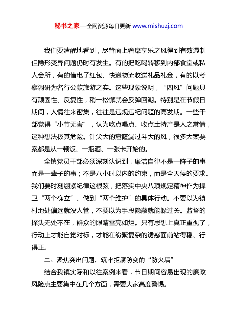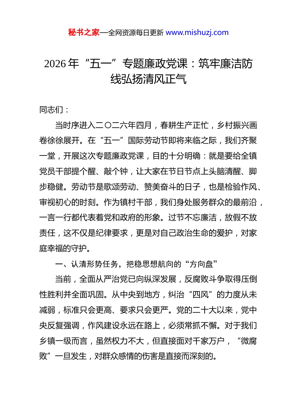 秘书之家—全网资源每日更新 www.mishuzj.com2026 年“五一”专题廉政党课:筑牢廉洁防线弘扬清风正气 同志们:当时序进入二〇二六年四月,春耕生产正忙,乡村振兴画卷徐徐展开。在“五一”国际劳动节即将来临之际,我们齐聚一堂,开展这次专题廉政党课,目的十分明确:就是要给全镇党员干部提个醒、敲个钟,让大家在节日节点上头脑清醒、脚步稳健。劳动节是歌颂劳动、赞美奋斗的日子,也是检验作风、审视初心的时刻。作为镇村干部,我们身处服务群众的最前沿,一言一行都代表着党和政府的形象。过节不忘廉洁,放假不放责任,这不仅是纪律要求,更是对自己政治生命的爱护,对家庭幸福的守护。一、认清形势任务,把稳思想航向的“方向盘”当前,全面从严治党已向纵深发展,反腐败斗争取得压倒性胜利并全面巩固。从中央到地方,纠治“四风”的力度从未减弱,标准只会更高、要求只会更严。党的二十大以来,党中央反复强调,作风建设永远在路上,必须常抓不懈。对于我们乡镇一级而言,虽然权力不大,但直接面对千家万户,“微腐败”一旦发生,对群众感情的伤害是直接而深刻的。秘书之家—全网资源每日更新 www.mishuzj.com我们要清醒地看到,尽管面上奢靡享乐之风得到有效遏制但隐形变异问题仍时有发生。有的把吃喝转移到内部食堂或私人会所,有的借电子红包、快递物流收送礼品礼金,有的以考察调研为名行公款旅游之实。这些现象说明,“四风”问题具有顽固性、反复性,稍一松懈就会反弹回潮。特别是在节假日期间,人情往来密集,往往是违规违纪问题的高发期。一些干部觉得“小节无害”,认为吃点喝点、收点土特产是人之常情,这种想法极其危险。针尖大的窟窿漏过斗大的风,很多大案要案都是从一顿饭、一瓶酒、一张卡开始的。全镇党员干部必须深刻认识到,廉洁自律不是一阵子的事而是一辈子的事;不是八小时以内的约束,而是全天候的要求。我们要时刻绷紧纪律这根弦,把落实中央八项规定精神作为捍卫“两个确立”、做到“两个维护”的具体行动。不要以为镇村地处偏远就没人管,不要以为手段隐蔽就能躲过关。监督的探头无处不在,群众的眼睛雪亮如炬。只有思想上真正重视了,行动上才能自觉对标,才能在纷繁复杂的诱惑面前站得稳、行得正。二、聚焦突出问题,筑牢拒腐防变的“防火墙”结合我镇实际和以往案例来看,节日期间容易出现的廉政风险点主要集中在几个方面,需要大家高度警惕。秘书之家—全网资源每日更新 www.mishuzj.com一是违规吃喝问题禁而不绝。有的干部借节日之名,组织或参与老乡会、校友会、战友会,搞小圈子聚会,费用则由老板或下属承担;有的在公务接待中超标准、超范围,甚至虚列开支套取资金用于吃喝。这种行为不仅浪费国家资财,更败坏了党风政风。我们要明白,饭局往往是围猎的开始,推杯换盏之间,原则立场就容易松动,底线红线就容易失守。二是违规收送礼品礼金花样翻新。随着科技发展,送礼方式更加隐蔽。除了传统的现金、购物卡,现在出现了电子红包、提货券、名贵特产等新型载体。有的干部觉得收点微信红包神不知鬼不觉,殊不知数据留痕,一查一个准。还有的打着“礼尚往来”的旗号,收受管理服务对象的贵重物品,实质上是权钱交易的变种。无论形式如何变化,其本质都是利用职权谋取私利,都必须坚决杜绝。三是公车私用和私车公养问题偶有发生。节日期间,有的干部私自驾驶公车探亲访友、游玩购物,有的将私家车加油费、维修费拿到单位报销。这些行为看似小事,实则反映了特权思想和侥幸心理。公车姓“公”,一分一毫都不能私用;公款姓“公”,一针一线都不能私占。四是形式主义、官僚主义依然存在。有的干部节日期间值班值守不到位,电话打不通、人找不到;有的对群众反映的问秘书之家—全网资源每日更新 www.mishuzj.com题推诿扯皮,态度生硬冷横;有的下基层走马观花,只挂号不看病,解决不了实际问题。这种作风问题,同样损害党群干群关系,必须引起高度重视。针对这些问题,全镇上下要开展自查自纠,举一反三,查漏补缺。各党支部要召开专题会议,传达上级精神,剖析典型案例,让每一位党员都红脸出汗、知止存畏。镇纪委将加大监督检查力度,采...