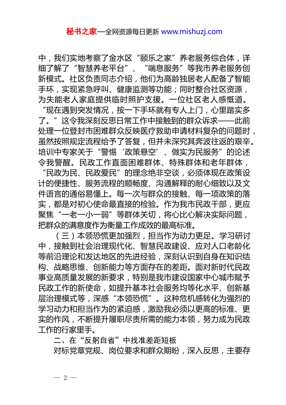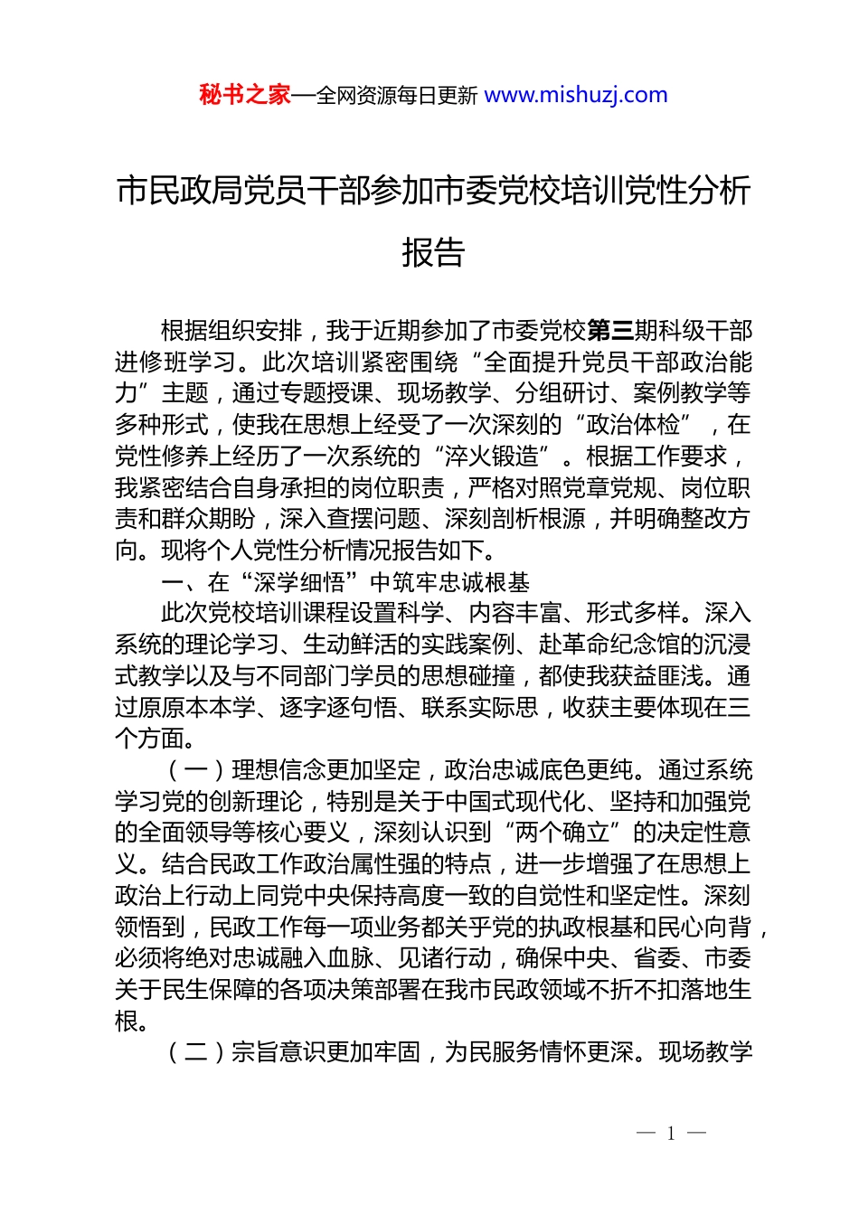 秘书之家—全网资源每日更新 www.mishuzj.com市民政局党员干部参加市委党校培训党性分析报告根据组织安排,我于近期参加了市委党校第三期科级干部进修班学习。此次培训紧密围绕“全面提升党员干部政治能力”主题,通过专题授课、现场教学、分组研讨、案例教学等多种形式,使我在思想上经受了一次深刻的“政治体检”,在党性修养上经历了一次系统的“淬火锻造”。根据工作要求,我紧密结合自身承担的岗位职责,严格对照党章党规、岗位职责和群众期盼,深入查摆问题、深刻剖析根源,并明确整改方向。现将个人党性分析情况报告如下。一、在“深学细悟”中筑牢忠诚根基此次党校培训课程设置科学、内容丰富、形式多样。深入系统的理论学习、生动鲜活的实践案例、赴革命纪念馆的沉浸式教学以及与不同部门学员的思想碰撞,都使我获益匪浅。通过原原本本学、逐字逐句悟、联系实际思,收获主要体现在三个方面。(一)理想信念更加坚定,政治忠诚底色更纯。通过系统学习党的创新理论,特别是关于中国式现代化、坚持和加强党的全面领导等核心要义,深刻认识到“两个确立”的决定性意义。结合民政工作政治属性强的特点,进一步增强了在思想上政治上行动上同党中央保持高度一致的自觉性和坚定性。深刻领悟到,民政工作每一项业务都关乎党的执政根基和民心向背,必须将绝对忠诚融入血脉、见诸行动,确保中央、省委、市委关于民生保障的各项决策部署在我市民政领域不折不扣落地生根。(二)宗旨意识更加牢固,为民服务情怀更深。现场教学— 1 —秘书之家—全网资源每日更新 www.mishuzj.com中,我们实地考察了金水区“颐乐之家”养老服务综合体,详细了解了“智慧养老平台”、“喘息服务”等我市养老服务创新模式。社区负责同志介绍,他们为高龄独居老人配备了智能手环,实现紧急呼叫、健康监测等功能;同时整合社区资源,为失能老人家庭提供临时照护支援。一位社区老人感慨道。“现在遇到突发情况,按一下手环就有专人上门,心里踏实多了。”这令我深刻反思日常工作中接触到的群众诉求——此前处理一位登封市困难群众反映医疗救助申请材料复杂的问题时,虽然按照规定流程给予了答复,但并未深究其奔波往返的艰辛。培训中专家关于“警惕‘政策悬空’、做实为民服务”的论述令我警醒。民政工作直面困难群体、特殊群体和老年群体,“民政为民、民政爱民”的理念绝非空谈,必须体现在政策设计的便捷性、服务流程的顺畅度、沟通解释的耐心细致以及文件语言的通俗易懂上。每一次与群众的接触、每一项政策的落实,都是对初心使命最直接的检验。作为我市民政干部,更应聚焦“一老一小一弱”等群体关切,将心比心解决实际问题,把群众的满意度作为衡量工作成效的最高标准。(三)本领恐慌更加强烈,担当作为动力更足。学习研讨中,接触到社会治理现代化、智慧民政建设、应对人口老龄化等前沿理论和发达地区的先进经验,深刻认识到自身在知识结构、战略思维、创新能力等方面存在的差距。面对新时代民政事业高质量发展的新要求,特别是我市建设国家中心城市赋予民政工作的新使命,如提升基本社会服务均等化水平、创新基层治理模式等,深感“本领恐慌”。这种危机感转化为强烈的学习动力和担当作为的紧迫感,激励我必须以更高的标准、更实的作风,不断提升履职尽责所需的能力本领,努力成为民政工作的行家里手。二、在“反躬自省”中找准差距短板对标党章党规、岗位要求和群众期盼,深入反思,主要存— 2 —秘书之家—全网资源每日更新 www.mishuzj.com在以下四个方面问题。(一)理论武装深度不足,学用转化存在“断点”。虽然能够按要求参加学习,但在理论学习的系统性和穿透力上还有欠缺。主要表现在将党的创新理论,特别是关于民生保障、社会治理的最新部署,与新郑市、惠济区等城乡结合部社区治理难点、巩义市山区养老服务供给不足等我市情结合不够紧密,运用理论指导实践破解难题的能力有待提升。(二)宗旨践行尚有温差,主动服务意识不够强。“以人民为中心”的发展思想树得不够牢固,服务群众有时存在“被动响应多、主动发现少”的情况。主要表现在有时满足于完成上级交办任务或例行性工作,...