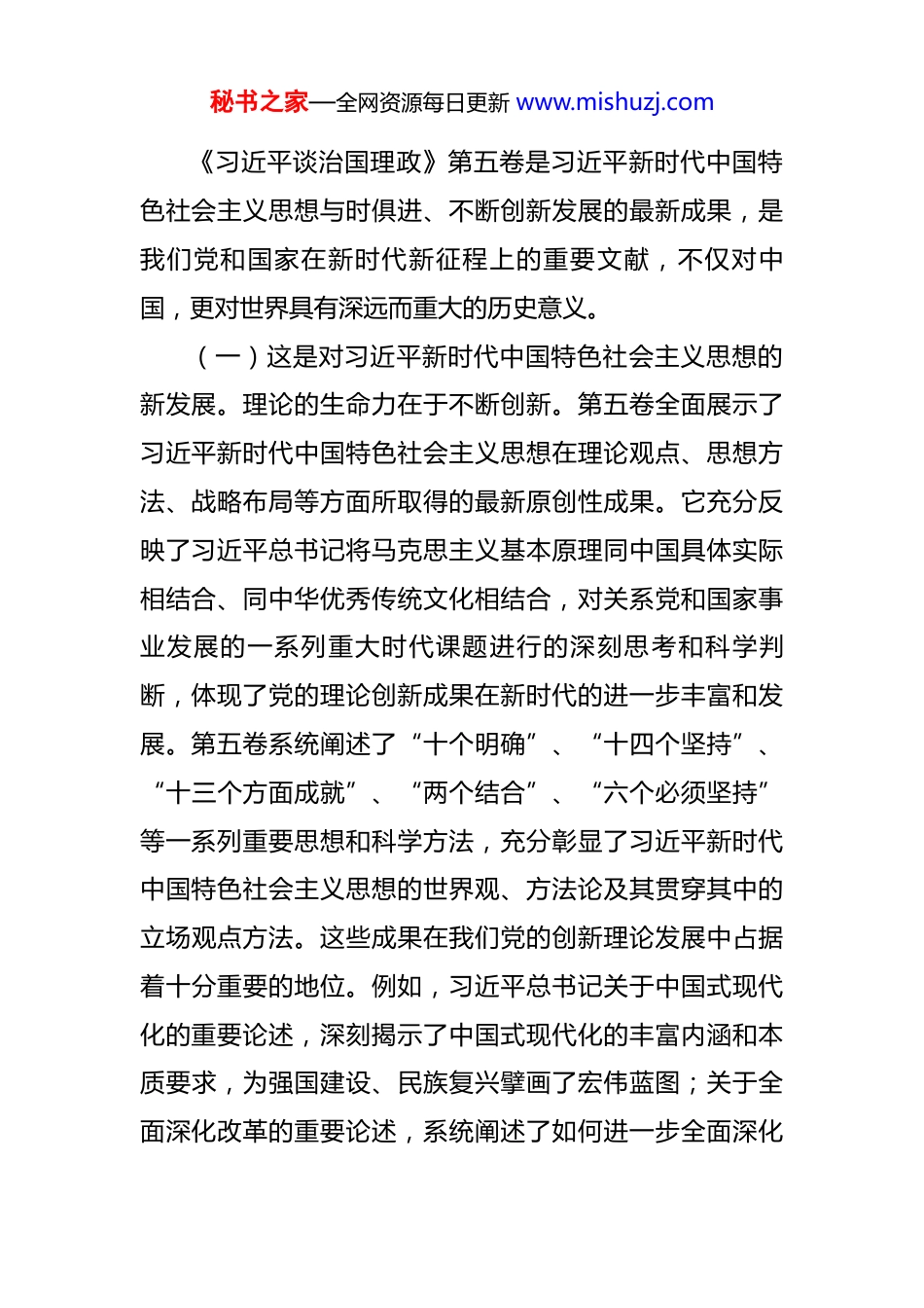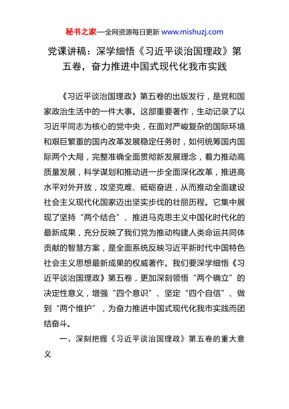 秘书之家—全网资源每日更新 www.mishuzj.com党课讲稿:深学细悟《习近平谈治国理政》第五卷,奋力推进中国式现代化我市实践 《习近平谈治国理政》第五卷的出版发行,是党和国家政治生活中的一件大事。这部重要著作,生动记录了以习近平同志为核心的党中央,在面对严峻复杂的国际环境和艰巨繁重的国内改革发展稳定任务时,如何统筹国内国际两个大局,完整准确全面贯彻新发展理念,着力推动高质量发展,科学谋划和推动进一步全面深化改革,推进高水平对外开放,攻坚克难、砥砺奋进,从而推动全面建设社会主义现代化国家迈出坚实步伐的壮丽历程。它集中展现了坚持“两个结合”、推进马克思主义中国化时代化的最新成果,充分反映了我们党为推动构建人类命运共同体贡献的智慧方案,是全面系统反映习近平新时代中国特色社会主义思想最新成果的权威著作。我们要深学细悟《习近平谈治国理政》第五卷,更加深刻领悟“两个确立”的决定性意义,增强“四个意识”、坚定“四个自信”、做到“两个维护”,为奋力推进中国式现代化我市实践而团结奋斗。一、深刻把握《习近平谈治国理政》第五卷的重大意义秘书之家—全网资源每日更新 www.mishuzj.com《习近平谈治国理政》第五卷是习近平新时代中国特色社会主义思想与时俱进、不断创新发展的最新成果,是我们党和国家在新时代新征程上的重要文献,不仅对中国,更对世界具有深远而重大的历史意义。(一)这是对习近平新时代中国特色社会主义思想的新发展。理论的生命力在于不断创新。第五卷全面展示了习近平新时代中国特色社会主义思想在理论观点、思想方法、战略布局等方面所取得的最新原创性成果。它充分反映了习近平总书记将马克思主义基本原理同中国具体实际相结合、同中华优秀传统文化相结合,对关系党和国家事业发展的一系列重大时代课题进行的深刻思考和科学判断,体现了党的理论创新成果在新时代的进一步丰富和发展。第五卷系统阐述了“十个明确”、“十四个坚持”、“十三个方面成就”、“两个结合”、“六个必须坚持”等一系列重要思想和科学方法,充分彰显了习近平新时代中国特色社会主义思想的世界观、方法论及其贯穿其中的立场观点方法。这些成果在我们党的创新理论发展中占据着十分重要的地位。例如,习近平总书记关于中国式现代化的重要论述,深刻揭示了中国式现代化的丰富内涵和本质要求,为强国建设、民族复兴擘画了宏伟蓝图;关于全面深化改革的重要论述,系统阐述了如何进一步全面深化秘书之家—全网资源每日更新 www.mishuzj.com改革、扩大高水平对外开放、因地制宜发展新质生产力、大力发展全过程人民民主、建设更高水平的法治中国、发展新时代中国特色社会主义文化等重大问题,展现了国家治理体系和治理能力现代化的战略规划与具体路径,为全面建设社会主义现代化国家提供了根本遵循。(二)这是对马克思主义基本理论的新发展。党的二十大提出开辟马克思主义中国化时代化新境界的重大任务,强调这是当代中国共产党人的庄严历史责任。第五卷收入的重要著作,正是我们党在坚持马克思主义这个立党立国、兴党兴国的根本指导思想的基础上,以全新视野对共产党执政规律、社会主义建设规律、人类社会发展规律作出的新的深刻揭示。它充分彰显了马克思主义的科学性、真理性,继承了马克思主义的人民性、实践性,反映了马克思主义的开放性、时代性。第五卷对众多标识性概念、原理性成果的系统阐释,在马克思主义哲学、政治经济学、科学社会主义各个领域都作出了重大原创性贡献。该卷深刻阐述“两个结合”的丰富内涵和实践要求,全面呈现我们党对辩证唯物主义和历史唯物主义的发展运用,体现了我们党对马克思主义中国化时代化基本规律认识的不断深化;系统论述中国式现代化理论,并与第一卷至第四卷一脉相承、深化发展,全面展示了党的二十大以来我秘书之家—全网资源每日更新 www.mishuzj.com们党推进中国式现代化的理论突破、实践成就和世界意义,极大地丰富了马克思主义现代化理论,深化了对社会主义建设规律的认识;详细阐释进一步全面深化改革中的若干重大理论和实践问题,继承和发展了马克思主义关于社会发展动力理论,体现了...