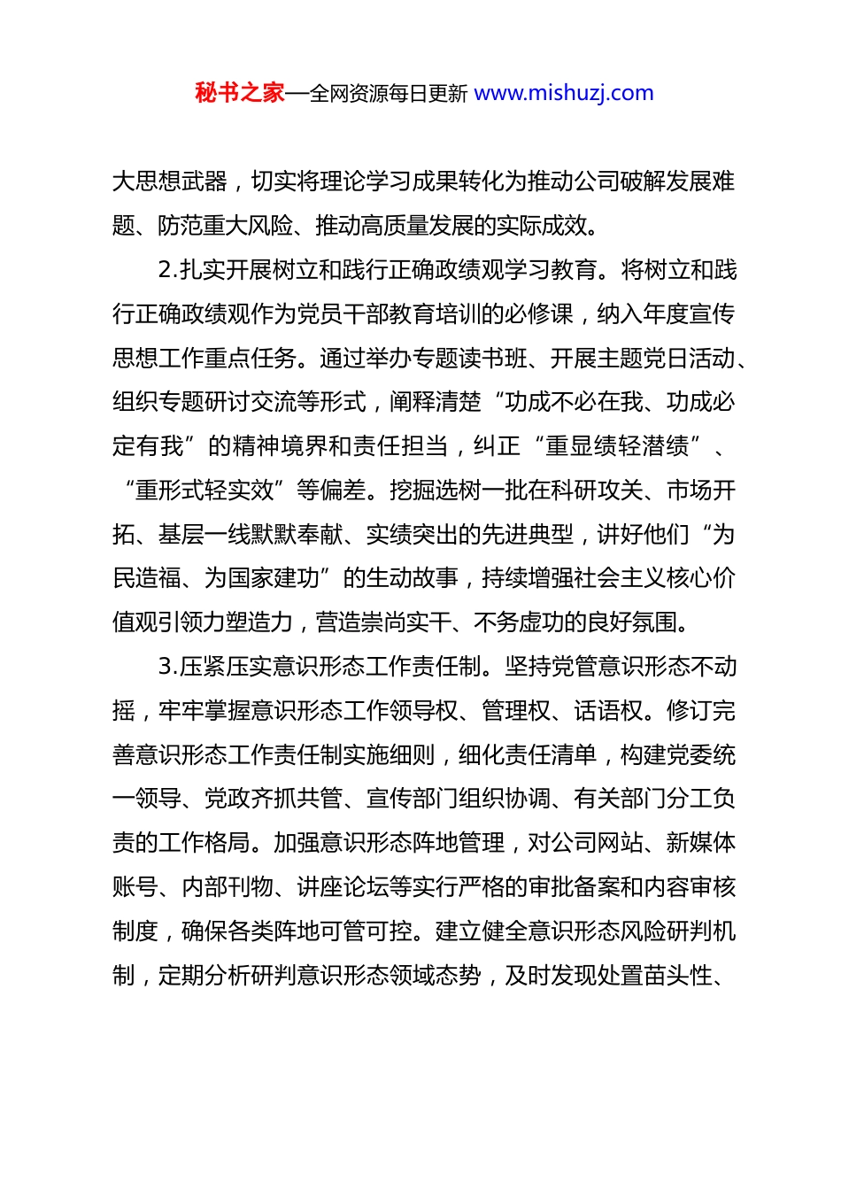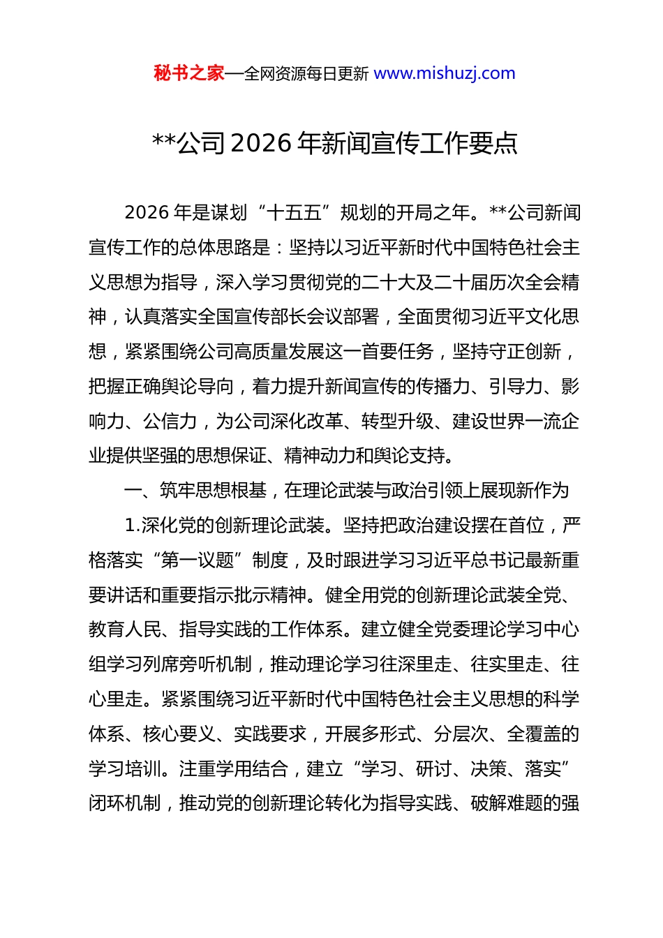 秘书之家—全网资源每日更新 www.mishuzj.com**公司 2026 年新闻宣传工作要点2026 年是谋划“十五五”规划的开局之年。**公司新闻宣传工作的总体思路是:坚持以习近平新时代中国特色社会主义思想为指导,深入学习贯彻党的二十大及二十届历次全会精神,认真落实全国宣传部长会议部署,全面贯彻习近平文化思想,紧紧围绕公司高质量发展这一首要任务,坚持守正创新,把握正确舆论导向,着力提升新闻宣传的传播力、引导力、影响力、公信力,为公司深化改革、转型升级、建设世界一流企业提供坚强的思想保证、精神动力和舆论支持。一、筑牢思想根基,在理论武装与政治引领上展现新作为1.深化党的创新理论武装。坚持把政治建设摆在首位,严格落实“第一议题”制度,及时跟进学习习近平总书记最新重要讲话和重要指示批示精神。健全用党的创新理论武装全党、教育人民、指导实践的工作体系。建立健全党委理论学习中心组学习列席旁听机制,推动理论学习往深里走、往实里走、往心里走。紧紧围绕习近平新时代中国特色社会主义思想的科学体系、核心要义、实践要求,开展多形式、分层次、全覆盖的学习培训。注重学用结合,建立“学习、研讨、决策、落实”闭环机制,推动党的创新理论转化为指导实践、破解难题的强秘书之家—全网资源每日更新 www.mishuzj.com大思想武器,切实将理论学习成果转化为推动公司破解发展难题、防范重大风险、推动高质量发展的实际成效。2.扎实开展树立和践行正确政绩观学习教育。将树立和践行正确政绩观作为党员干部教育培训的必修课,纳入年度宣传思想工作重点任务。通过举办专题读书班、开展主题党日活动、组织专题研讨交流等形式,阐释清楚“功成不必在我、功成必定有我”的精神境界和责任担当,纠正“重显绩轻潜绩”、“重形式轻实效”等偏差。挖掘选树一批在科研攻关、市场开拓、基层一线默默奉献、实绩突出的先进典型,讲好他们“为民造福、为国家建功”的生动故事,持续增强社会主义核心价值观引领力塑造力,营造崇尚实干、不务虚功的良好氛围。3.压紧压实意识形态工作责任制。坚持党管意识形态不动摇,牢牢掌握意识形态工作领导权、管理权、话语权。修订完善意识形态工作责任制实施细则,细化责任清单,构建党委统一领导、党政齐抓共管、宣传部门组织协调、有关部门分工负责的工作格局。加强意识形态阵地管理,对公司网站、新媒体账号、内部刊物、讲座论坛等实行严格的审批备案和内容审核制度,确保各类阵地可管可控。建立健全意识形态风险研判机制,定期分析研判意识形态领域态势,及时发现处置苗头性、秘书之家—全网资源每日更新 www.mishuzj.com倾向性问题,加强网络文明建设,提高网络生态治理效能,坚决维护意识形态安全。4.加强改进思想政治工作。坚持解决思想问题与解决实际问题相结合,建立健全职工思想动态分析报告制度。针对公司改革重组、业务调整、薪酬变动等敏感时期,深入基层一线开展调查研究,精准把握员工思想脉搏,做好政策解读和情绪疏导工作。着力提升思想政治工作能力和水平,深化“****”主题教育,编写形势任务教育宣讲提纲,组建宣讲团深入车间班组开展面对面宣讲,引导广大员工认清形势、明确任务,把思想和行动统一到公司决策部署上来。二、厚植文化底蕴,在文化传承与品牌塑造上实现新提升5.构建具有时代特色的企业文化体系。立足公司发展新阶段,对企业核心价值理念进行迭代升级,凝练符合行业特点、体现国企担当、具有鲜明时代特征的企业使命、愿景和价值观。开展企业文化“铸魂”工程,编印新版《企业文化手册》和《员工行为规范》,将文化理念转化为员工的行为自觉。深化文化体制机制改革,发展新型文化业态,深入推进“法治、合规、诚信”文化建设,制定《商业道德行为准则》,强化全员合规意识,提升企业软实力。注重子文化建设,推动安全文化、秘书之家—全网资源每日更新 www.mishuzj.com廉洁文化、创新文化、服务文化与主体文化深度融合,形成百花齐放的文化生态。6.拓展企业文化传播载体与阵地。实施文化阵地提质工程,推进公司史馆、文化展厅、职工书屋等阵地建设,打造一批集教育、展示、交流于一体的文化地标。...