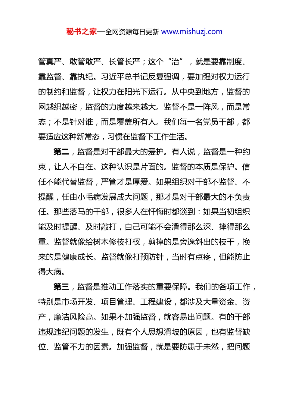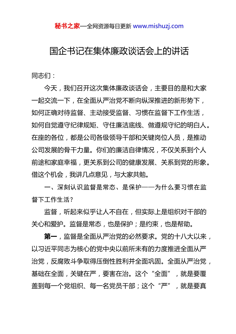 秘书之家—全网资源每日更新 www.mishuzj.com国企书记在集体廉政谈话会上的讲话 同志们:今天,我们召开这次集体廉政谈话会,主要目的是和大家一起交流一下,在全面从严治党不断向纵深推进的新形势下,如何正确对待监督、主动接受监督、习惯在监督下工作生活,如何自觉遵守纪律规矩、守住廉洁底线、做遵规守纪的明白人。在座的各位,都是公司各级领导干部和关键岗位人员,是推动公司发展的骨干力量。你们的廉洁自律情况,不仅关系到个人前途和家庭幸福,更关系到公司的健康发展、关系到党的形象。借这个机会,我讲几点意见,与大家共勉。一、深刻认识监督是常态、是保护——为什么要习惯在监督下工作生活?监督,听起来似乎让人不自在,但实际上是组织对干部的关心和爱护。监督是常态,也是保护;是约束,也是帮助。第一,监督是全面从严治党的必然要求。党的十八大以来,以习近平同志为核心的党中央以前所未有的力度推进全面从严治党,反腐败斗争取得压倒性胜利并全面巩固。全面从严治党,基础在全面,关键在严,要害在治。这个“全面”,就是要覆盖到每一个党组织、每一名党员干部;这个“严”,就是要真秘书之家—全网资源每日更新 www.mishuzj.com管真严、敢管敢严、长管长严;这个“治”,就是要靠制度、靠监督、靠执纪。习近平总书记反复强调,要加强对权力运行的制约和监督,让权力在阳光下运行。从中央到地方,监督的网越织越密,监督的力度越来越大。监督不是一阵风,而是常态;不是针对谁,而是覆盖所有人。我们每一名党员干部,都要适应这种新常态,习惯在监督下工作生活。第二,监督是对干部最大的爱护。有人说,监督是一种约束,让人不自在。这种认识是片面的。监督的本质是保护。信任不能代替监督,严管才是厚爱。如果组织对干部不监督、不提醒,任由小毛病发展成大问题,那才是对干部最大的不负责任。那些落马的干部,很多人在忏悔时都谈到:如果当初组织能及时提醒、及时敲打,自己可能不会滑得那么深、摔得那么重。监督就像给树木修枝打杈,剪掉的是旁逸斜出的枝干,换来的是健康成长。监督就像打预防针,当时有点疼,但能防止得大病。第三,监督是推动工作落实的重要保障。我们的各项工作,特别是市场开发、项目管理、工程建设,都涉及大量资金、资产,廉洁风险高。如果不加强监督,就容易出问题。有的干部违规违纪问题的发生,既有个人思想滑坡的原因,也有监督缺位、监管不力的因素。加强监督,就是要防患于未然,把问题秘书之家—全网资源每日更新 www.mishuzj.com消灭在萌芽状态;就是要规范权力运行,防止权力滥用;就是要推动工作落实,确保各项决策部署不折不扣执行到位。第四,监督是保持清正廉洁的重要防线。干部不是生活在真空中,社会上形形色色的诱惑无处不在。市场口的同志常年在外跑市场,与各种市场主体打交道,面临的各种诱惑更多。如果没有监督,缺乏约束,就很容易在诱惑面前迷失方向。监督就像一道堤坝,把各种诱惑和风险挡在外面;就像一道防火墙,把各种不良风气和腐败因素隔绝开来。有了这道防线,我们才能在各种考验面前站得稳、立得住、行得正。二、准确把握监督的内涵要求——监督到底监督什么?要习惯在监督下工作生活,首先要搞清楚监督到底监督什么。我认为,主要监督以下几个方面:第一,监督政治立场。政治纪律是最重要、最根本、最关键的纪律。监督首先要看政治立场是否坚定。是否深刻领悟“两个确立”的决定性意义,增强“四个意识”、坚定“四个自信”、做到“两个维护”?是否在思想上政治上行动上同党中央保持高度一致?是否认真贯彻落实党中央决策部署和上级党委工作要求?在市场工作中,是否把服务国家战略放在首位?在项目选择上,是否符合国家产业政策导向?在重大决策中,是否体现了政治担当?这些都要接受监督。秘书之家—全网资源每日更新 www.mishuzj.com第二,监督权力运行。权力是把双刃剑。用好了可以造福企业、成就自己;用不好就会伤人害己、追悔莫及。监督的重点,就是要看权力是否在阳光下运行。市场口的同志,手中握着项目资源,要监督是否按程序办事、按规矩办事。项目上的同志,管着物资采购,要监督...