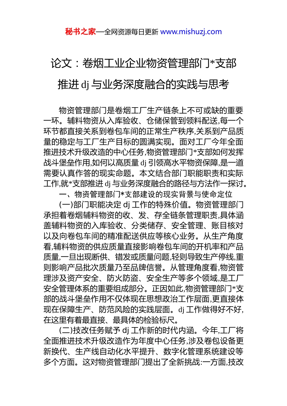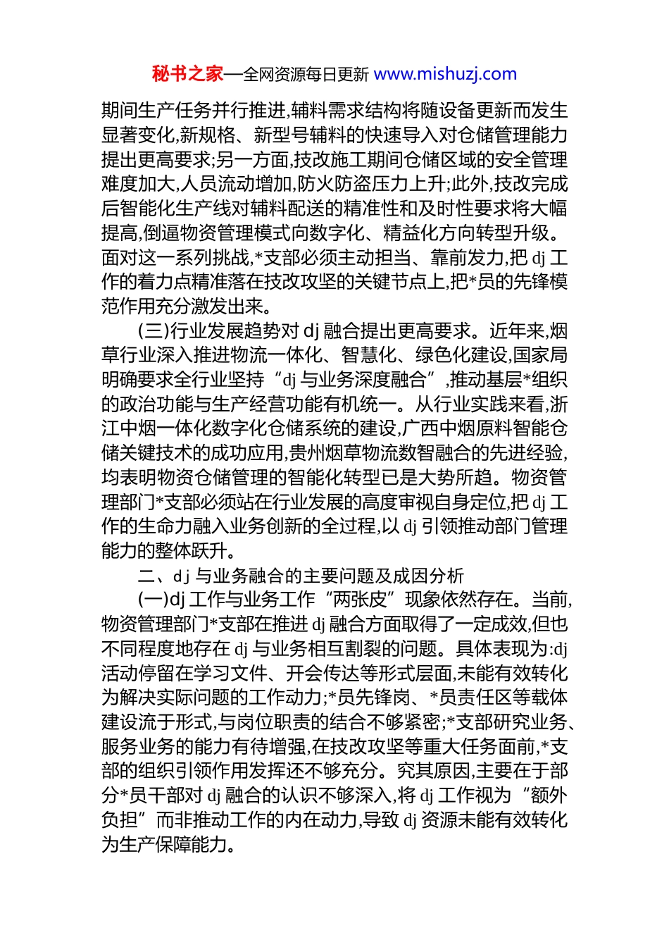 秘书之家—全网资源每日更新 www.mishuzj.com论文:卷烟工业企业物资管理部门*支部推进 dj 与业务深度融合的实践与思考物资管理部门是卷烟工厂生产链条上不可或缺的重要一环。辅料物资从入库验收、仓储保管到领料配送,每一个环节都直接关系到卷包车间的正常生产秩序,关系到产品质量的稳定与工厂生产目标的圆满实现。面对工厂今年全面推进技术升级改造的中心任务,物资管理部门*支部如何发挥战斗堡垒作用,如何以高质量 dj 引领高水平物资保障,是一道需要认真作答的现实命题。本文结合部门职能职责和实际工作,就*支部推进 dj 与业务深度融合的路径与方法作一探讨。一、物资管理部门*支部建设的现实背景与使命定位(一)部门职能决定 dj 工作的特殊价值。物资管理部门承担着卷烟辅料物资的收、发、存全链条管理职责,具体涵盖辅料物资的入库验收、分类储存、安全管理、账目核对以及向卷包车间的精准配送供应等核心业务。从生产角度看,辅料物资的供应质量直接影响卷包车间的开机率和产品质量,一旦出现断供、错发或质量问题,轻则导致生产停线,重则影响产品批次质量乃至品牌信誉。从管理角度看,物资管理涉及资产安全、防火防盗、安全生产等多个领域,是工厂安全管理体系的重要组成部分。正因如此,物资管理部门*支部的战斗堡垒作用不仅体现在思想政治工作层面,更直接体现在保障生产、防范风险的实践层面。dj 工作做得好不好,在这里有着最直接、最具体的检验标尺。(二)技改任务赋予 dj 工作新的时代内涵。今年,工厂将全面推进技术升级改造作为年度中心任务,涉及卷包设备更新换代、生产线自动化水平提升、数字化管理系统建设等多个方面。这对物资管理部门提出了全新挑战:一方面,技改秘书之家—全网资源每日更新 www.mishuzj.com期间生产任务并行推进,辅料需求结构将随设备更新而发生显著变化,新规格、新型号辅料的快速导入对仓储管理能力提出更高要求;另一方面,技改施工期间仓储区域的安全管理难度加大,人员流动增加,防火防盗压力上升;此外,技改完成后智能化生产线对辅料配送的精准性和及时性要求将大幅提高,倒逼物资管理模式向数字化、精益化方向转型升级。面对这一系列挑战,*支部必须主动担当、靠前发力,把 dj 工作的着力点精准落在技改攻坚的关键节点上,把*员的先锋模范作用充分激发出来。(三)行业发展趋势对 dj 融合提出更高要求。近年来,烟草行业深入推进物流一体化、智慧化、绿色化建设,国家局明确要求全行业坚持“dj 与业务深度融合”,推动基层*组织的政治功能与生产经营功能有机统一。从行业实践来看,浙江中烟一体化数字化仓储系统的建设,广西中烟原料智能仓储关键技术的成功应用,贵州烟草物流数智融合的先进经验,均表明物资仓储管理的智能化转型已是大势所趋。物资管理部门*支部必须站在行业发展的高度审视自身定位,把 dj 工作的生命力融入业务创新的全过程,以 dj 引领推动部门管理能力的整体跃升。二、dj 与业务融合的主要问题及成因分析(一)dj 工作与业务工作“两张皮”现象依然存在。当前,物资管理部门*支部在推进 dj 融合方面取得了一定成效,但也不同程度地存在 dj 与业务相互割裂的问题。具体表现为:dj活动停留在学习文件、开会传达等形式层面,未能有效转化为解决实际问题的工作动力;*员先锋岗、*员责任区等载体建设流于形式,与岗位职责的结合不够紧密;*支部研究业务、服务业务的能力有待增强,在技改攻坚等重大任务面前,*支部的组织引领作用发挥还不够充分。究其原因,主要在于部分*员干部对 dj 融合的认识不够深入,将 dj 工作视为“额外负担”而非推动工作的内在动力,导致 dj 资源未能有效转化为生产保障能力。秘书之家—全网资源每日更新 www.mishuzj.com(二)物资管理精益化水平与技改要求存在差距。从现实情况看,物资管理部门在精益管理方面仍有较大提升空间。一是库存管理精准度有待提高,辅料物资的动态需求预测能力不足,存在阶段性积压和短缺并存的问题;二是配送效率有待优化,向卷包车间的辅料配送主要依靠人工调度,信息化程度偏低,难以适应技改后高速生产线对精准准时配送的要求;三是安全管理体系有待完善,现有安全管理制度的执行力和动态...