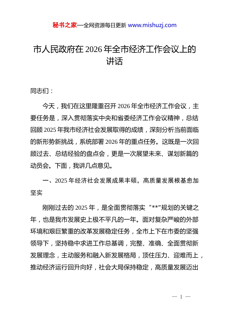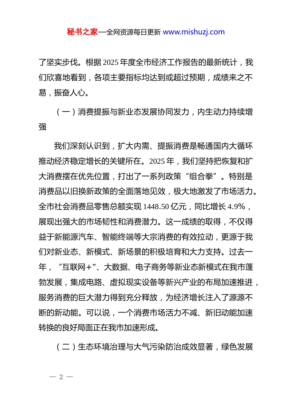 秘书之家—全网资源每日更新 www.mishuzj.com市人民政府在 2026 年全市经济工作会议上的讲话同志们:今天,我们在这里隆重召开 2026 年全市经济工作会议,主要任务是,深入贯彻落实中央和省委经济工作会议精神,总结回顾 2025 年我市经济社会发展取得的成绩,深刻分析当前面临的新形势新挑战,系统部署 2026 年的重点任务。这既是一次回顾过去、总结经验的盘点会,更是一次展望未来、谋划新篇的动员会。下面,我讲几点意见。一、2025 年经济社会发展成果丰硕,高质量发展根基愈加坚实刚刚过去的 2025 年,是全面贯彻落实“**”规划的关键之年,也是我市发展史上极不平凡的一年。面对复杂严峻的外部环境和艰巨繁重的改革发展稳定任务,全市上下在市委的坚强领导下,坚持稳中求进工作总基调,完整、准确、全面贯彻新发展理念,主动服务和融入新发展格局,顶住压力、迎难而上,推动经济运行回升向好,社会大局保持稳定,高质量发展迈出— 1 —秘书之家—全网资源每日更新 www.mishuzj.com了坚实步伐。根据 2025 年度全市经济工作报告的最新统计,我们欣喜地看到,各项主要指标均达到或超过预期,成绩来之不易,振奋人心。(一)消费提振与新业态发展协同发力,内生动力持续增强我们深刻认识到,扩大内需、提振消费是畅通国内大循环推动经济稳定增长的关键所在。2025 年,我们坚持把恢复和扩大消费摆在优先位置,打出了一系列政策“组合拳”。特别是消费品以旧换新政策的全面落地见效,极大地激发了市场活力。全市社会消费品零售总额实现 1448.50 亿元,同比增长 4.9%,展现出强大的市场韧性和消费潜力。这一成绩的取得,不仅得益于新能源汽车、智能终端等大宗消费的有效拉动,更源于我们对新业态、新模式、新场景的积极培育和大力支持。过去一年,“互联网+”、大数据、电子商务等新业态新模式在我市蓬勃发展,集成电路、虚拟现实设备等新兴产业的布局加速推进,服务消费的巨大潜力得到充分释放,为经济增长注入了源源不断的新动能。可以说,一个消费市场活力不减、新旧动能加速转换的良好局面正在我市加速形成。(二)生态环境治理与大气污染防治成效显著,绿色发展— 2 —秘书之家—全网资源每日更新 www.mishuzj.com底色更加鲜明绿水青山就是金山银山。我们始终坚持以生态文明思想为指导,以壮士断腕的决心打好污染防治攻坚战,推动生态环境质量持续改善。2025 年,我们坚持减排放、治污染,在发展中保护,在保护中发展,生态环境渐清渐绿的趋势日益明显。全市 pm2.5 年均浓度成功降至 34 微克/立方米以下,实现了预定目标;优良天数比例进一步增加,人民群众的“蓝天幸福感”显著提升。同时,我们严格落实能耗“双控”目标,单位国内生产总值能耗预计降低 3.0%左右,这标志着我市的产业结构和能源结构正在向更加清洁、高效、可持续的方向优化。这些成绩表明,经济发展与环境保护完全可以做到相得益彰,绿色发展之路我们走对了,而且必须坚定不移地走下去。(三)民生保障与就业增收坚实有力,发展成果惠及于民发展的最终目的是为了人民。一年来,我们始终坚持以人民为中心的发展思想,将民生保障和就业增收作为一切工作的出发点和落脚点。面对就业市场的压力,我们千方百计稳岗位、促就业,全年实现城镇新增就业 10.3 万人,城镇登记失业率控制在较低水平,确保了就业形势总体稳定。在增收方面,我们统筹城乡发展,拓宽居民增收渠道,全市居民人均可支配收入— 3 —秘书之家—全网资源每日更新 www.mishuzj.com达到 42085 元,城乡居民收入差距持续缩小。同时,社会保障体系更加健全,教育、医疗、养老等基本公共服务水平稳步提升,“社区食堂”等惠民举措深受群众欢迎。这些实实在在的民生答卷,不仅温暖了民心,也为社会和谐稳定与经济持续发展奠定了坚实的基础。二、准确把握新征程上的机遇与挑战在肯定成绩的同时,我们必须清醒地认识到,前进的道路上并非一片坦途。对标高质量发展的更高要求,对表人民群众的更深期盼,我们工作中还存在一些短板和不足。例如,部分领域的消费潜力尚未完全激活,新业态对传统产业的带动作用有待进一步加...