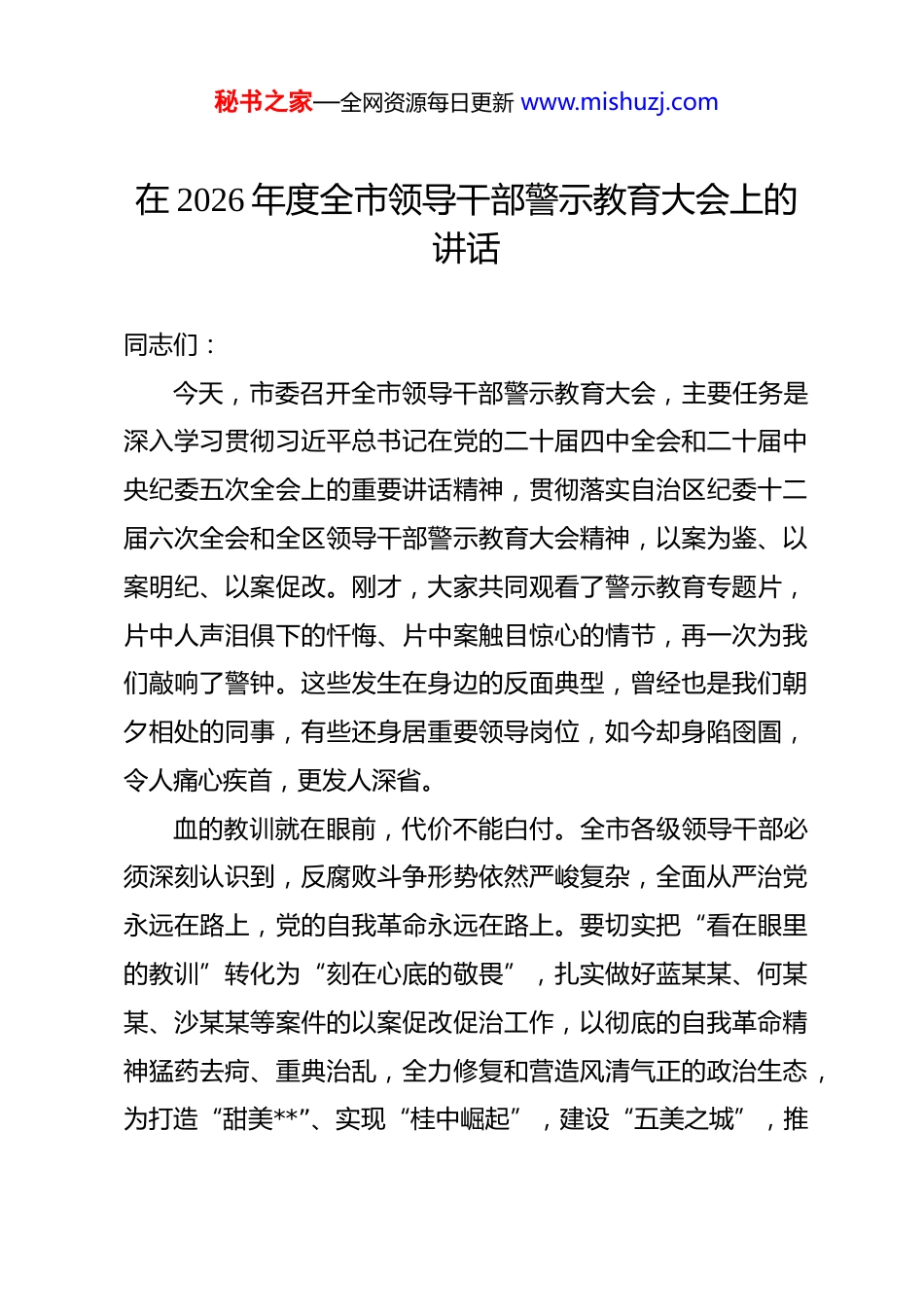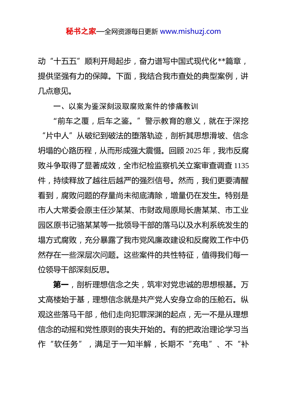 秘书之家—全网资源每日更新 www.mishuzj.com在 2026 年度全市领导干部警示教育大会上的讲话 同志们:今天,市委召开全市领导干部警示教育大会,主要任务是深入学习贯彻习近平总书记在党的二十届四中全会和二十届中央纪委五次全会上的重要讲话精神,贯彻落实自治区纪委十二届六次全会和全区领导干部警示教育大会精神,以案为鉴、以案明纪、以案促改。刚才,大家共同观看了警示教育专题片,片中人声泪俱下的忏悔、片中案触目惊心的情节,再一次为我们敲响了警钟。这些发生在身边的反面典型,曾经也是我们朝夕相处的同事,有些还身居重要领导岗位,如今却身陷囹圄,令人痛心疾首,更发人深省。血的教训就在眼前,代价不能白付。全市各级领导干部必须深刻认识到,反腐败斗争形势依然严峻复杂,全面从严治党永远在路上,党的自我革命永远在路上。要切实把“看在眼里的教训”转化为“刻在心底的敬畏”,扎实做好蓝某某、何某某、沙某某等案件的以案促改促治工作,以彻底的自我革命精神猛药去疴、重典治乱,全力修复和营造风清气正的政治生态,为打造“甜美**”、实现“桂中崛起”,建设“五美之城”,推秘书之家—全网资源每日更新 www.mishuzj.com动“十五五”顺利开局起步,奋力谱写中国式现代化**篇章,提供坚强有力的保障。下面,我结合我市查处的典型案例,讲几点意见。一、以案为鉴深刻汲取腐败案件的惨痛教训“前车之覆,后车之鉴。”警示教育的意义,就在于深挖“片中人”从破纪到破法的堕落轨迹,剖析其思想滑坡、信念坍塌的心路历程,从而形成强大震慑。回顾 2025 年,我市反腐败斗争取得了显著成效,全市纪检监察机关立案审查调查 1135件,持续释放了越往后越严的强烈信号。然而,我们更要清醒看到,腐败问题的存量尚未彻底清除,增量仍在发生。特别是市人大常委会原主任沙某某、市财政局原局长唐某某、市工业园区原书记骆某某等一批领导干部的落马以及水利系统发生的塌方式腐败,充分暴露了我市党风廉政建设和反腐败工作中仍然存在一些深层次问题。这些案件的共性特征,值得我们每一位领导干部深刻反思。第一,剖析理想信念之失,筑牢对党忠诚的思想根基。万丈高楼始于基,理想信念就是共产党人安身立命的压舱石。纵观这些落马干部,他们走向犯罪深渊的起点,无一不是从理想信念的动摇和党性原则的丧失开始的。有的把政治理论学习当作“软任务”,满足于一知半解,长期不“充电”、不“补秘书之家—全网资源每日更新 www.mishuzj.com钙”,导致精神上缺钙,最终得了“软骨病”,在重大原则问题上立场摇摆,在各种诱惑面前败下阵来。有的口头上高喊“两个维护”,实际上却言行不一、阳奉阴违,把党中央的决策部署和市委的工作要求当作耳旁风,合意的就执行,不合意的就打折扣、搞变通,甚至另搞一套。这种背离“两个维护”的行为,是对党纪国法的极大漠视,是性质最为严重的政治问题。全市领导干部必须把对党绝对忠诚作为首要政治品质,持续强化理论武装,在深学细悟笃行中增强政治判断力、政治领悟力、政治执行力,始终在思想上政治上行动上同以习近平同志为核心的党中央保持高度一致,做到党中央提倡的坚决响应、党中央决定的坚决执行、党中央禁止的坚决不做。第二,剖析纪律规矩之弛,守住清正廉洁的从政底线。“矩不正,不可为方;规不正,不可为圆。”纪律和规矩是从政的“护身符”,也是不可触碰的“高压线”。一些干部法纪意识淡薄,把党的纪律视若无物,把中央八项规定精神当作“稻草人”。他们认为吃几顿饭、收几份礼是“小事小节”,是“人情世故”,殊不知“堤溃蚁穴,气泄针芒”,正是从这些“小节”失守开始,一步步滑向了违纪违法的深渊。有的沉迷于觥筹交错,乐于接受管理服务对象的宴请,甚至发展到搞隐形变异的“一桌餐”;有的心存侥幸,对收受红包礼金习以秘书之家—全网资源每日更新 www.mishuzj.com为常,自欺欺人地认为是“礼尚往来”;有的追求奢靡享乐,在生活作风上不检点,最终被“围猎者”打开缺口,陷入腐败泥潭。事实反复证明,纪律的防线一旦被突破,腐败的洪水便会一泻千里。全市各级领导干部必须时刻绷紧纪律这根弦,把遵守党的政...