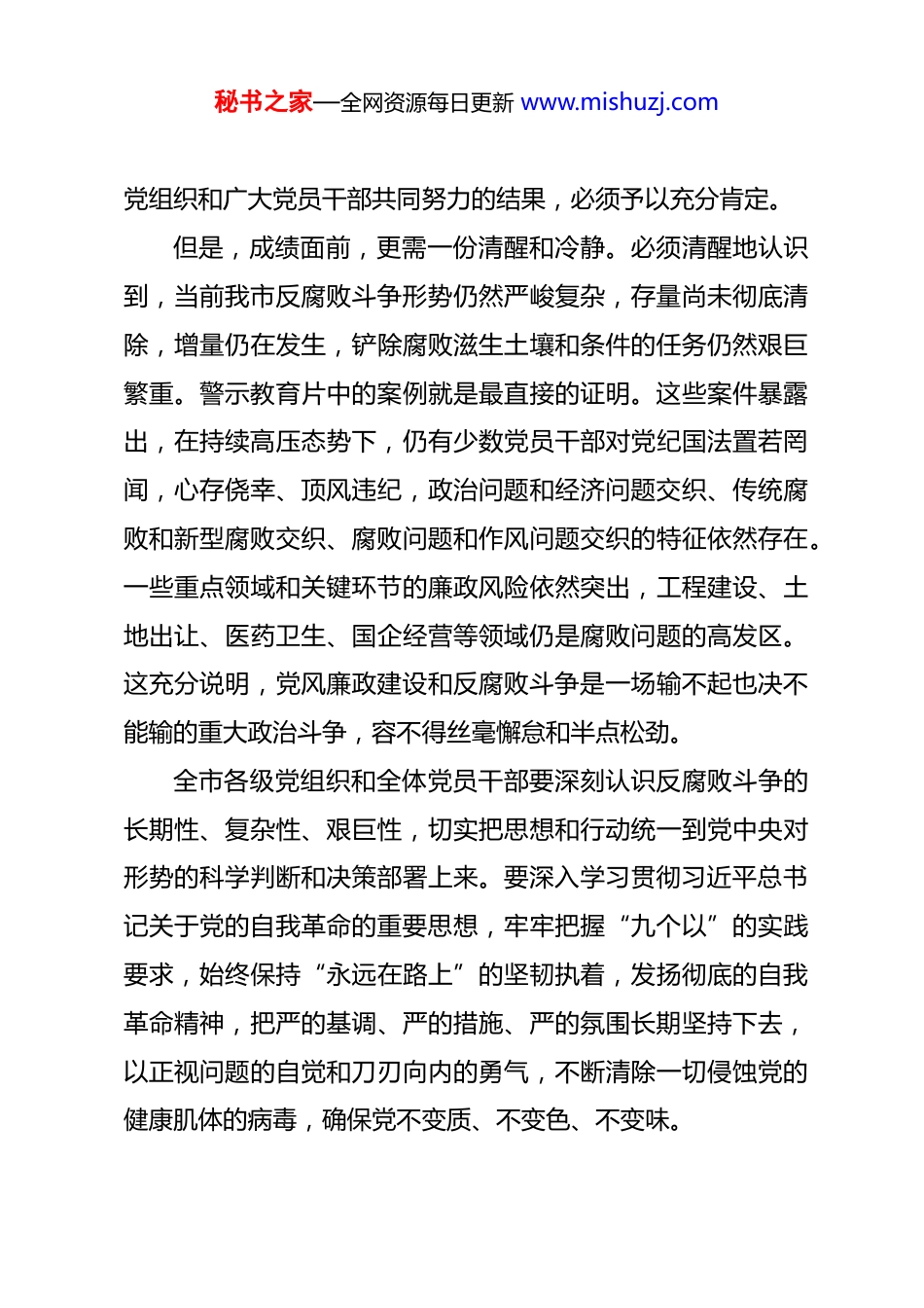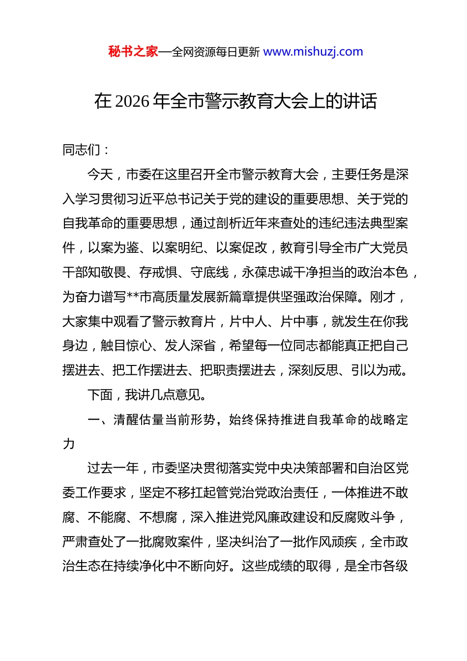 秘书之家—全网资源每日更新 www.mishuzj.com在 2026 年全市警示教育大会上的讲话 同志们:今天,市委在这里召开全市警示教育大会,主要任务是深入学习贯彻习近平总书记关于党的建设的重要思想、关于党的自我革命的重要思想,通过剖析近年来查处的违纪违法典型案件,以案为鉴、以案明纪、以案促改,教育引导全市广大党员干部知敬畏、存戒惧、守底线,永葆忠诚干净担当的政治本色,为奋力谱写**市高质量发展新篇章提供坚强政治保障。刚才,大家集中观看了警示教育片,片中人、片中事,就发生在你我身边,触目惊心、发人深省,希望每一位同志都能真正把自己摆进去、把工作摆进去、把职责摆进去,深刻反思、引以为戒。下面,我讲几点意见。一、清醒估量当前形势,始终保持推进自我革命的战略定力过去一年,市委坚决贯彻落实党中央决策部署和自治区党委工作要求,坚定不移扛起管党治党政治责任,一体推进不敢腐、不能腐、不想腐,深入推进党风廉政建设和反腐败斗争,严肃查处了一批腐败案件,坚决纠治了一批作风顽疾,全市政治生态在持续净化中不断向好。这些成绩的取得,是全市各级秘书之家—全网资源每日更新 www.mishuzj.com党组织和广大党员干部共同努力的结果,必须予以充分肯定。但是,成绩面前,更需一份清醒和冷静。必须清醒地认识到,当前我市反腐败斗争形势仍然严峻复杂,存量尚未彻底清除,增量仍在发生,铲除腐败滋生土壤和条件的任务仍然艰巨繁重。警示教育片中的案例就是最直接的证明。这些案件暴露出,在持续高压态势下,仍有少数党员干部对党纪国法置若罔闻,心存侥幸、顶风违纪,政治问题和经济问题交织、传统腐败和新型腐败交织、腐败问题和作风问题交织的特征依然存在。一些重点领域和关键环节的廉政风险依然突出,工程建设、土地出让、医药卫生、国企经营等领域仍是腐败问题的高发区。这充分说明,党风廉政建设和反腐败斗争是一场输不起也决不能输的重大政治斗争,容不得丝毫懈怠和半点松劲。全市各级党组织和全体党员干部要深刻认识反腐败斗争的长期性、复杂性、艰巨性,切实把思想和行动统一到党中央对形势的科学判断和决策部署上来。要深入学习贯彻习近平总书记关于党的自我革命的重要思想,牢牢把握“九个以”的实践要求,始终保持“永远在路上”的坚韧执着,发扬彻底的自我革命精神,把严的基调、严的措施、严的氛围长期坚持下去,以正视问题的自觉和刀刃向内的勇气,不断清除一切侵蚀党的健康肌体的病毒,确保党不变质、不变色、不变味。秘书之家—全网资源每日更新 www.mishuzj.com二、深刻汲取案件教训,坚决筑牢拒腐防变的思想道德防线查处一案、警示一片、治理一域,是推进全面从严治党向纵深发展的重要方法。警示教育片中的每一个案例,都是一部触及灵魂的“活教材”,背后的教训极其深刻。全市党员干部特别是领导干部,必须以案为镜、以案为鉴,深刻汲取教训,切实做到知行知止、令行禁止。第一,必须把稳理想信念“总开关”。纵观所有违纪违法案件,根源都在于理想信念动摇、精神家园失守。片中人曾经也都是有理想、有抱负的干部,但随着职务的升迁、权力的增大,逐渐放松了党性锤炼,在各种诱惑面前败下阵来,从思想上的“蜕变”演变为行动上的“腐化”,最终滑向犯罪的深渊。这警示我们,理想信念不是一劳永逸的,必须常修常炼、常悟常进。全市党员干部要坚持不懈用习近平新时代中国特色社会主义思想凝心铸魂,巩固拓展主题教育成果,自觉加强党性修养,拧紧世界观、人生观、价值观的“总开关”,不断筑牢信仰之基、补足精神之钙、把稳思想之舵,真正做到在党言党、在党忧党、在党为党。第二,必须树立和践行正确权力观。权力是党和人民赋予的,只能用来为人民谋利益。片中的腐败分子,无一不是将公秘书之家—全网资源每日更新 www.mishuzj.com权力异化为谋取私利的工具,有的“靠山吃山、靠水吃水”,在主管领域大搞权钱交易;有的信奉“有权不用、过期作废”,把分管工作视为自己的“自留地”和“钱袋子”。这些行为严重损害了党和政府的形象,破坏了正常的市场秩序和社会公平。这警示我们,权力是一把“双刃剑”,依法依规用权,就能为民...