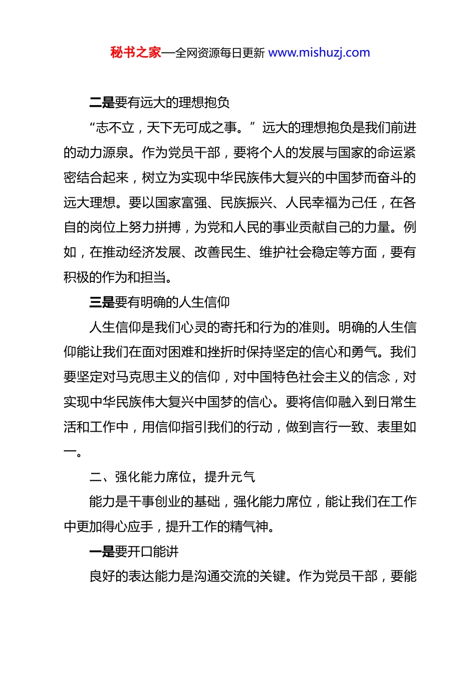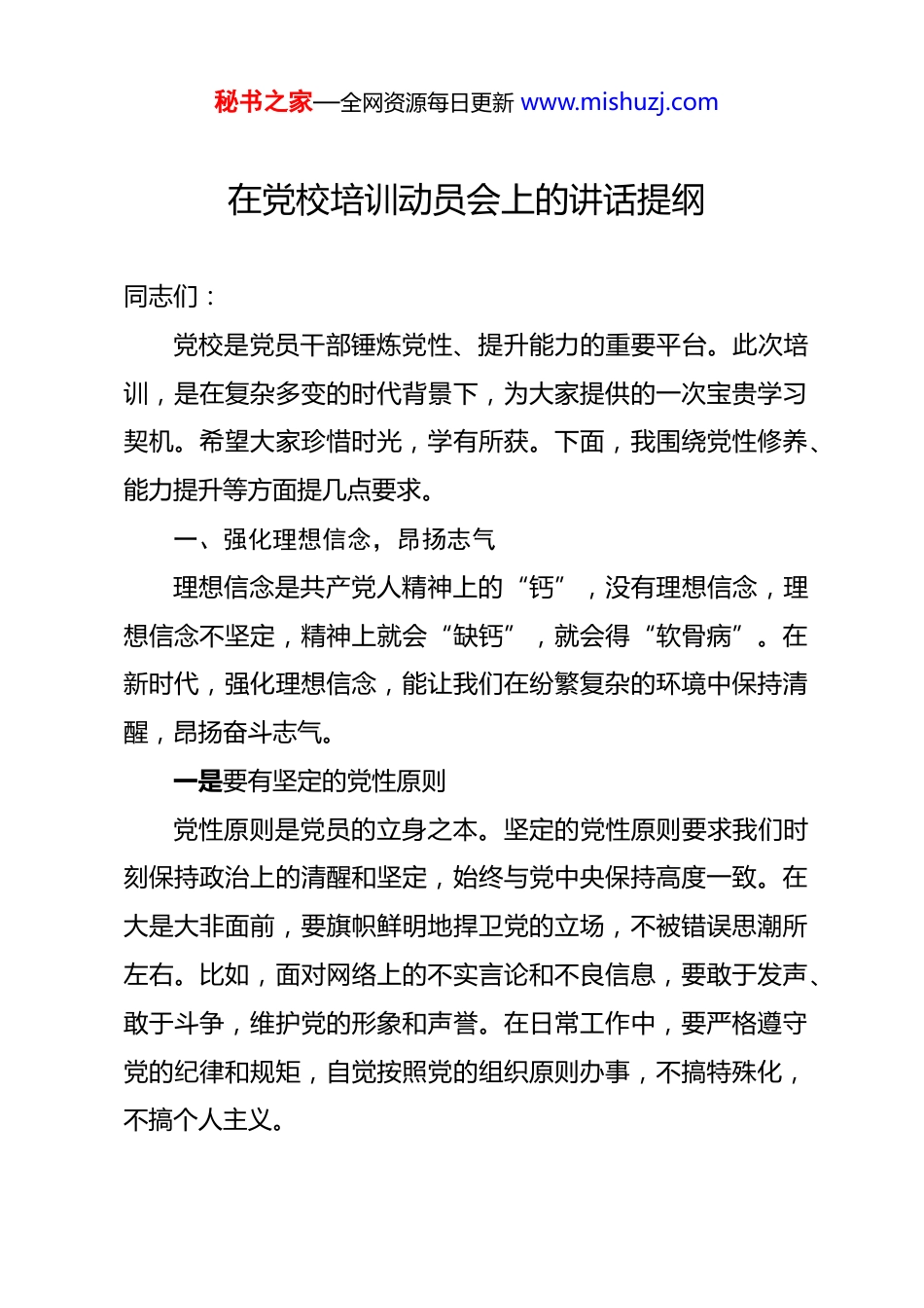 秘书之家—全网资源每日更新 www.mishuzj.com在党校培训动员会上的讲话提纲 同志们:党校是党员干部锤炼党性、提升能力的重要平台。此次培训,是在复杂多变的时代背景下,为大家提供的一次宝贵学习契机。希望大家珍惜时光,学有所获。下面,我围绕党性修养、能力提升等方面提几点要求。一、强化理想信念,昂扬志气理想信念是共产党人精神上的“钙”,没有理想信念,理想信念不坚定,精神上就会“缺钙”,就会得“软骨病”。在新时代,强化理想信念,能让我们在纷繁复杂的环境中保持清醒,昂扬奋斗志气。一是要有坚定的党性原则党性原则是党员的立身之本。坚定的党性原则要求我们时刻保持政治上的清醒和坚定,始终与党中央保持高度一致。在大是大非面前,要旗帜鲜明地捍卫党的立场,不被错误思潮所左右。比如,面对网络上的不实言论和不良信息,要敢于发声、敢于斗争,维护党的形象和声誉。在日常工作中,要严格遵守党的纪律和规矩,自觉按照党的组织原则办事,不搞特殊化,不搞个人主义。秘书之家—全网资源每日更新 www.mishuzj.com二是要有远大的理想抱负“志不立,天下无可成之事。”远大的理想抱负是我们前进的动力源泉。作为党员干部,要将个人的发展与国家的命运紧密结合起来,树立为实现中华民族伟大复兴的中国梦而奋斗的远大理想。要以国家富强、民族振兴、人民幸福为己任,在各自的岗位上努力拼搏,为党和人民的事业贡献自己的力量。例如,在推动经济发展、改善民生、维护社会稳定等方面,要有积极的作为和担当。三是要有明确的人生信仰人生信仰是我们心灵的寄托和行为的准则。明确的人生信仰能让我们在面对困难和挫折时保持坚定的信心和勇气。我们要坚定对马克思主义的信仰,对中国特色社会主义的信念,对实现中华民族伟大复兴中国梦的信心。要将信仰融入到日常生活和工作中,用信仰指引我们的行动,做到言行一致、表里如一。二、强化能力席位,提升元气能力是干事创业的基础,强化能力席位,能让我们在工作中更加得心应手,提升工作的精气神。一是要开口能讲良好的表达能力是沟通交流的关键。作为党员干部,要能秘书之家—全网资源每日更新 www.mishuzj.com够清晰、准确、生动地表达自己的观点和想法。在会议发言、工作汇报、政策宣讲等场合,要做到语言流畅、逻辑严密、重点突出。要注重语言的感染力和说服力,能够用通俗易懂的语言让群众理解我们的工作意图和政策内容。例如,在向群众宣传乡村振兴政策时,要结合实际案例,用生动形象的语言让群众感受到政策的好处。二是要提笔能写写作能力是我们工作中不可或缺的一项技能。无论是撰写工作计划、总结报告,还是起草政策文件,都需要具备扎实的写作功底。要注重积累素材,提高文字表达能力。在写作过程中,要做到内容丰富、条理清晰、结构严谨。要善于运用数据、案例等支撑观点,增强文章的说服力和可信度。同时,要不断学习写作技巧和方法,提高写作效率和质量。三是要问策能答面对工作中的各种问题和挑战,我们要具备问策能答的能力。这要求我们不仅要熟悉业务知识,还要有广泛的知识面和敏锐的思维能力。在遇到问题时,要能够迅速分析问题的本质,提出合理的解决方案。要善于借鉴他人的经验和智慧,不断提高自己的决策水平。例如,在处理突发公共事件时,要能够快速做出反应,制定科学合理的应对措施。秘书之家—全网资源每日更新 www.mishuzj.com四是要遇事能办“空谈误国,实干兴邦。”遇事能办是我们工作的最终目标。在实际工作中,要具备解决实际问题的能力。面对困难和挑战,要勇于担当,积极主动地寻找解决问题的方法。要注重实践锻炼,不断提高自己的工作能力和水平。例如,在推动项目建设过程中,要协调各方资源,解决项目推进中遇到的各种问题,确保项目顺利实施。三、强化业绩导向,增强底气业绩是检验工作成效的重要标准,强化业绩导向,能让我们在工作中更有底气,更有成就感。一是要脚踏实地干工作“千里之行,始于足下。”脚踏实地干工作是取得业绩的基础。我们要立足本职岗位,从实际出发,制定切实可行的工作计划和目标。要注重工作的细节,把每一项工作都做细、做实、做好。在工作中,要克服...