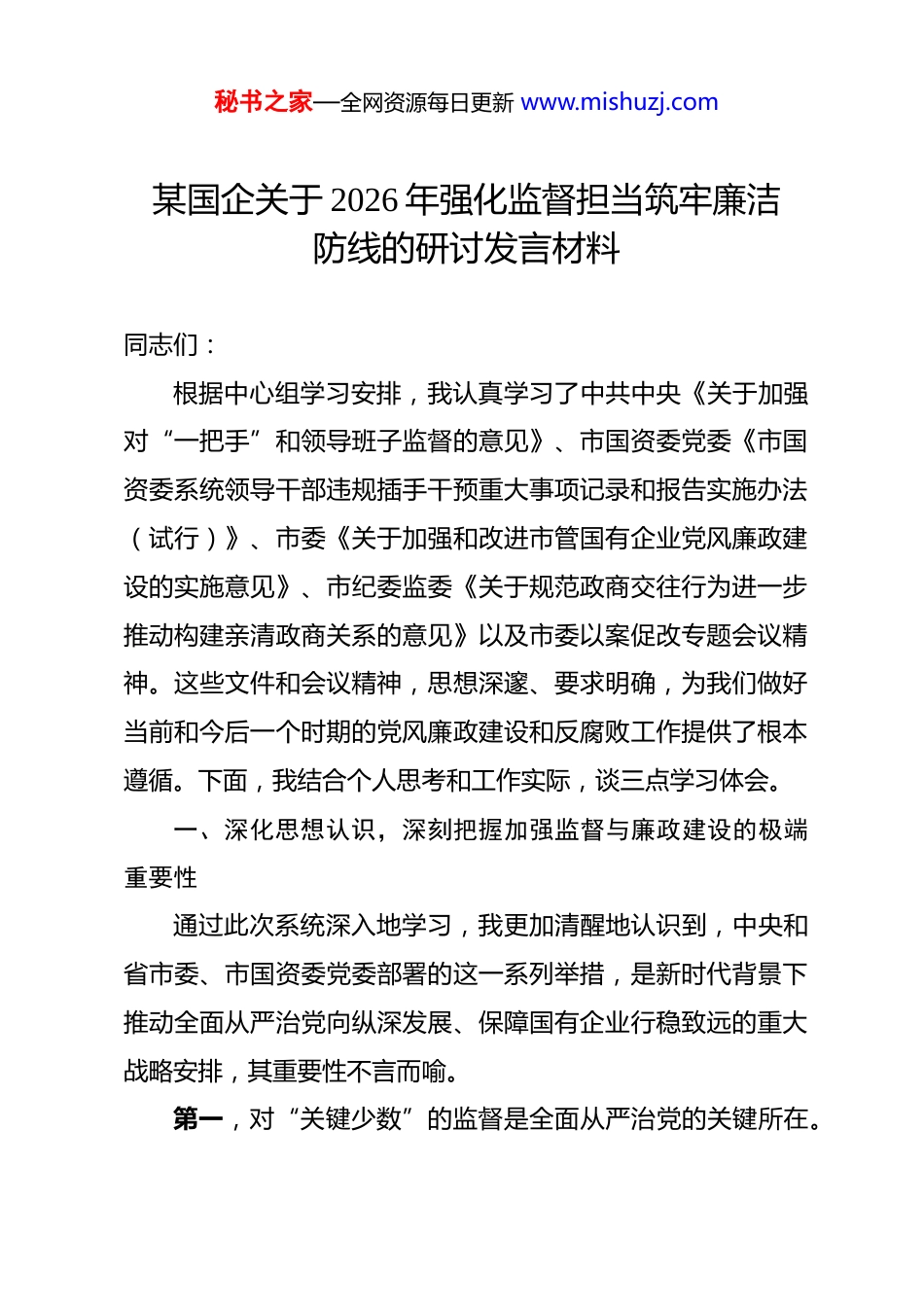 秘书之家—全网资源每日更新 www.mishuzj.com某国企关于 2026 年强化监督担当筑牢廉洁防线的研讨发言材料 同志们:根据中心组学习安排,我认真学习了中共中央《关于加强对“一把手”和领导班子监督的意见》、市国资委党委《市国资委系统领导干部违规插手干预重大事项记录和报告实施办法(试行)》、市委《关于加强和改进市管国有企业党风廉政建设的实施意见》、市纪委监委《关于规范政商交往行为进一步推动构建亲清政商关系的意见》以及市委以案促改专题会议精神。这些文件和会议精神,思想深邃、要求明确,为我们做好当前和今后一个时期的党风廉政建设和反腐败工作提供了根本遵循。下面,我结合个人思考和工作实际,谈三点学习体会。一、深化思想认识,深刻把握加强监督与廉政建设的极端重要性通过此次系统深入地学习,我更加清醒地认识到,中央和省市委、市国资委党委部署的这一系列举措,是新时代背景下推动全面从严治党向纵深发展、保障国有企业行稳致远的重大战略安排,其重要性不言而喻。第一,对“关键少数”的监督是全面从严治党的关键所在。秘书之家—全网资源每日更新 www.mishuzj.com大量案例警示我们,一个单位的政治生态好不好,“一把手”是风向标;领导班子出不出问题,“一把手”是关键。中共中央专门就加强对“一把手”和领导班子监督出台意见,正是抓住了管党治党的“牛鼻子”。国有企业作为国民经济的重要支柱,其“一把手”和领导班子掌握着大量公共资源和生产要素的配置权,一旦权力失控,不仅会造成国有资产的重大损失,更会严重侵蚀党的执政根基。将监督的重音落在“一把手”身上,是对权力运行规律的深刻洞察,也是对国有企业健康发展的深切关怀。作为纪委书记,我深感责任重大,必须把对“一把手”和班子成员的监督摆在首要位置,敢于监督、善于监督,协助党委把这最关键的责任压紧压实。第二,制度化建设是规范权力运行的根本保障。市国资委党委和市委、市纪委监委出台的一系列实施办法和意见,具有极强的现实针对性和可操作性。特别是《违规插手干预重大事项记录和报告实施办法》,为权力运行装上了“记录仪”和“监控器”,让暗箱操作无处遁形,让违规干预全程留痕。这不仅是对企图干预者的有力震慑,更是对一线经办人员的坚强保护。同样,《关于规范政商交往行为的意见》为国企领导干部与市场主体打交道划定了清晰的“红线”和“绿灯区”。这些制度的生命力在于执行。如果制度只是挂在墙上、写在纸上,秘书之家—全网资源每日更新 www.mishuzj.com就会成为“稻草人”。我们必须下大力气推动这些制度在本单位落地生根,使其真正成为带电的“高压线”。第三,常态化警示是筑牢思想防线的长效机制。上级以案促改专题会议通报的案例,每一个都触目惊心、发人深省。腐败的发生,根子在于思想的蜕变和防线的失守。以案促改的价值,不仅在于查处一案、警示一片,更在于通过深刻剖析案件背后的思想根源、制度漏洞和监管缺失,达到“查处一案、完善一批制度、教育一批干部”的系统性治理效果。结合 2026 年以来中央和各级纪委监委持续释放的信号,反腐败斗争的形势依然严峻复杂,特别是新型腐败和隐性腐败问题不容忽视。这要求我们必须摒弃“看客”心态,把别人的教训当成自己的镜鉴,把警示教育融入日常、抓在经常,常敲思想警钟,不断增强干部职工的纪律意识和规矩意识。二、领会精神实质,准确理解系列文件部署的内在逻辑与核心要义深入研读这些文件,我体会到,它们之间环环相扣、互为支撑,共同构建了一个从顶层设计到基层落实、从行为规范到责任追究的严密监督体系,贯穿着一条清晰的逻辑主线。一是体现了“抓关键”与“管全面”的有机统一。文件精神的核心,始终聚焦于“一把手”和领导班子这个“关键少秘书之家—全网资源每日更新 www.mishuzj.com数”,通过加强对他们的监督,带动整个单位党风廉政建设水平的提升。这是一种纲举目张的治理智慧。同时,又通过对重大事项决策、工程招投标、干部任用等具体权力运行环节的规范,将监督触角延伸到企业经营管理的方方面面,实现了对权力的全过程、全方位监管。从监督“一个人”到监督“一群人”,...