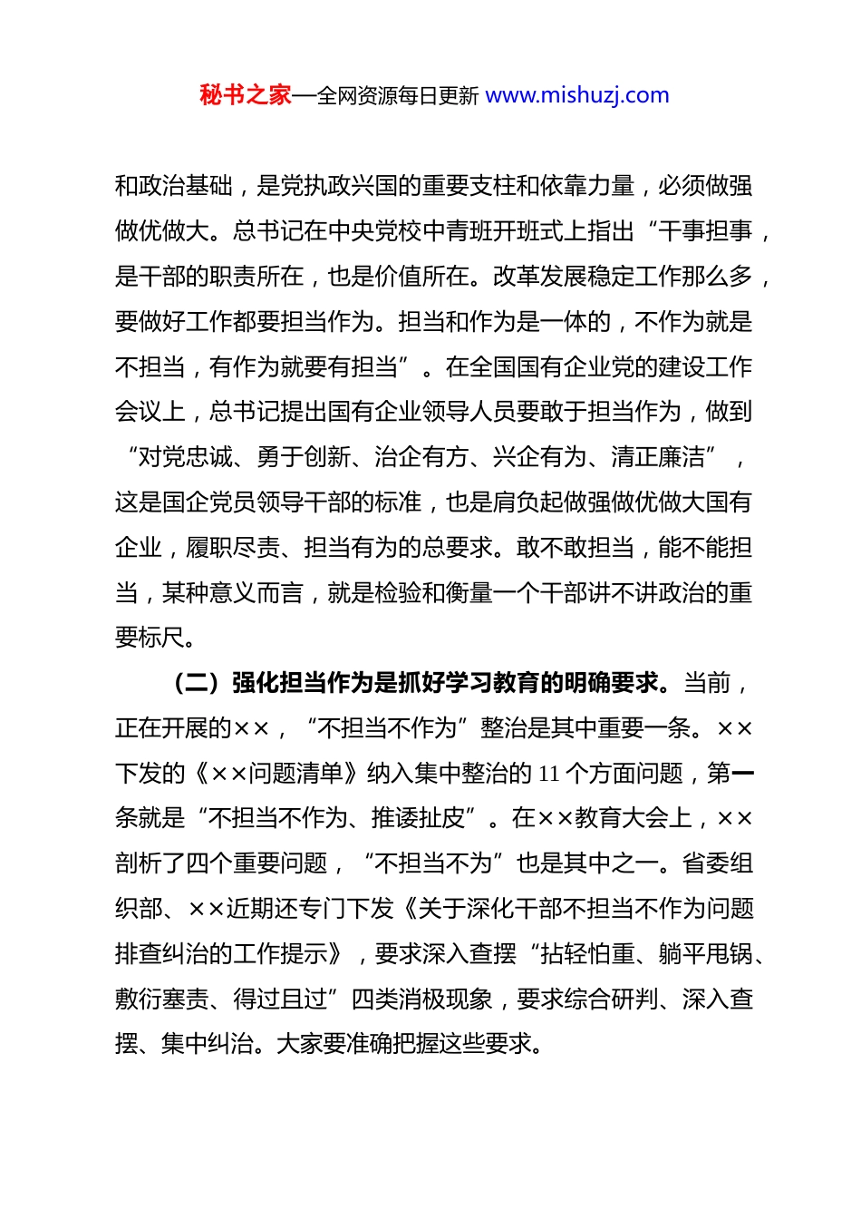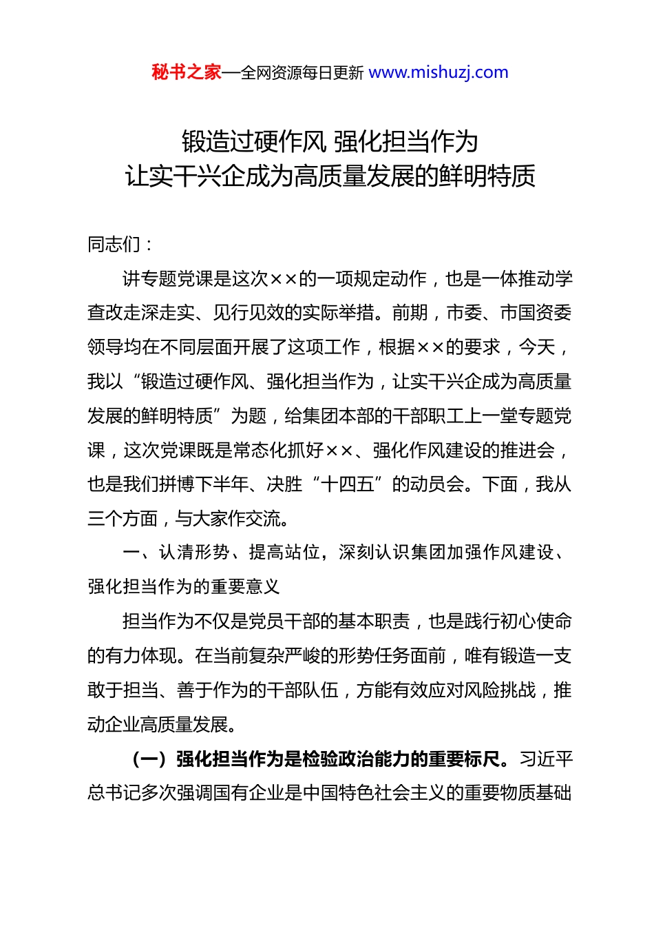 秘书之家—全网资源每日更新 www.mishuzj.com锻造过硬作风 强化担当作为让实干兴企成为高质量发展的鲜明特质同志们:讲专题党课是这次××的一项规定动作,也是一体推动学查改走深走实、见行见效的实际举措。前期,市委、市国资委领导均在不同层面开展了这项工作,根据××的要求,今天,我以“锻造过硬作风、强化担当作为,让实干兴企成为高质量发展的鲜明特质”为题,给集团本部的干部职工上一堂专题党课,这次党课既是常态化抓好××、强化作风建设的推进会,也是我们拼博下半年、决胜“十四五”的动员会。下面,我从三个方面,与大家作交流。一、认清形势、提高站位,深刻认识集团加强作风建设、强化担当作为的重要意义担当作为不仅是党员干部的基本职责,也是践行初心使命的有力体现。在当前复杂严峻的形势任务面前,唯有锻造一支敢于担当、善于作为的干部队伍,方能有效应对风险挑战,推动企业高质量发展。(一)强化担当作为是检验政治能力的重要标尺。习近平总书记多次强调国有企业是中国特色社会主义的重要物质基础秘书之家—全网资源每日更新 www.mishuzj.com和政治基础,是党执政兴国的重要支柱和依靠力量,必须做强做优做大。总书记在中央党校中青班开班式上指出“干事担事,是干部的职责所在,也是价值所在。改革发展稳定工作那么多,要做好工作都要担当作为。担当和作为是一体的,不作为就是不担当,有作为就要有担当”。在全国国有企业党的建设工作会议上,总书记提出国有企业领导人员要敢于担当作为,做到“对党忠诚、勇于创新、治企有方、兴企有为、清正廉洁”,这是国企党员领导干部的标准,也是肩负起做强做优做大国有企业,履职尽责、担当有为的总要求。敢不敢担当,能不能担当,某种意义而言,就是检验和衡量一个干部讲不讲政治的重要标尺。(二)强化担当作为是抓好学习教育的明确要求。当前,正在开展的××,“不担当不作为”整治是其中重要一条。××下发的《××问题清单》纳入集中整治的 11 个方面问题,第一条就是“不担当不作为、推诿扯皮”。在××教育大会上,××剖析了四个重要问题,“不担当不为”也是其中之一。省委组织部、××近期还专门下发《关于深化干部不担当不作为问题排查纠治的工作提示》,要求深入查摆“拈轻怕重、躺平甩锅、敷衍塞责、得过且过”四类消极现象,要求综合研判、深入查摆、集中纠治。大家要准确把握这些要求。秘书之家—全网资源每日更新 www.mishuzj.com(三)强化担当作为是推动企业发展的核心动力。只有干出来的精彩,没有等出来的辉煌。习近平总书记在年初的中央经济工作会议上强调要“干字当头、增强信心、迎难而上、奋发有为”。当前,全球经济增速持续放缓,市场形势依然错综复杂,国有企业处于深化改革攻坚期、创新驱动转型期、产业布局重构期、管理效能提升期和全球竞争加速期,集团目前产业结构还偏传统,核心竞争力、科技创新以及应对周期性波动的抗风险能力还有待提高,个别企业还存在亟待解决的风险隐患。如果没有敢于啃硬骨头、涉险滩的担当精神,没有善于破解难题、驾驭复杂局面的作为能力,就难以有效化解风险、打开工作局面。对此,我们务必要严出好作风,拼出新作为,对照高质量发展目标,切实提升服务发展能力、产业引领能力和风险防范化解能力,推动集团健康可持续发展。(四)强化担当作为是淬炼干部队伍的有力途径。××在署名文章中曾××,“广大党员干部要勇挑重担、开拓进取,求真务实、真抓实干”。市委吴新明书记在专题党课中提出“党员干部要经常问一问自己职责何在、贡献何在、价值何在,始终把干事创业作为本职本分”。不经历风雨,就很难见彩虹。不经受历练,就很难快速成长。干部成长的两个必要条件,一个是组织培养,第二个是个人努力,所谓个人努力就是要担当秘书之家—全网资源每日更新 www.mishuzj.com作为,有为才有位。当前,某种意义上集团系统干部队伍在年龄结构、专业化程度、经营管理能力方面还有提升空间,这需要集团本部干部,特别是年轻干部积极踊跃站出来,敢担当、想担当、能担当、会担当,早日成为集团高质量发展的中坚力量。二、刀刃向内、自我革命,防范集...