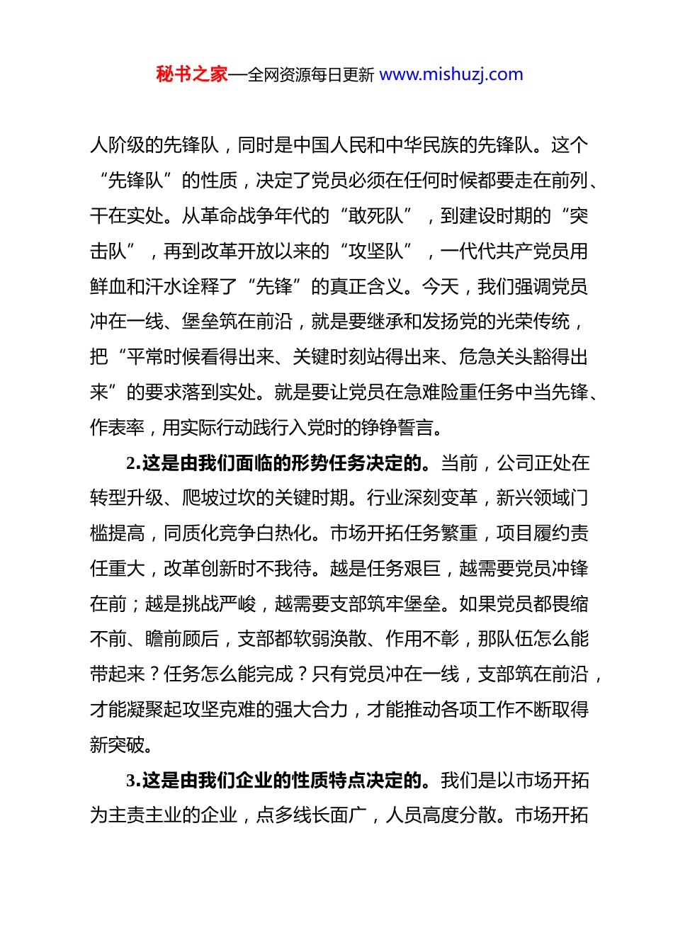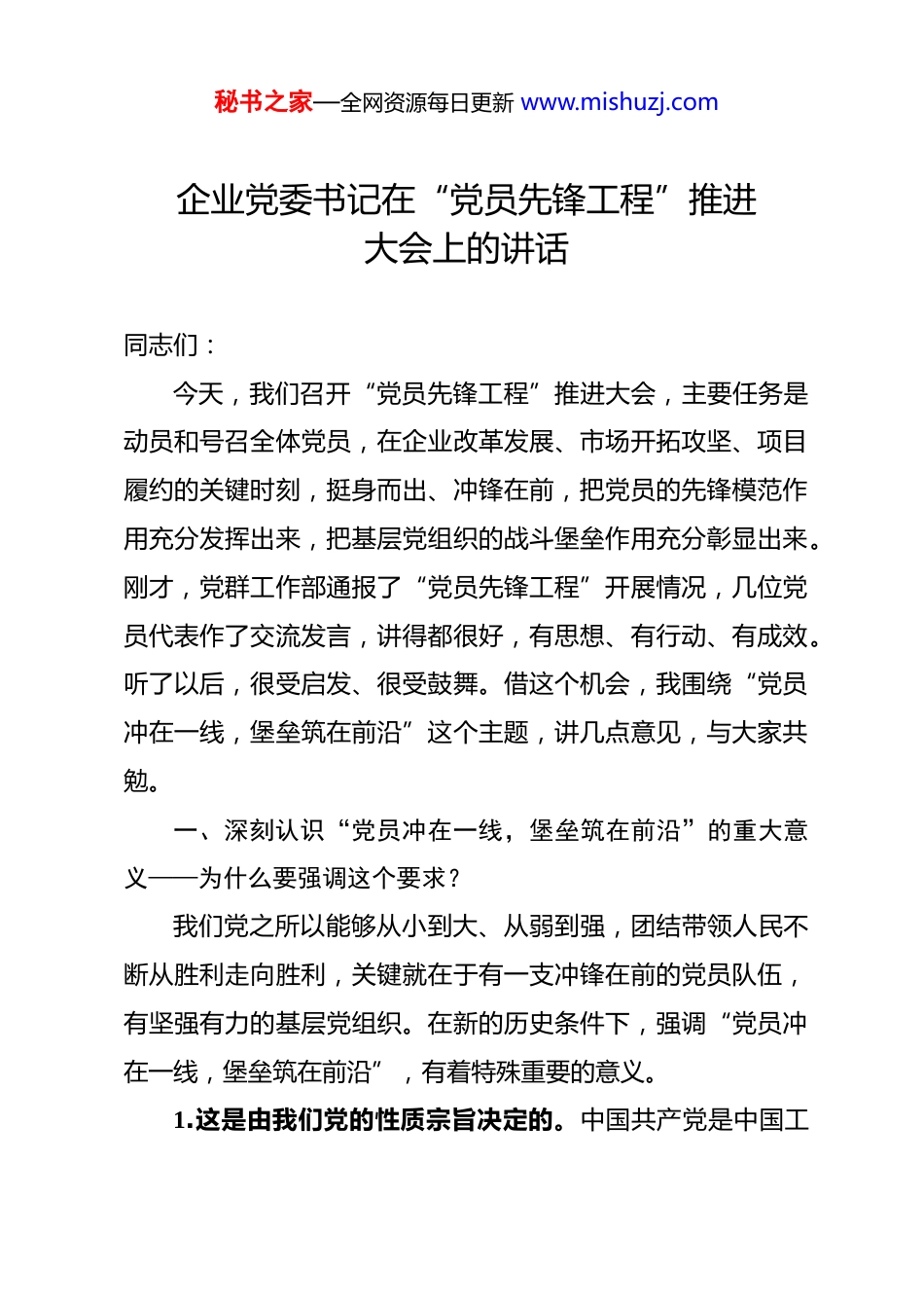 秘书之家—全网资源每日更新 www.mishuzj.com企业党委书记在“党员先锋工程”推进大会上的讲话 同志们:今天,我们召开“党员先锋工程”推进大会,主要任务是动员和号召全体党员,在企业改革发展、市场开拓攻坚、项目履约的关键时刻,挺身而出、冲锋在前,把党员的先锋模范作用充分发挥出来,把基层党组织的战斗堡垒作用充分彰显出来。刚才,党群工作部通报了“党员先锋工程”开展情况,几位党员代表作了交流发言,讲得都很好,有思想、有行动、有成效。听了以后,很受启发、很受鼓舞。借这个机会,我围绕“党员冲在一线,堡垒筑在前沿”这个主题,讲几点意见,与大家共勉。一、深刻认识“党员冲在一线,堡垒筑在前沿”的重大意义——为什么要强调这个要求?我们党之所以能够从小到大、从弱到强,团结带领人民不断从胜利走向胜利,关键就在于有一支冲锋在前的党员队伍,有坚强有力的基层党组织。在新的历史条件下,强调“党员冲在一线,堡垒筑在前沿”,有着特殊重要的意义。1.这是由我们党的性质宗旨决定的。中国共产党是中国工秘书之家—全网资源每日更新 www.mishuzj.com人阶级的先锋队,同时是中国人民和中华民族的先锋队。这个“先锋队”的性质,决定了党员必须在任何时候都要走在前列、干在实处。从革命战争年代的“敢死队”,到建设时期的“突击队”,再到改革开放以来的“攻坚队”,一代代共产党员用鲜血和汗水诠释了“先锋”的真正含义。今天,我们强调党员冲在一线、堡垒筑在前沿,就是要继承和发扬党的光荣传统,把“平常时候看得出来、关键时刻站得出来、危急关头豁得出来”的要求落到实处。就是要让党员在急难险重任务中当先锋、作表率,用实际行动践行入党时的铮铮誓言。2.这是由我们面临的形势任务决定的。当前,公司正处在转型升级、爬坡过坎的关键时期。行业深刻变革,新兴领域门槛提高,同质化竞争白热化。市场开拓任务繁重,项目履约责任重大,改革创新时不我待。越是任务艰巨,越需要党员冲锋在前;越是挑战严峻,越需要支部筑牢堡垒。如果党员都畏缩不前、瞻前顾后,支部都软弱涣散、作用不彰,那队伍怎么能带起来?任务怎么能完成?只有党员冲在一线,支部筑在前沿,才能凝聚起攻坚克难的强大合力,才能推动各项工作不断取得新突破。3.这是由我们企业的性质特点决定的。我们是以市场开拓为主责主业的企业,点多线长面广,人员高度分散。市场开拓秘书之家—全网资源每日更新 www.mishuzj.com口的同志常年在外跑市场,项目上的同志常年驻守工地,许多时候都是单兵作战、独立作业。在这种情况下,党员的先锋模范作用尤为重要,基层党组织的战斗堡垒作用尤为关键。市场开拓一线的党员,要在市场开拓中当先锋、打头阵;项目一线的党员,要在工程履约中作表率、当标杆;技术一线的党员,要在创新攻关中挑大梁、攻难关;机关部门的党员,要在服务保障中讲奉献、作贡献。党员冲在一线,才能带动全体职工奋勇争先;支部筑在前沿,才能确保各项任务圆满完成。4.这是由党员队伍建设的现实需要决定的。从总体上看,公司党员队伍是好的,是经得起考验的。但也必须清醒看到,对照新时代党员标准,对照先进典型,还存在一些差距和不足。有的党员把自己等同于普通群众,平时看不出是党员;有的党员遇到困难绕着走,关键时刻站不出来;有的党员先锋模范作用发挥不够,在群众中缺乏威信和影响力。强调党员冲在一线、堡垒筑在前沿,就是要通过亮身份、当先锋、作表率,让党员形象树起来、党员作用显出来、党员队伍强起来。让每一名党员都成为一面旗帜,让每一个支部都成为一个坚强的战斗堡垒。二、准确把握“党员冲在一线”的实践要求——党员应该怎么冲?“冲在一线”,不是一句口号,而是实实在在的行动。那么,秘书之家—全网资源每日更新 www.mishuzj.com党员应该怎么冲?1.要在市场开拓中当先锋。市场开拓是龙头,是企业的生命线。当前市场竞争异常激烈,新兴领域有待开拓。市场开拓口的党员同志,要勇挑重担、主动作为,在市场开拓中冲在前、干在先。要发扬不怕苦的精神,在激烈的市场竞争中抢占先机。要带头研究市场、研究政策、研究对手,不断提高市场开拓工作的针...
