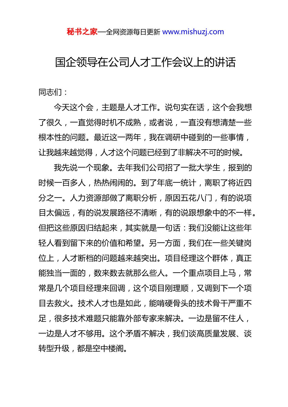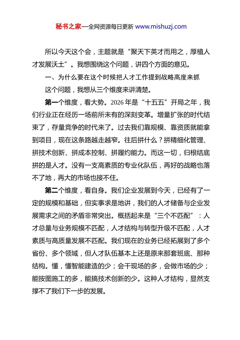 秘书之家—全网资源每日更新 www.mishuzj.com国企领导在公司人才工作会议上的讲话 同志们:今天这个会,主题是人才工作。说句实在话,这个会我想了很久,一直觉得时机不成熟,或者说,一直没有想清楚一些根本性的问题。最近这一两年,我在调研中碰到的一些事情,让我越来越觉得,人才这个问题已经到了非解决不可的时候。我先说一个现象。去年我们公司招了一批大学生,报到的时候一百多人,热热闹闹的。到了年底一统计,离职了将近四分之一。人力资源部做了离职分析,原因五花八门,有的说项目太偏远,有的说发展路径不清晰,有的说跟想象中的不一样。但把这些原因归结起来,其实就是一句话:我们没能让这些年轻人看到留下来的价值和希望。另一方面,我们在一些关键岗位上,人才断档的问题越来越突出。项目经理这个群体,真正能独当一面的,数来数去就那么些人。一个重点项目上马,常常是几个项目经理来回调,这个项目刚理顺,又调到下一个项目去救火。技术人才也是如此,能啃硬骨头的技术骨干严重不足,很多技术难题只能靠外部专家来解决。一边是留不住人,一边是人才不够用。这个矛盾不解决,我们谈高质量发展、谈转型升级,都是空中楼阁。秘书之家—全网资源每日更新 www.mishuzj.com所以今天这个会,主题就是“聚天下英才而用之,厚植人才发展沃土”。我想围绕这个问题,讲四个方面的意见。一、为什么要在这个时候把人才工作提到战略高度来抓这个问题,我想从三个维度来讲清楚。第一个维度,看大势。2026 年是“十五五”开局之年,我们行业正在经历一场前所未有的深刻变革。增量扩张的时代结束了,存量竞争的时代来了。过去我们靠规模、靠资质就能拿到项目,现在这条路越走越窄。往后拼什么?拼精细化管理、拼技术创新、拼成本控制、拼履约能力。而这一切,归根结底拼的是人才。没有一支高素质的专业化队伍,再好的战略也落不了地,再大的市场也接不住。第二个维度,看自身。我们企业发展到今天,已经有了一定的规模和基础,但实事求是地讲,我们的人才储备与企业发展需求之间的矛盾非常突出。概括起来是“三个不匹配”:人才总量与业务规模不匹配,人才结构与转型升级不匹配,人才素质与高质量发展不匹配。我们现在的业务已经拓展到了多个省份、多个领域,但人才队伍基本上还是原来那套班底、那种结构。懂,懂智能建造的少;会干现场的多,会做市场的少;能按图施工的多,能搞技术创新的少。这种人才结构,显然支撑不了我们下一步的发展。秘书之家—全网资源每日更新 www.mishuzj.com第三个维度,看竞争。我们行业的人才竞争已经白热化了。兄弟单位都在抢人,社会资本也在抢人,新兴的科技公司、平台公司也在抢人。我们如果不主动出击、不拿出真金白银的政策来吸引人、留住人、成就人,人才就会流失。有些同志可能觉得,我们是国企,牌子硬、平台大,不愁没人来。这个观念要改一改了。现在的年轻人选择职业,看的不只是企业的名头,更看重的是成长空间、薪酬待遇、工作环境和文化氛围。这些方面我们做得怎么样,大家心里应该有数。基于以上三个维度的分析,我想明确一个判断:人才工作不是人力资源部一家的事,不是锦上添花的“软任务”,而是事关企业生死存亡的战略问题。从今天起,公司党委把人才工作列为“一把手”工程,各级领导班子特别是主要负责同志,要把人才工作摆在更加突出的位置来抓。二、我们需要什么样的人才——树立正确的人才观既然人才工作这么重要,那我们到底需要什么样的人?这个问题如果不搞清楚,招来的人不对路、培养的方向不对头,最终还是白费力气。第一,我们需要的是有真本事的人,不是有花架子的人。我们行业是个实打实的行当,来不得半点虚假。我们需要的项目经理,是能真刀真枪把项目干好的人,不是只会开会汇报的秘书之家—全网资源每日更新 www.mishuzj.com人。我们需要的技术人才,是能在现场解决实际问题的人,不是只会画图纸写论文的人。我们需要的市场人才,是能把市场打开、把客户维护好的人,不是只会喝酒应酬的人。什么是真本事?就是能创造价值、能解决问题、能扛起责任。这是最基本的标准。第二,我们需要的是能扎根一线的人,...