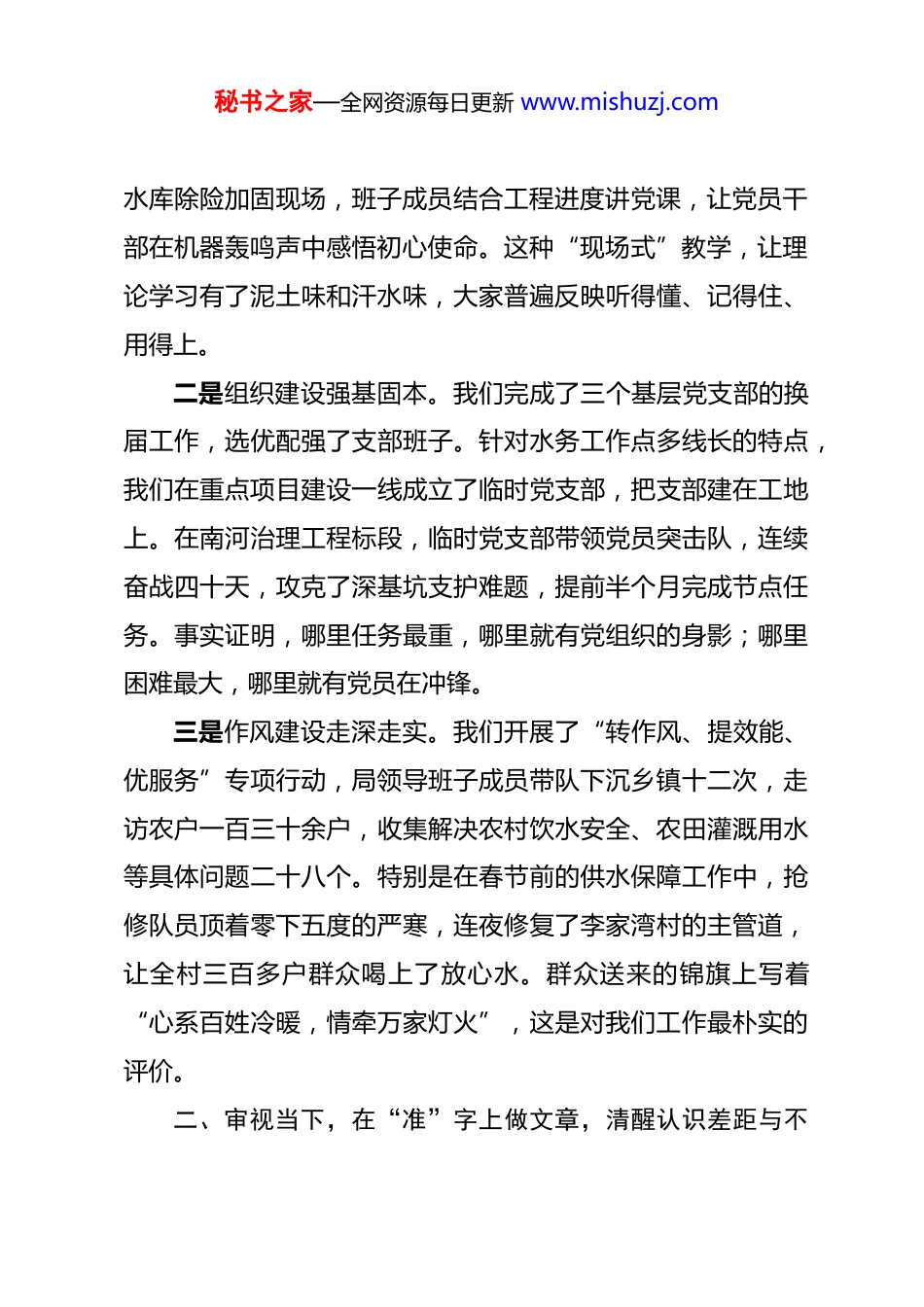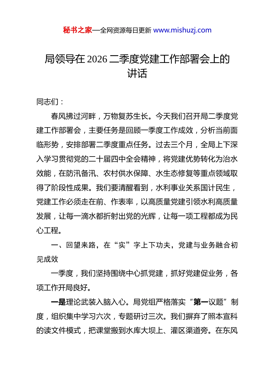 秘书之家—全网资源每日更新 www.mishuzj.com局领导在 2026 二季度党建工作部署会上的讲话 同志们:春风拂过河畔,万物复苏生长。今天我们召开局二季度党建工作部署会,主要任务是回顾一季度工作成效,分析当前面临形势,安排部署二季度重点任务。过去三个月,全局上下深入学习贯彻党的二十届四中全会精神,将党建优势转化为治水效能,在防汛备汛、农村供水保障、水生态修复等重点领域取得了阶段性成果。我们要清醒看到,水利事业关系国计民生,党建工作必须走在前、作表率,以高质量党建引领水利高质量发展,让每一滴水都折射出党的光辉,让每一项工程都成为民心工程。一、回望来路,在“实”字上下功夫,党建与业务融合初见成效一季度,我们坚持围绕中心抓党建,抓好党建促业务,各项工作开局良好。一是理论武装入脑入心。局党组严格落实“第一议题”制度,组织集中学习六次,专题研讨三次。我们摒弃了照本宣科的读文件模式,把课堂搬到水库大坝上、灌区渠道旁。在东风秘书之家—全网资源每日更新 www.mishuzj.com水库除险加固现场,班子成员结合工程进度讲党课,让党员干部在机器轰鸣声中感悟初心使命。这种“现场式”教学,让理论学习有了泥土味和汗水味,大家普遍反映听得懂、记得住、用得上。二是组织建设强基固本。我们完成了三个基层党支部的换届工作,选优配强了支部班子。针对水务工作点多线长的特点,我们在重点项目建设一线成立了临时党支部,把支部建在工地上。在南河治理工程标段,临时党支部带领党员突击队,连续奋战四十天,攻克了深基坑支护难题,提前半个月完成节点任务。事实证明,哪里任务最重,哪里就有党组织的身影;哪里困难最大,哪里就有党员在冲锋。三是作风建设走深走实。我们开展了“转作风、提效能、优服务”专项行动,局领导班子成员带队下沉乡镇十二次,走访农户一百三十余户,收集解决农村饮水安全、农田灌溉用水等具体问题二十八个。特别是在春节前的供水保障工作中,抢修队员顶着零下五度的严寒,连夜修复了李家湾村的主管道,让全村三百多户群众喝上了放心水。群众送来的锦旗上写着“心系百姓冷暖,情牵万家灯火”,这是对我们工作最朴实的评价。二、审视当下,在“准”字上做文章,清醒认识差距与不秘书之家—全网资源每日更新 www.mishuzj.com足成绩值得肯定,但问题不容忽视。对照中央要求和群众期盼,我们的工作还存在不少短板。一是融合深度不够。部分同志仍然存在“两张皮”思想,认为党建是虚功,业务是实绩。有的支部开展活动仅限于开会念文件,没有结合水务工作实际找准切入点。比如在推进节水型社会建设中,党组织的战斗堡垒作用发挥不充分,党员带头节水的示范效应不明显,导致部分群众对节水政策理解不深、配合度不高。二是担当精神不足。面对历史遗留的水事纠纷、复杂的征地拆迁问题,少数干部存在畏难情绪,习惯于“等靠要”,缺乏攻坚克难的锐气。在处理跨乡镇的水资源调配矛盾时,有的同志怕得罪人,协调力度不够,导致问题久拖不决,影响了农业生产进度。三是创新意识不强。习惯用老办法解决新问题,对智慧水利、数字孪生流域等新技术应用研究不深。目前我县水利信息化水平还停留在基础监测阶段,数据共享不畅,预警预报精度不高,难以满足现代化防洪减灾的需求。在党建载体上,形式单一,缺乏吸引力,年轻党员干部参与度不高。这些问题,我们必须高度重视,在二季度工作中切实加以秘书之家—全网资源每日更新 www.mishuzj.com解决。三、聚焦重点,在“干”字上求突破,推动二季度工作再上新台阶二季度是全年工作的黄金期,也是防汛关键期的前奏。我们要锚定目标,精准发力,确保时间过半、任务过半。(一)铸牢政治灵魂,在思想引领上展现新高度要把学习贯彻党的二十届四中全会精神作为首要政治任务不仅要学原文、悟原理,更要结合水利实际抓落实。一是开展“大学习、大调研、大落实”活动。每位班子成员要领衔一个课题,深入一线调研,形成高质量调研报告,提出切实可行的解决对策。二是创新学习载体。利用“学习强国”平台、微信公众号等新媒体,开设“水务微党课”,推送简短精悍的学习内容,让党员干部随时随地都...