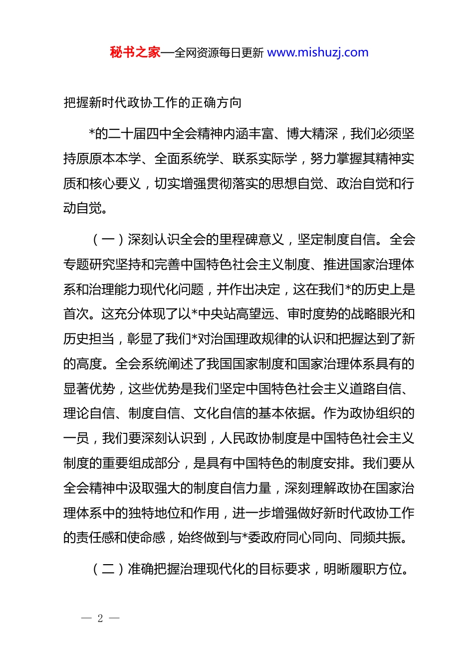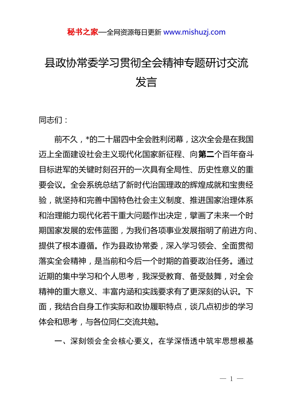 秘书之家—全网资源每日更新 www.mishuzj.com县政协常委学习贯彻全会精神专题研讨交流发言同志们:前不久,*的二十届四中全会胜利闭幕,这次全会是在我国迈上全面建设社会主义现代化国家新征程、向第二个百年奋斗目标进军的关键时刻召开的一次具有全局性、历史性意义的重要会议。全会系统总结了新时代治国理政的辉煌成就和宝贵经验,就坚持和完善中国特色社会主义制度、推进国家治理体系和治理能力现代化若干重大问题作出决定,擘画了未来一个时期国家发展的宏伟蓝图,为我们各项事业发展指明了前进方向、提供了根本遵循。作为县政协常委,深入学习领会、全面贯彻落实全会精神,是当前和今后一个时期的首要政治任务。通过近期的集中学习和个人思考,我深受教育、备受鼓舞,对全会精神的重大意义、丰富内涵和实践要求有了更深刻的认识。下面,我结合自身工作实际和政协履职特点,谈几点初步的学习体会和思考,与各位同仁交流共勉。一、深刻领会全会核心要义,在学深悟透中筑牢思想根基— 1 —秘书之家—全网资源每日更新 www.mishuzj.com把握新时代政协工作的正确方向*的二十届四中全会精神内涵丰富、博大精深,我们必须坚持原原本本学、全面系统学、联系实际学,努力掌握其精神实质和核心要义,切实增强贯彻落实的思想自觉、政治自觉和行动自觉。(一)深刻认识全会的里程碑意义,坚定制度自信。全会专题研究坚持和完善中国特色社会主义制度、推进国家治理体系和治理能力现代化问题,并作出决定,这在我们*的历史上是首次。这充分体现了以*中央站高望远、审时度势的战略眼光和历史担当,彰显了我们*对治国理政规律的认识和把握达到了新的高度。全会系统阐述了我国国家制度和国家治理体系具有的显著优势,这些优势是我们坚定中国特色社会主义道路自信、理论自信、制度自信、文化自信的基本依据。作为政协组织的一员,我们要深刻认识到,人民政协制度是中国特色社会主义制度的重要组成部分,是具有中国特色的制度安排。我们要从全会精神中汲取强大的制度自信力量,深刻理解政协在国家治理体系中的独特地位和作用,进一步增强做好新时代政协工作的责任感和使命感,始终做到与*委政府同心同向、同频共振。(二)准确把握治理现代化的目标要求,明晰履职方位。— 2 —秘书之家—全网资源每日更新 www.mishuzj.com全会提出了坚持和完善中国特色社会主义制度、推进国家治理体系和治理能力现代化的总体目标,明确了时间表和路线图。这一宏伟目标,涵盖了经济、政治、文化、社会、生态文明等各个领域,也对社会主义民主政治建设提出了新的更高要求。政协作为社会主义协商民主的重要渠道和专门协商机构,在推进国家治理体系和治理能力现代化中肩负着重要使命。我们要准确把握全会对治理现代化提出的新要求,自觉将政协工作放到国家治理大局中去谋划和推进,紧紧围绕县委县政府的中心工作,找准政协履职的切入点和着力点,使政协的协商议政、民主监督、参政议政活动更好地服务于县域治理体系和治理能力现代化的实践,助力将制度优势转化为治理效能。(三)深入理解人民至上的价值追求,厚植履职情怀。全会强调,要坚持人民主体地位,着力保障和改善民生,不断实现人民对美好生活的向往。这深刻诠释了我们*立*为公、执政为民的执政理念,彰显了全心全意为人民服务的根本宗旨。政协来自人民、服务人民,履职为民是政协工作的出发点和落脚点。我们要始终牢记“人民政协为人民”的初心使命,把不断满足人民群众对美好生活的需要、促进民生改善作为政协工作的重要着力点。要经常深入基层、深入群众,倾听群众呼声,— 3 —秘书之家—全网资源每日更新 www.mishuzj.com反映群众愿望,抓住民生领域实际问题,通过提案、社情民意信息、调研视察等形式,协助*委政府解决好人民群众急难愁盼问题,让改革发展成果更多更公平惠及全体人民,在服务群众中展现政协的价值追求和责任担当。二、紧密结合政协职能职责,在服务大局中展现担当作为助力县域治理效能提升学习的目的在于应用。贯彻落实四中全会精神,关键在于将全会作出的重大决策部署转化为政协履职的具体行动,围绕中心、服务大局,为推动...