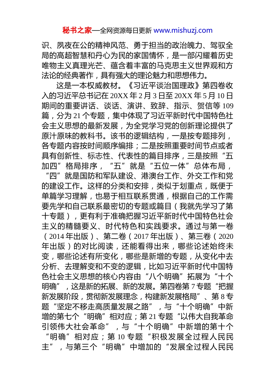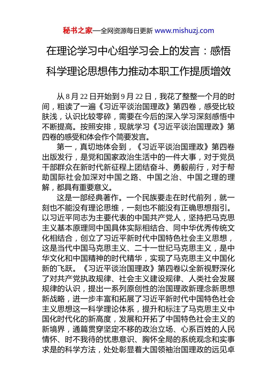 秘书之家—全网资源每日更新 www.mishuzj.com在理论学习中心组学习会上的发言:感悟科学理论思想伟力推动本职工作提质增效从 8 月 22 日开始到 9 月 22 日,我花了整整一个月的时间,粗读了一遍《习近平谈治国理政》第四卷,感受比较肤浅,认识比较零碎,需要在今后的深入学习深刻感悟中不断提高。按照安排,现就学习《习近平谈治国理政》第四卷的感受和体会作个简要发言。第一,真切地体会到,《习近平谈治国理政》第四卷出版发行,是党和国家政治生活中的一件大事,对于党员干部群众在新时代新征程上团结奋斗、勇毅前行,对于帮助国际社会加深对中国之路、中国之治、中国之理的理解,都具有重要意义。这是一部经典著作。一个民族要走在时代前列,就一刻也不能没有理论思维,一刻也不能没有正确思想指引。以习近平同志为主要代表的中国共产党人,坚持把马克思主义基本原理同中国具体实际相结合、同中华优秀传统文化相结合,创立了习近平新时代中国特色社会主义思想,这是当代中国马克思主义、二十一世纪马克思主义,是中华文化和中国精神的时代精华,实现了马克思主义中国化新的飞跃。《习近平谈治国理政》第四卷以全新视野深化了对共产党执政规律、社会主义建设规律、人类社会发展规律的认识,提出一系列原创性的治国理政新理念新思想新战略,进一步丰富和拓展了习近平新时代中国特色社会主义思想这一科学理论体系,提升和标注了马克思主义中国化时代化的新高度,发展和开拓了中国特色社会主义的新境界,通篇贯穿坚定不移的政治立场、心系百姓的人民情怀、时不我待的忧患意识、胸怀全局的系统观念和实事求是的科学方法,处处彰显着大国领袖治国理政的远见卓秘书之家—全网资源每日更新 www.mishuzj.com识、夙夜在公的精神风范、勇于担当的政治魄力、驾驭全局的高超智慧和丹心为民的家国情怀,是一部闪耀着历史唯物主义真理光芒、蕴含着丰富的马克思主义世界观和方法论的经典著作,具有强大的理论魅力和思想伟力。这是一本权威教材。《习近平谈治国理政》第四卷收入的习近平总书记在 20XX 年 2 月 3 日至 20XX 年 5 月 10 日期间的重要讲话、谈话、演讲、致辞、指示、贺信等 109篇,分为 21 个专题,集中体现了习近平新时代中国特色社会主义思想的最新发展,为全党学习党的创新理论提供了原汁原味的教科书。该书的逻辑结构,一是按专题排列,各专题内容按时间顺序编排;二是按照重要时间节点或者具有创新性、标志性、代表性的篇目排序,三是按照“五加四”格局排序,“五”就是“五位一体”总体布局,“四”就是国防和军队建设、港澳台工作、外交工作和党的建设工作。这样的分类和安排,类似于划重点,既便于单篇学习理解,也易于相互联系贯通,根据自己的工作需要先学和自己联系最密切的专题或篇目(我就先学习了第十专题),更有利于准确把握习近平新时代中国特色社会主义的精髓要义、时代特色和实践要求。通过与第一卷(2014 年出版)、第二卷(2017 年出版)、第三卷(2020年出版)的对比阅读,还能看得出来,哪些论述始终未变,哪些论述有所变化,哪些是新增的专题,从变化中去分析、去理解变和不变的逻辑,比如习近平新时代中国特色社会主义思想的核心内容由“八个明确”拓展为“十个明确”,这是新的拓展、新的发展。第四卷第 7 专题“把握新发展阶段,贯彻新发展理念,构建新发展格局”、第 8 专题“坚定不移走高质量发展之路”,与“十个明确”中新增的第七个“明确”相对应;第 21 专题“以伟大自我革命引领伟大社会革命”,与“十个明确”中新增的第十个“明确”相对应;第 10 专题“积极发展全过程人民民主”,与第三个“明确”中增加的“发展全过程人民民秘书之家—全网资源每日更新 www.mishuzj.com主”内容相对应。这是一份行动指南。《习近平谈治国理政》第四卷就新时代“坚持和发展什么样的中国特色社会主义、怎样坚持和发展中国特色社会主义”(第一个专题)、“建设什么样的社会主义现代化强国、怎样建设社会主义现代化强国”(第二至第二十专题)、“建设什么样的长期执政的马克思主义政党、怎样建设长期执政的马克思主...