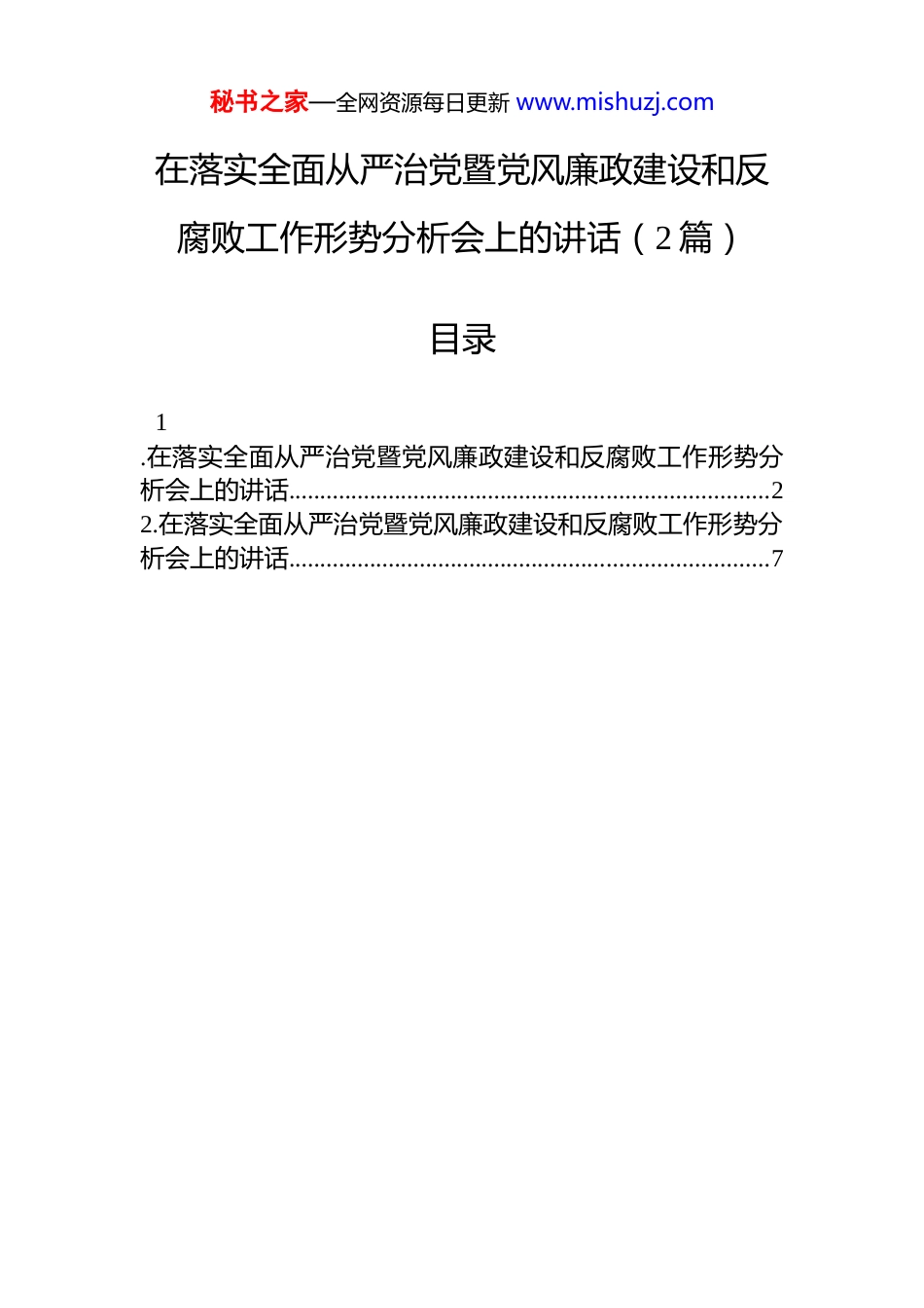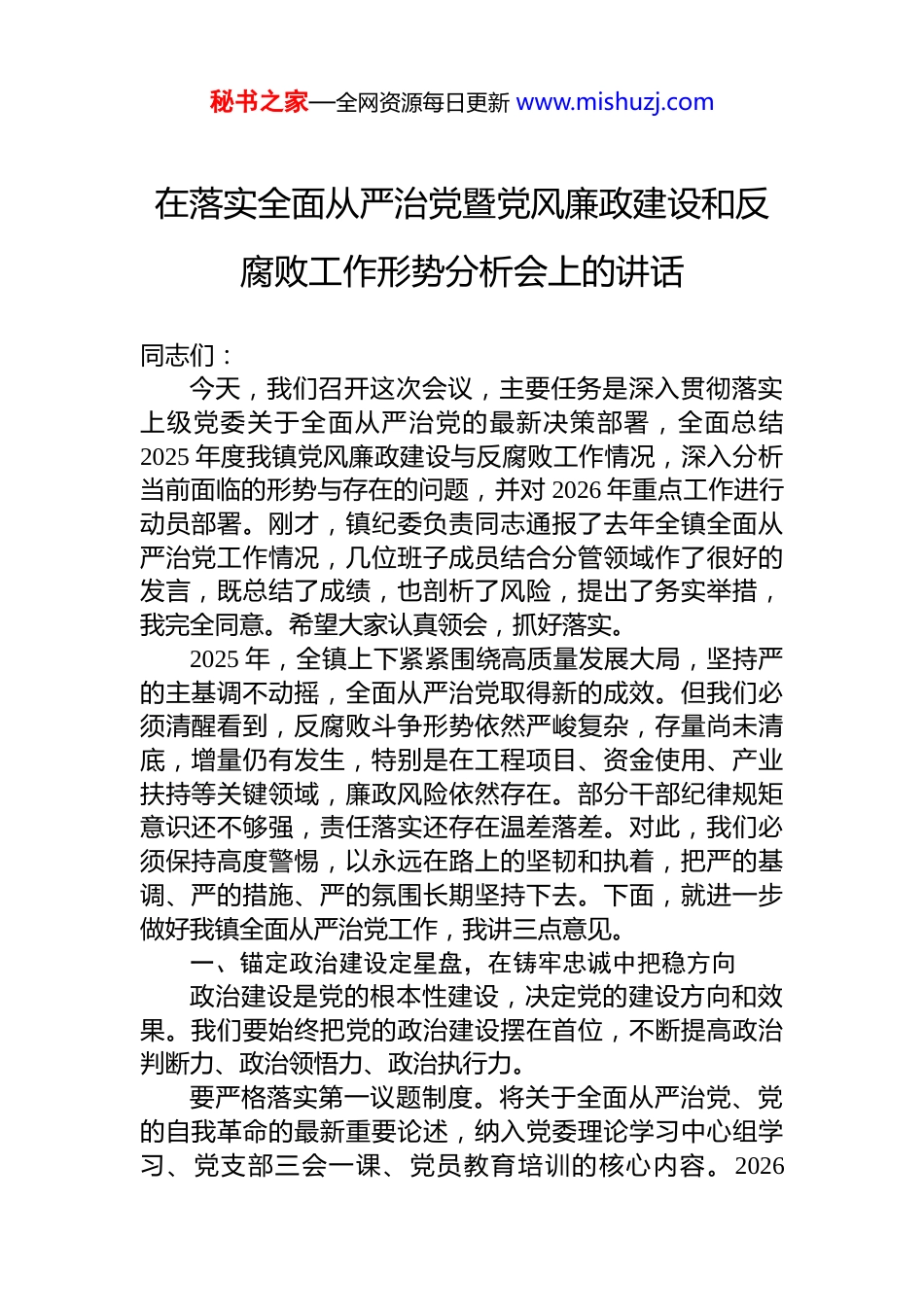 秘书之家—全网资源每日更新 www.mishuzj.com在落实全面从严治党暨党风廉政建设和反腐败工作形势分析会上的讲话(2 篇)目录1.在落实全面从严治党暨党风廉政建设和反腐败工作形势分析会上的讲话.............................................................................22.在落实全面从严治党暨党风廉政建设和反腐败工作形势分析会上的讲话.............................................................................7秘书之家—全网资源每日更新 www.mishuzj.com在落实全面从严治党暨党风廉政建设和反腐败工作形势分析会上的讲话同志们:今天,我们召开这次会议,主要任务是深入贯彻落实上级党委关于全面从严治党的最新决策部署,全面总结2025 年度我镇党风廉政建设与反腐败工作情况,深入分析当前面临的形势与存在的问题,并对 2026 年重点工作进行动员部署。刚才,镇纪委负责同志通报了去年全镇全面从严治党工作情况,几位班子成员结合分管领域作了很好的发言,既总结了成绩,也剖析了风险,提出了务实举措,我完全同意。希望大家认真领会,抓好落实。2025 年,全镇上下紧紧围绕高质量发展大局,坚持严的主基调不动摇,全面从严治党取得新的成效。但我们必须清醒看到,反腐败斗争形势依然严峻复杂,存量尚未清底,增量仍有发生,特别是在工程项目、资金使用、产业扶持等关键领域,廉政风险依然存在。部分干部纪律规矩意识还不够强,责任落实还存在温差落差。对此,我们必须保持高度警惕,以永远在路上的坚韧和执着,把严的基调、严的措施、严的氛围长期坚持下去。下面,就进一步做好我镇全面从严治党工作,我讲三点意见。一、锚定政治建设定星盘,在铸牢忠诚中把稳方向政治建设是党的根本性建设,决定党的建设方向和效果。我们要始终把党的政治建设摆在首位,不断提高政治判断力、政治领悟力、政治执行力。要严格落实第一议题制度。将关于全面从严治党、党的自我革命的最新重要论述,纳入党委理论学习中心组学习、党支部三会一课、党员教育培训的核心内容。2026秘书之家—全网资源每日更新 www.mishuzj.com年,镇党委理论学习中心组开展专题学习不少于十二次,各党支部组织研讨交流不少于四次。要通过系统学习,引导广大党员干部深刻领悟两个确立的决定性意义,增强四个意识、坚定四个自信、做到两个维护,确保党中央决策部署及上级党委工作要求在 xx 镇不折不扣落地生根。要常态化开展纪律教育。镇纪委要创新教育载体,丰富教育形式。通过组织观看警示教育片、参观廉政教育基地、剖析典型案例等方式,用身边事教育身边人。去年,我们查处了几起发生在群众身边的微腐败案件,教训十分深刻。今年,我们要继续深化以案促改,每半年至少开展一次全镇范围的警示教育活动,引导党员干部知敬畏、存戒惧、守底线。要加强对年轻干部、关键岗位干部的教育管理监督,扣好廉洁从政的第一粒扣子。要严肃党内政治生活。严格执行新形势下党内政治生活若干准则,高质量开好民主生活会和组织生活会。班子成员要带头落实双重组织生活制度,以普通党员身份参加所在支部活动。要用好批评和自我批评武器,让红脸出汗成为常态,坚决防止党内政治生活庸俗化、随意化、平淡化,营造风清气正的政治生态。二、激活管党治党动力源,在压实责任中凝聚合力全面从严治党,关键在责任落实。我们要构建明责、履责、考责、问责的闭环体系,推动管党治党责任层层传导、层层落实。要履行好一岗双责。各班子成员既要抓好业务工作,又要抓好分管领域的党风廉政建设。年初要制定责任清单,明确具体任务、责任人和完成时限,实行项目化清单化管理。每季度至少研究一次分管领域的党风廉政建设工作,听取汇报,分析问题,提出对策。要定期与分管部门负责人开展谈心谈话,及时了解思想动态,发现苗头性问题及时提醒纠正。去年,我们推行了群众点题、部门答题、纪委督题的工作闭环机制,效果明显。今年要继续深秘书之家—全网资源每日更新 www.mishuzj.com化这一机制,聚焦群众反映强烈的突出问题,开展专项整治,切实解决一批急难愁盼问题。要健全研判调度机制。党风廉政建设形势分析会每年召开不...