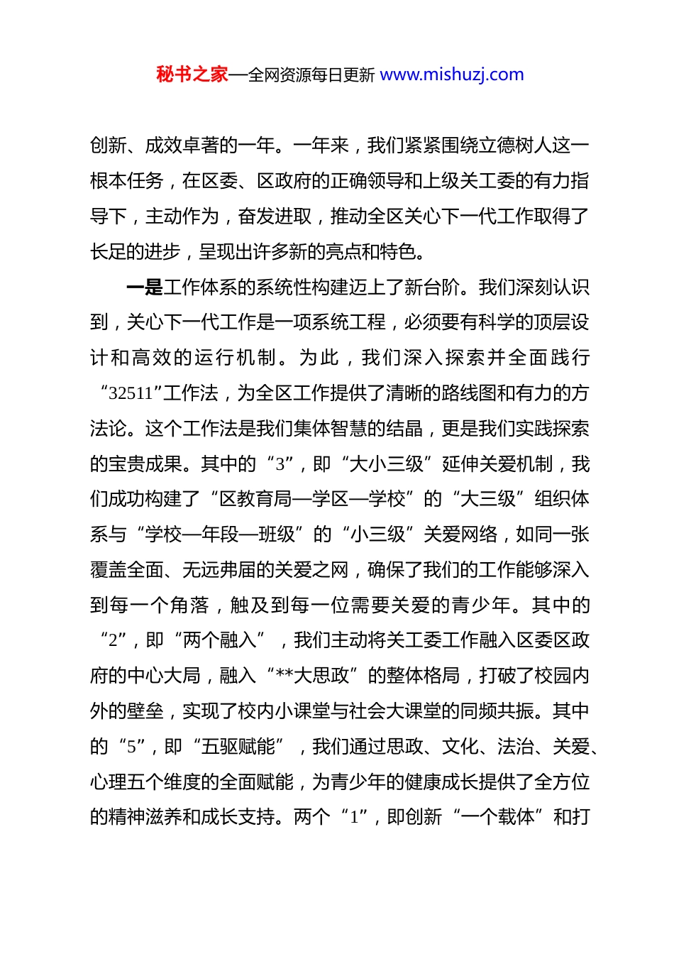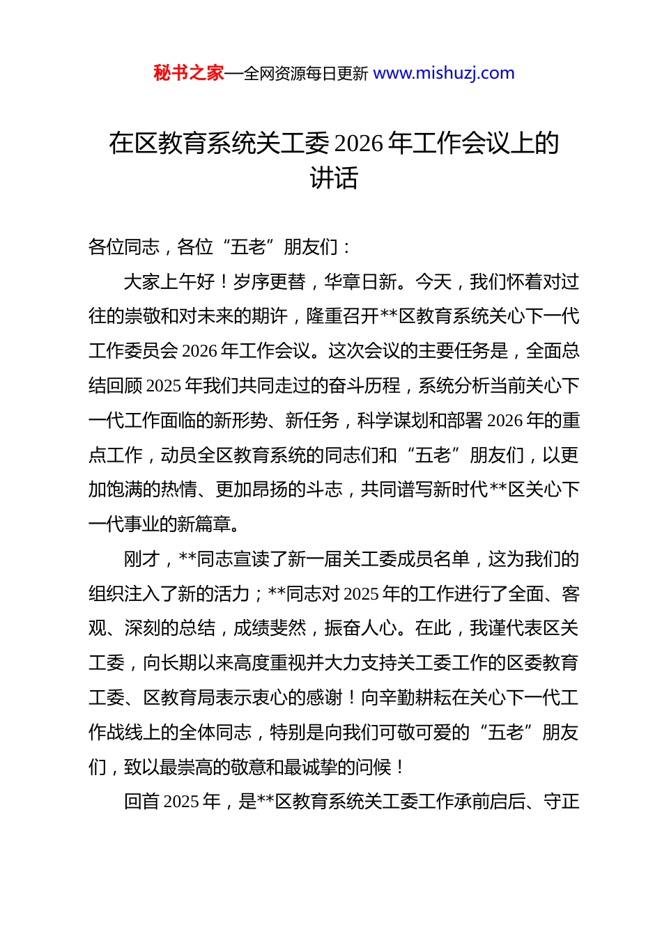 秘书之家—全网资源每日更新 www.mishuzj.com在区教育系统关工委 2026 年工作会议上的讲话 各位同志,各位“五老”朋友们:大家上午好!岁序更替,华章日新。今天,我们怀着对过往的崇敬和对未来的期许,隆重召开**区教育系统关心下一代工作委员会 2026 年工作会议。这次会议的主要任务是,全面总结回顾 2025 年我们共同走过的奋斗历程,系统分析当前关心下一代工作面临的新形势、新任务,科学谋划和部署 2026 年的重点工作,动员全区教育系统的同志们和“五老”朋友们,以更加饱满的热情、更加昂扬的斗志,共同谱写新时代**区关心下一代事业的新篇章。刚才,**同志宣读了新一届关工委成员名单,这为我们的组织注入了新的活力;**同志对 2025 年的工作进行了全面、客观、深刻的总结,成绩斐然,振奋人心。在此,我谨代表区关工委,向长期以来高度重视并大力支持关工委工作的区委教育工委、区教育局表示衷心的感谢!向辛勤耕耘在关心下一代工作战线上的全体同志,特别是向我们可敬可爱的“五老”朋友们,致以最崇高的敬意和最诚挚的问候!回首 2025 年,是**区教育系统关工委工作承前启后、守正秘书之家—全网资源每日更新 www.mishuzj.com创新、成效卓著的一年。一年来,我们紧紧围绕立德树人这一根本任务,在区委、区政府的正确领导和上级关工委的有力指导下,主动作为,奋发进取,推动全区关心下一代工作取得了长足的进步,呈现出许多新的亮点和特色。一是工作体系的系统性构建迈上了新台阶。我们深刻认识到,关心下一代工作是一项系统工程,必须要有科学的顶层设计 和 高 效 的 运 行 机 制 。 为 此 , 我 们 深 入 探 索 并 全 面 践 行“32511”工作法,为全区工作提供了清晰的路线图和有力的方法论。这个工作法是我们集体智慧的结晶,更是我们实践探索的宝贵成果。其中的“3”,即“大小三级”延伸关爱机制,我们成功构建了“区教育局—学区—学校”的“大三级”组织体系与“学校—年段—班级”的“小三级”关爱网络,如同一张覆盖全面、无远弗届的关爱之网,确保了我们的工作能够深入到每一个角落,触及到每一位需要关爱的青少年。其中的“2”,即“两个融入”,我们主动将关工委工作融入区委区政府的中心大局,融入“**大思政”的整体格局,打破了校园内外的壁垒,实现了校内小课堂与社会大课堂的同频共振。其中的“5”,即“五驱赋能”,我们通过思政、文化、法治、关爱、心理五个维度的全面赋能,为青少年的健康成长提供了全方位的精神滋养和成长支持。两个“1”,即创新“一个载体”和打秘书之家—全网资源每日更新 www.mishuzj.com造“一个同心圆”,我们通过建设“五老”关爱工作室等平台,充分激发了老同志的智慧和热情;通过强化“党建带关建”的联动机制,有效整合了社会各方资源,形成了强大的育人合力。这一整套工作法的全面实施,使我们的组织体系更加健全,工作脉络更加清晰,战斗堡垒更加坚固。二是特色品牌的引领性作用实现了新突破。品牌是旗帜,是方向,是影响力和感召力的集中体现。2025 年,我们倾力打造的“**路大思政课”特色品牌,已经成为我区青少年思想政治教育的一张亮丽名片。我们不再将思政课局限于教室和课本,而是创造性地将其延伸到我们脚下这片充满红色记忆和时代印记的土地上。我们组织青少年用脚步丈量城市发展的脉络,在行走中感悟历史变迁,在实践中触摸时代脉搏。据不完全统计,去年一年,“**路大思政课”覆盖全区**所中小学,开展了包括走访红色地标、探寻城市发展、对话时代楷模等主题的实践活动超过**余场,参与师生累计超过*万人次。这种“行走的思政课”,让红色基因和家国情怀在孩子们心中生根发芽,取得了课堂教育无法替代的良好效果。同时,我们深耕家校社协同育人,着力构建“教联体”,推动教育资源共享、育人责任共担。**小学的相关实践探索,更是脱颖而出,成功入选“**省家校社协同育人‘教联体’建设典型案例”,这不仅是**小学秘书之家—全网资源每日更新 www.mishuzj.com的荣誉,更是我们全区上下共同努力的结果,为全省提供了可复制、可推广的“**经验”。三是“五老”队...