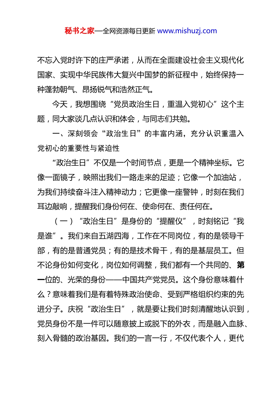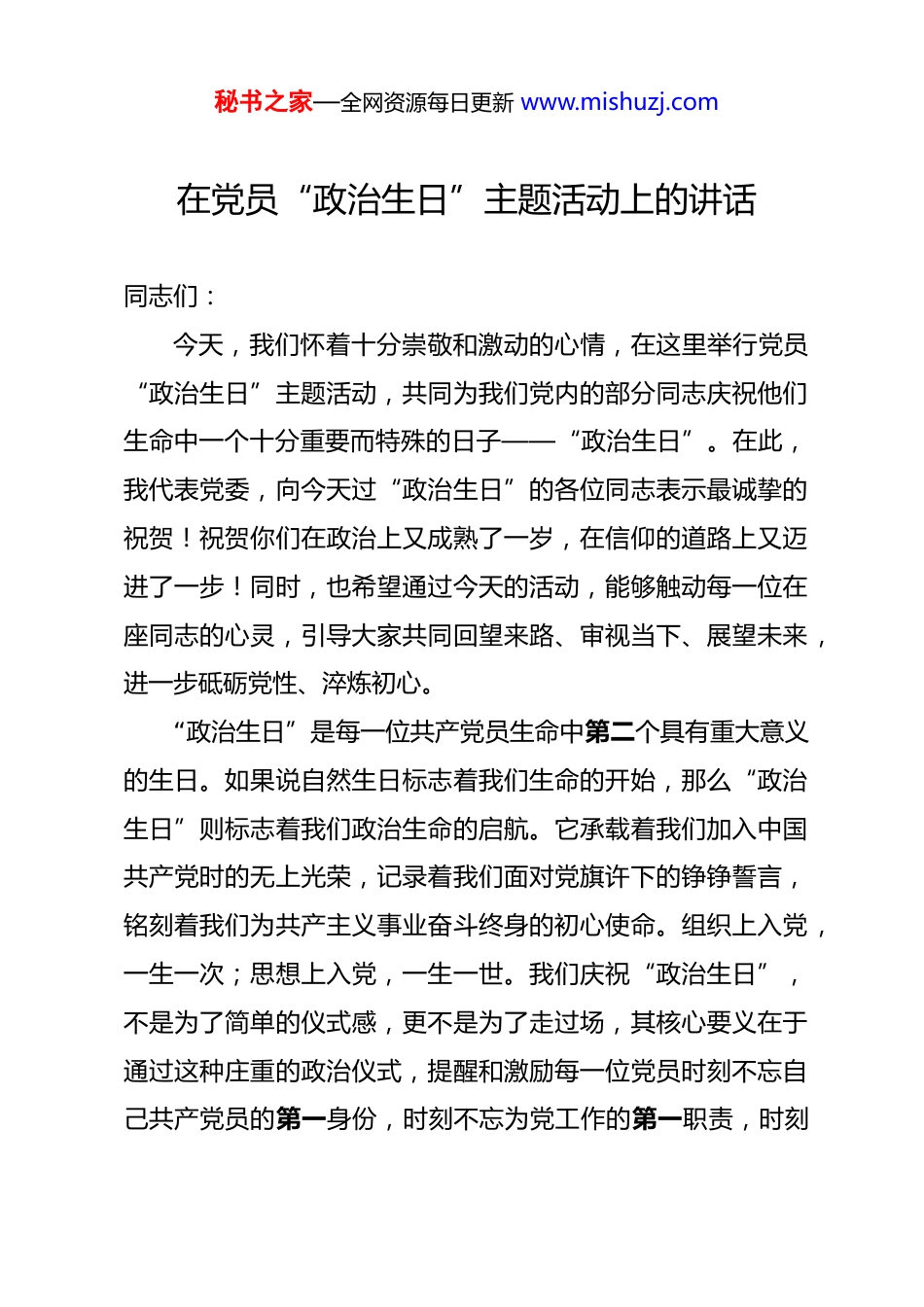 秘书之家—全网资源每日更新 www.mishuzj.com在党员“政治生日”主题活动上的讲话 同志们:今天,我们怀着十分崇敬和激动的心情,在这里举行党员“政治生日”主题活动,共同为我们党内的部分同志庆祝他们生命中一个十分重要而特殊的日子——“政治生日”。在此,我代表党委,向今天过“政治生日”的各位同志表示最诚挚的祝贺!祝贺你们在政治上又成熟了一岁,在信仰的道路上又迈进了一步!同时,也希望通过今天的活动,能够触动每一位在座同志的心灵,引导大家共同回望来路、审视当下、展望未来,进一步砥砺党性、淬炼初心。“政治生日”是每一位共产党员生命中第二个具有重大意义的生日。如果说自然生日标志着我们生命的开始,那么“政治生日”则标志着我们政治生命的启航。它承载着我们加入中国共产党时的无上光荣,记录着我们面对党旗许下的铮铮誓言,铭刻着我们为共产主义事业奋斗终身的初心使命。组织上入党,一生一次;思想上入党,一生一世。我们庆祝“政治生日”,不是为了简单的仪式感,更不是为了走过场,其核心要义在于通过这种庄重的政治仪式,提醒和激励每一位党员时刻不忘自己共产党员的第一身份,时刻不忘为党工作的第一职责,时刻秘书之家—全网资源每日更新 www.mishuzj.com不忘入党时许下的庄严承诺,从而在全面建设社会主义现代化国家、实现中华民族伟大复兴中国梦的新征程中,始终保持一种蓬勃朝气、昂扬锐气和浩然正气。今天,我想围绕“党员政治生日,重温入党初心”这个主题,同大家谈几点认识和体会,与同志们共勉。一、深刻领会“政治生日”的丰富内涵,充分认识重温入党初心的重要性与紧迫性“政治生日”不仅是一个时间节点,更是一个精神坐标。它像一面镜子,映照出我们一路走来的足迹;它像一个加油站,为我们持续奋斗注入精神动力;它更像一座警钟,时刻在我们耳边敲响,提醒我们身份何在、使命何在、责任何在。(一)“政治生日”是身份的“提醒仪”,时刻铭记“我是谁”。我们来自五湖四海,工作在不同岗位,有的是领导干部,有的是普通党员;有的是技术骨干,有的是基层员工。但不论身份如何变化,岗位如何调整,我们都有一个共同的、第一位的、光荣的身份——中国共产党党员。这个身份意味着什么?意味着我们是有着特殊政治使命、受到严格组织约束的先进分子。庆祝“政治生日”,就是要让我们时刻清醒地认识到,党员身份不是一件可以随意披上或脱下的外衣,而是融入血脉、刻入骨髓的政治基因。我们的一言一行,不仅代表个人,更代秘书之家—全网资源每日更新 www.mishuzj.com表着党的形象;我们的一举一动,不仅关乎个人荣辱,更关乎党的威信。因此,我们必须时刻以党员的标准严格要求自己,在工作、学习、生活中处处发挥先锋模范作用,平常时候看得出来,关键时刻站得出来,危急关头豁得出来,让“共产党员”这个称号成为我们最闪亮的名片、最鲜明的底色。(二)“政治生日”是信仰的“检测器”,深刻反思“信什么”。人无信仰不立,党无信仰不存。我们党从诞生之日起,就把马克思主义写在自己的旗帜上,把实现共产主义作为最高理想和最终目标。回顾我们入党之时,哪个不是怀着对党的无限崇敬、对马克思主义的坚定信仰、对社会主义和共产主义的坚定信念?然而,随着时代的发展、环境的变化、阅历的增长,我们的信仰之基是否依然坚如磐石?理想信念是否有所动摇?庆祝“政治生日”,就是给我们一个机会,静下心来,对照党章党规,对照党的理论和路线方针政策,进行一次深刻的“党性体检”。我们要扪心自问:是否还像入党时那样对党忠诚、信念坚定?是否在各种风浪考验面前保持了政治定力?们必须始终保持清醒的头脑,深刻认识马克思主义的科学性和真理性,深刻认识中国特色社会主义的历史必然性和优越性,不断筑牢信仰之基、补足精神之钙、把稳思想之舵,让信仰之光在心中永远闪亮。秘书之家—全网资源每日更新 www.mishuzj.com(三)“政治生日”是初心的“透视镜”,认真检视“为了谁”。我们党的根本宗旨是全心全意为人民服务。我们入党,不是为了升官发财,不是为了光宗耀祖,而是为了更多地承担社会责任,更好地为人民谋幸福、为民族谋...