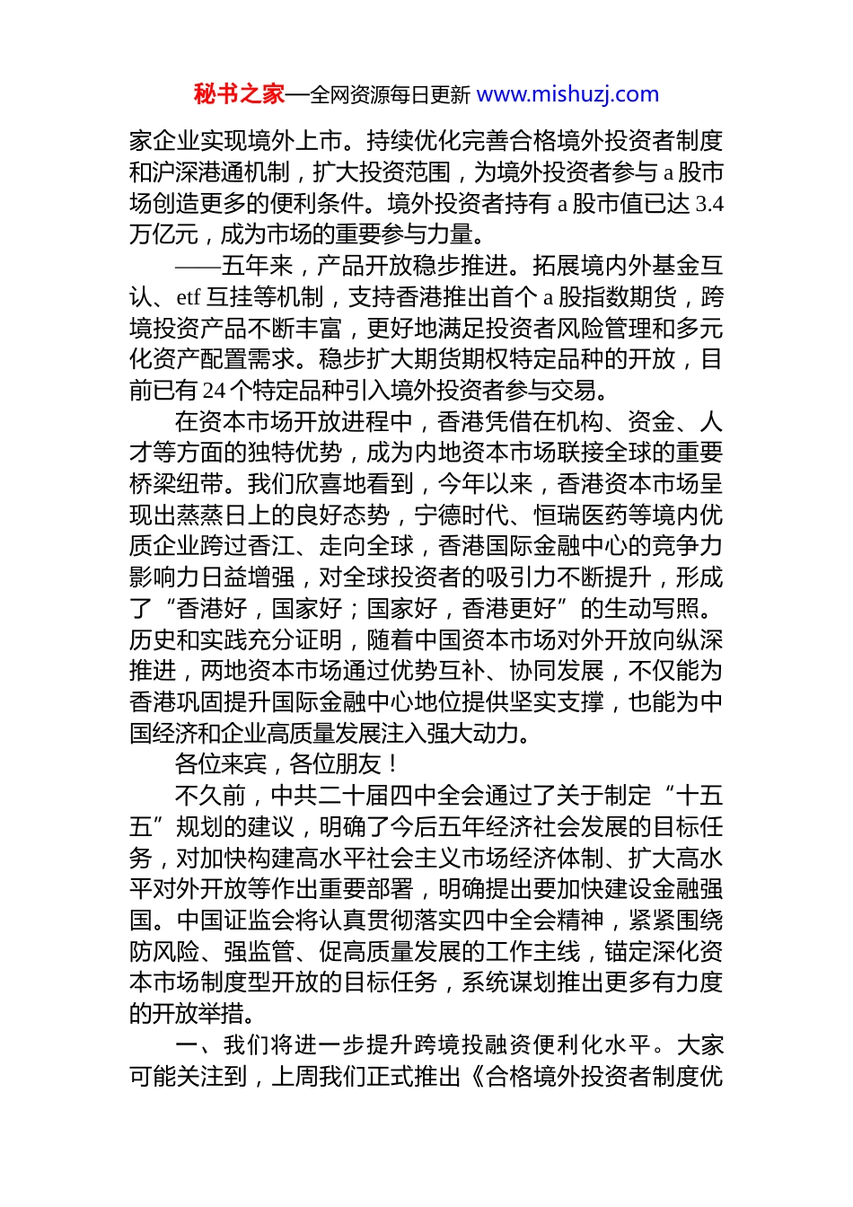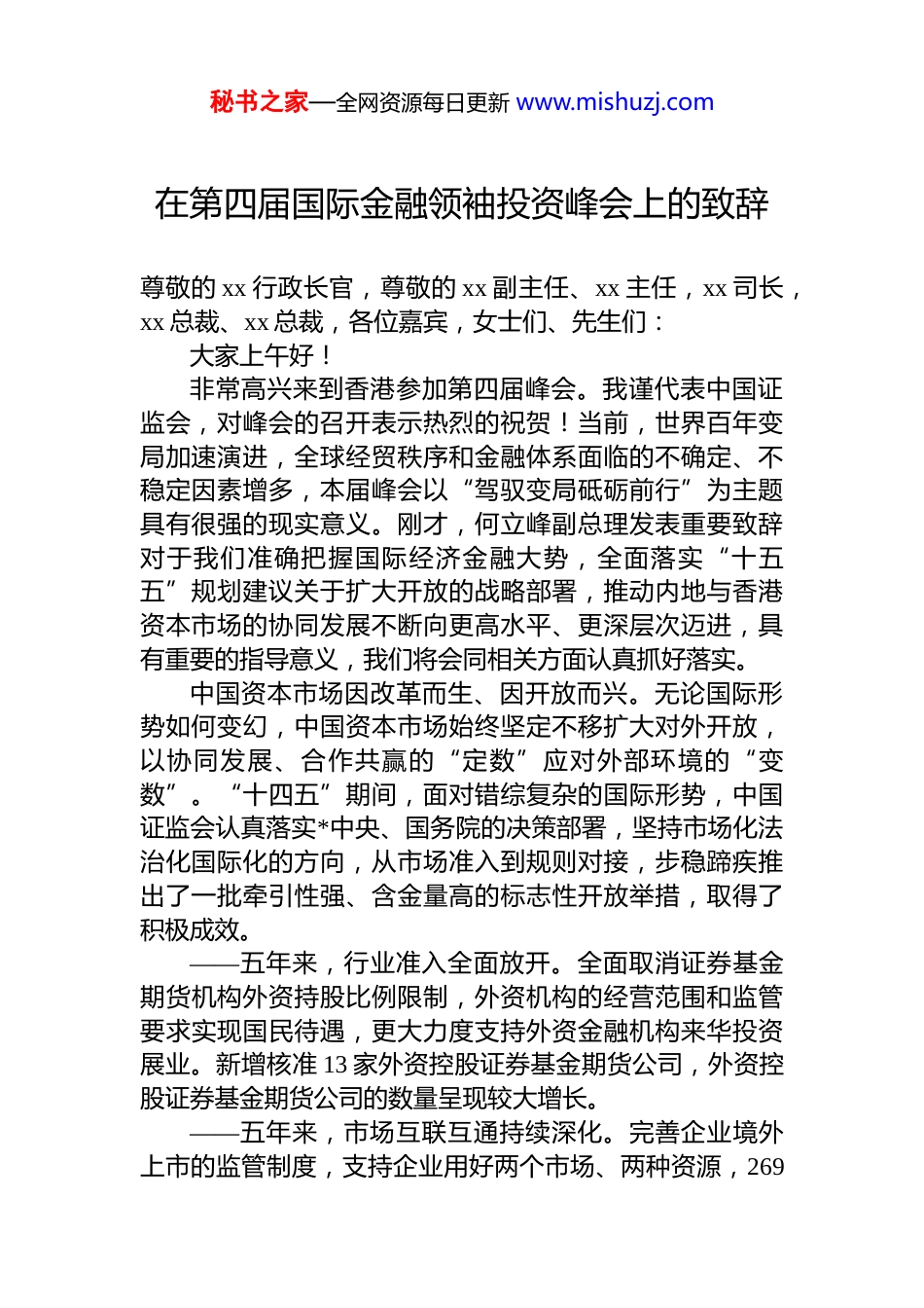 秘书之家—全网资源每日更新 www.mishuzj.com在第四届国际金融领袖投资峰会上的致辞尊敬的 xx 行政长官,尊敬的 xx 副主任、xx 主任,xx 司长,xx 总裁、xx 总裁,各位嘉宾,女士们、先生们:大家上午好!非常高兴来到香港参加第四届峰会。我谨代表中国证监会,对峰会的召开表示热烈的祝贺!当前,世界百年变局加速演进,全球经贸秩序和金融体系面临的不确定、不稳定因素增多,本届峰会以“驾驭变局砥砺前行”为主题具有很强的现实意义。刚才,何立峰副总理发表重要致辞对于我们准确把握国际经济金融大势,全面落实“十五五”规划建议关于扩大开放的战略部署,推动内地与香港资本市场的协同发展不断向更高水平、更深层次迈进,具有重要的指导意义,我们将会同相关方面认真抓好落实。中国资本市场因改革而生、因开放而兴。无论国际形势如何变幻,中国资本市场始终坚定不移扩大对外开放,以协同发展、合作共赢的“定数”应对外部环境的“变数”。“十四五”期间,面对错综复杂的国际形势,中国证监会认真落实*中央、国务院的决策部署,坚持市场化法治化国际化的方向,从市场准入到规则对接,步稳蹄疾推出了一批牵引性强、含金量高的标志性开放举措,取得了积极成效。——五年来,行业准入全面放开。全面取消证券基金期货机构外资持股比例限制,外资机构的经营范围和监管要求实现国民待遇,更大力度支持外资金融机构来华投资展业。新增核准 13 家外资控股证券基金期货公司,外资控股证券基金期货公司的数量呈现较大增长。——五年来,市场互联互通持续深化。完善企业境外上市的监管制度,支持企业用好两个市场、两种资源,269秘书之家—全网资源每日更新 www.mishuzj.com家企业实现境外上市。持续优化完善合格境外投资者制度和沪深港通机制,扩大投资范围,为境外投资者参与 a 股市场创造更多的便利条件。境外投资者持有 a 股市值已达 3.4万亿元,成为市场的重要参与力量。——五年来,产品开放稳步推进。拓展境内外基金互认、etf 互挂等机制,支持香港推出首个 a 股指数期货,跨境投资产品不断丰富,更好地满足投资者风险管理和多元化资产配置需求。稳步扩大期货期权特定品种的开放,目前已有 24 个特定品种引入境外投资者参与交易。在资本市场开放进程中,香港凭借在机构、资金、人才等方面的独特优势,成为内地资本市场联接全球的重要桥梁纽带。我们欣喜地看到,今年以来,香港资本市场呈现出蒸蒸日上的良好态势,宁德时代、恒瑞医药等境内优质企业跨过香江、走向全球,香港国际金融中心的竞争力影响力日益增强,对全球投资者的吸引力不断提升,形成了“香港好,国家好;国家好,香港更好”的生动写照。历史和实践充分证明,随着中国资本市场对外开放向纵深推进,两地资本市场通过优势互补、协同发展,不仅能为香港巩固提升国际金融中心地位提供坚实支撑,也能为中国经济和企业高质量发展注入强大动力。各位来宾,各位朋友!不久前,中共二十届四中全会通过了关于制定“十五五”规划的建议,明确了今后五年经济社会发展的目标任务,对加快构建高水平社会主义市场经济体制、扩大高水平对外开放等作出重要部署,明确提出要加快建设金融强国。中国证监会将认真贯彻落实四中全会精神,紧紧围绕防风险、强监管、促高质量发展的工作主线,锚定深化资本市场制度型开放的目标任务,系统谋划推出更多有力度的开放举措。一、我们将进一步提升跨境投融资便利化水平。大家可能关注到,上周我们正式推出《合格境外投资者制度优秘书之家—全网资源每日更新 www.mishuzj.com化工作方案》,从优化准入管理、提高投资运作效率、扩大投资范围、丰富服务支持等方面,为各类境外投资者提供更加便利、高效的制度环境。我们将切实增强政策的稳定性、透明度和可预期性,持续加强与国际投资者的常态化沟通,推动各项政策措施加快落地见效。二、我们将进一步深化内地与香港资本市场务实合作。着力提升境外上市备案质效,扩大沪深港通标的范围,支持将人民币股票交易柜台、reits 等纳入港股通,积极支持香港推出国债期货,丰富香港离岸人民币风险管理工具,坚定支持香港巩固提升国际...