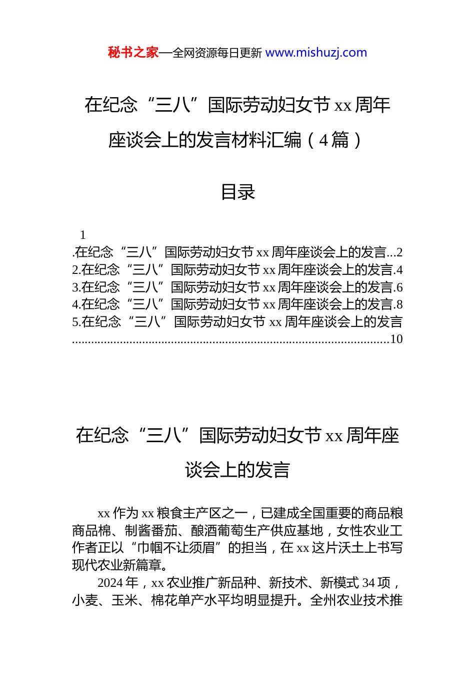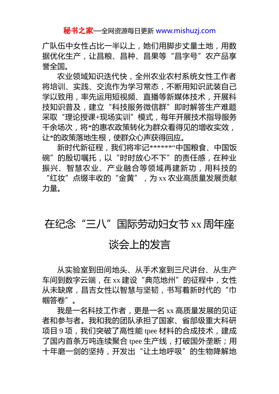 秘书之家—全网资源每日更新 www.mishuzj.com在纪念“三八”国际劳动妇女节 xx 周年座谈会上的发言材料汇编(4 篇)目录1.在纪念“三八”国际劳动妇女节 xx 周年座谈会上的发言...22.在纪念“三八”国际劳动妇女节 xx 周年座谈会上的发言.43.在纪念“三八”国际劳动妇女节 xx 周年座谈会上的发言.64.在纪念“三八”国际劳动妇女节 xx 周年座谈会上的发言.85.在纪念“三八”国际劳动妇女节 xx 周年座谈会上的发言...................................................................................................10在纪念“三八”国际劳动妇女节 xx 周年座谈会上的发言xx 作为 xx 粮食主产区之一,已建成全国重要的商品粮商品棉、制酱番茄、酿酒葡萄生产供应基地,女性农业工作者正以“巾帼不让须眉”的担当,在 xx 这片沃土上书写现代农业新篇章。2024 年,xx 农业推广新品种、新技术、新模式 34 项,小麦、玉米、棉花单产水平均明显提升。全州农业技术推秘书之家—全网资源每日更新 www.mishuzj.com广队伍中女性占比一半以上,她们用脚步丈量土地,用数据优化生产,让昌粮、昌种、昌果等“昌字号”农产品享誉全国。农业领域知识迭代快,全州农业农村系统女性工作者将培训、实践、交流作为学习常态,不断用知识武装自己学以致用,率先运用短视频、直播等新媒体技术,开展科技知识普及,建立“科技服务微信群”即时解答生产难题采取“理论授课+现场实训”模式,每年开展技术指导服务千余场次,将*的惠农政策转化为群众看得见的增收实效,让*的政策落地生根,使群众心声获得回应。新时代新征程,我们将牢记******“中国粮食、中国饭碗”的殷切嘱托,以“时时放心不下”的责任感,在种业振兴、智慧农业、产业融合等领域再建新功,用科技的“红妆”点缀丰收的“金黄”,为 xx 农业高质量发展贡献力量。在纪念“三八”国际劳动妇女节 xx 周年座谈会上的发言从实验室到田间地头、从手术室到三尺讲台、从生产车间到数字云端,在 xx 建设“典范地州”的征程中,女性从未缺席,昌吉女性以智慧与坚韧,书写着新时代的“巾帼答卷”。我是一名科技工作者,更是一名 xx 高质量发展的见证者和参与者。我和我的团队承担了国家、省部级重大科研项目 9 项,我们突破了高性能 tpee 材料的合成技术,建成了国内首条万吨连续聚合 tpee 生产线,打破国外垄断;用十年磨一剑的坚持,开发出“让土地呼吸”的生物降解地秘书之家—全网资源每日更新 www.mishuzj.com膜技术,用科技的温度,为子孙后代留住绿水青山。在科技发展的进程中,女性科技工作者正以独特的视角、坚韧的毅力和卓越的智慧,撑起创新发展的“半边天”。从基础研究的前沿阵地到应用技术的广阔天地,从实验室的潜心钻研到产业一线的奋力拼搏,我们的身影无处不在、贡献有目共睹,我们用实际行动证明了,女性在科技领域同样可以大有作为,可以创造出令人瞩目的成就。我们脚下这片土地,曾是丝绸之路上驼铃悠扬的文明交汇之地。今天,肩负着建设“典范地州”使命任务的 xx也是智慧与梦想交织的创新热土。作为女性科技工作者,我们将争做创新攻坚的“排头兵”,聚焦光伏硅基、现代种业、智慧医疗等主战场,在“卡脖子”技术攻关中彰显巾帼锐气,推动更多实验室成果转化为生产线效益,让 xx涌现出更多“创新高峰”。在纪念“三八”国际劳动妇女节 xx 周年座谈会上的发言医疗卫生事业是一项伟大而崇高的事业,它关乎着每个人的生命健康,而女性医务工作者,在这个领域中扮演着不可或缺的角色,大家以女性特有的温柔、细腻和耐心为患者带来温暖和安慰,用专业的知识和技能,为患者的健康保驾护航。从业 17 年,我先后主刀了上千例内镜下三四级手术。每一次执刀,我都深知责任重于泰山,手中的器械承载着患者对健康的渴望。作为医务工作者,我们始终冲锋在救死扶伤的前沿,无论是急诊科的生死时速、手术台的精益求精,还是社区健康服务的细致入微,我们用专业与温情秘书之家—全网资源每日更新 www.mishuzj.com诠释了医者仁心,尤其是在妇幼健康领域,医护人员扎实做好孕产妇管理、儿童健康...