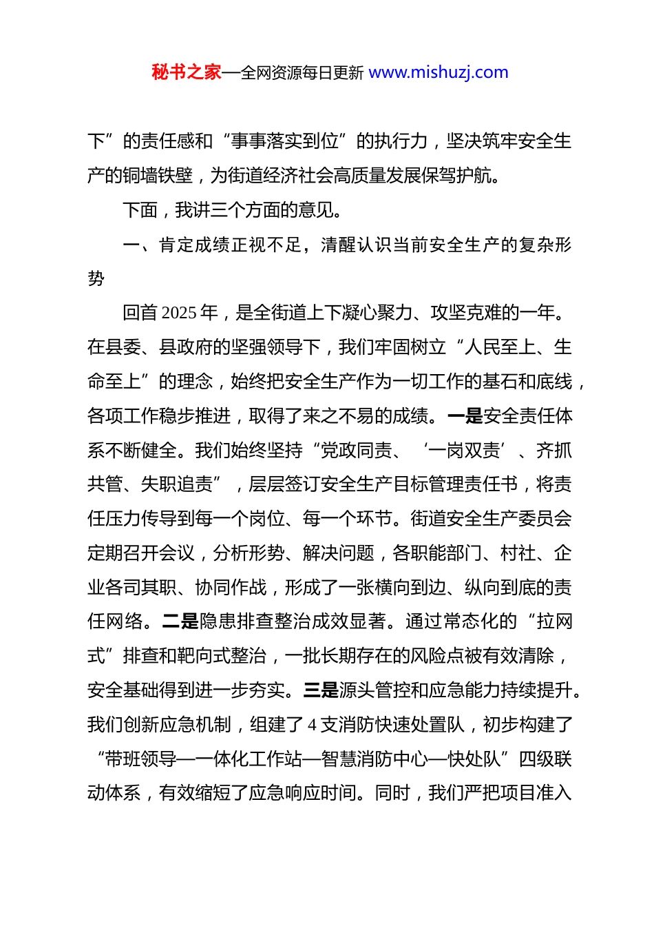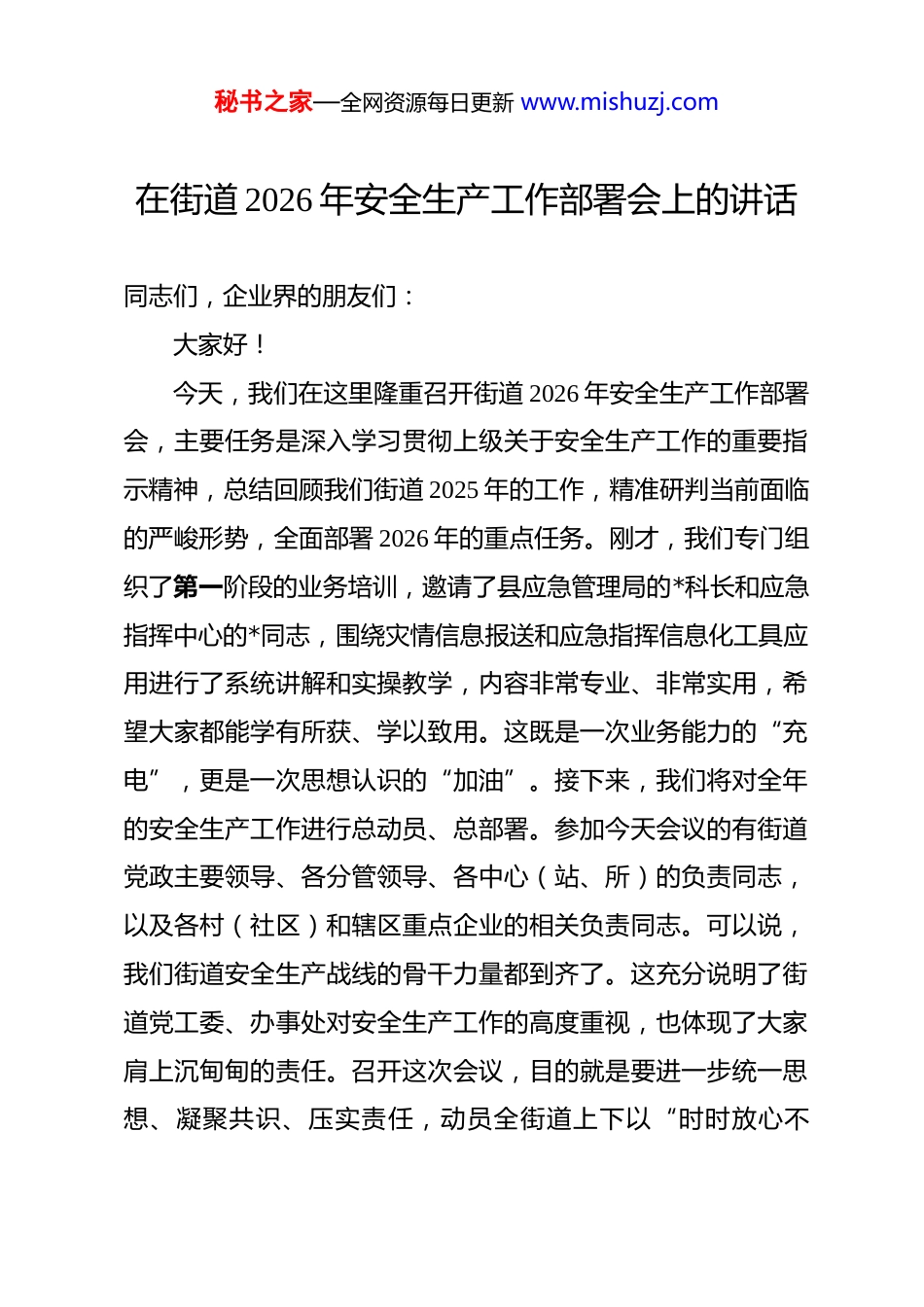 秘书之家—全网资源每日更新 www.mishuzj.com在街道 2026 年安全生产工作部署会上的讲话 同志们,企业界的朋友们:大家好!今天,我们在这里隆重召开街道 2026 年安全生产工作部署会,主要任务是深入学习贯彻上级关于安全生产工作的重要指示精神,总结回顾我们街道 2025 年的工作,精准研判当前面临的严峻形势,全面部署 2026 年的重点任务。刚才,我们专门组织了第一阶段的业务培训,邀请了县应急管理局的*科长和应急指挥中心的*同志,围绕灾情信息报送和应急指挥信息化工具应用进行了系统讲解和实操教学,内容非常专业、非常实用,希望大家都能学有所获、学以致用。这既是一次业务能力的“充电”,更是一次思想认识的“加油”。接下来,我们将对全年的安全生产工作进行总动员、总部署。参加今天会议的有街道党政主要领导、各分管领导、各中心(站、所)的负责同志,以及各村(社区)和辖区重点企业的相关负责同志。可以说,我们街道安全生产战线的骨干力量都到齐了。这充分说明了街道党工委、办事处对安全生产工作的高度重视,也体现了大家肩上沉甸甸的责任。召开这次会议,目的就是要进一步统一思想、凝聚共识、压实责任,动员全街道上下以“时时放心不秘书之家—全网资源每日更新 www.mishuzj.com下”的责任感和“事事落实到位”的执行力,坚决筑牢安全生产的铜墙铁壁,为街道经济社会高质量发展保驾护航。下面,我讲三个方面的意见。一、肯定成绩正视不足,清醒认识当前安全生产的复杂形势回首 2025 年,是全街道上下凝心聚力、攻坚克难的一年。在县委、县政府的坚强领导下,我们牢固树立“人民至上、生命至上”的理念,始终把安全生产作为一切工作的基石和底线,各项工作稳步推进,取得了来之不易的成绩。一是安全责任体系不断健全。我们始终坚持“党政同责、‘一岗双责’、齐抓共管、失职追责”,层层签订安全生产目标管理责任书,将责任压力传导到每一个岗位、每一个环节。街道安全生产委员会定期召开会议,分析形势、解决问题,各职能部门、村社、企业各司其职、协同作战,形成了一张横向到边、纵向到底的责任网络。二是隐患排查整治成效显著。通过常态化的“拉网式”排查和靶向式整治,一批长期存在的风险点被有效清除,安全基础得到进一步夯实。三是源头管控和应急能力持续提升。我们创新应急机制,组建了 4 支消防快速处置队,初步构建了“带班领导—一体化工作站—智慧消防中心—快处队”四级联动体系,有效缩短了应急响应时间。同时,我们严把项目准入秘书之家—全网资源每日更新 www.mishuzj.com关,对新建、改建、扩建项目的安全设施“三同时”制度执行情况进行严格监督,从源头上防范了风险。总体来看,过去一年,全街道安全生产形势保持了平稳向好的态势,未发生重特大生产安全事故,为街道的和谐稳定和经济发展创造了良好的环境。这些成绩的取得,凝聚了在座各位同志和全街道安全生产战线工作人员的辛勤汗水和不懈努力。在此,我代表街道党工委、办事处,向大家表示衷心的感谢和崇高的敬意!在肯定成绩的同时,我们更要清醒地看到,成绩只代表过去,风险依然存在,挑战不容忽视。我们必须深刻认识到,当前街道的安全生产形势依然严峻复杂,容不得我们有半点松懈和麻痹。一是重点领域风险依然突出。新闻稿中明确指出了我们辖区当前面临的几个突出风险点,我在这里要再强调一下。交通安全方面,随着经济复苏,人流、物流、车流大幅增加,道路交通压力巨大,农村道路、临水临崖路段的安全设施仍有短板。自建房安全方面,部分老旧自建房存在结构老化、违规改扩建、消防通道堵塞等问题,特别是用于出租、经营的自建房,人员密集,一旦出事,后果不堪设想。干花生产安全方面,这是我们辖区的一个特色产业,但其生产过程中涉及烘干、粉尘、用电等多个环节,原材料易燃,作业空间有限,火灾风险等级高,必须作为我们监管的重中之重。二是特殊时段风险交秘书之家—全网资源每日更新 www.mishuzj.com织叠加。当前正值企业复工复产的关键时期,一些企业为了抢抓生产进度,容易出现超能力、超强度、超定员生产的现象,安全管理容易松懈。同时,部分员工节...