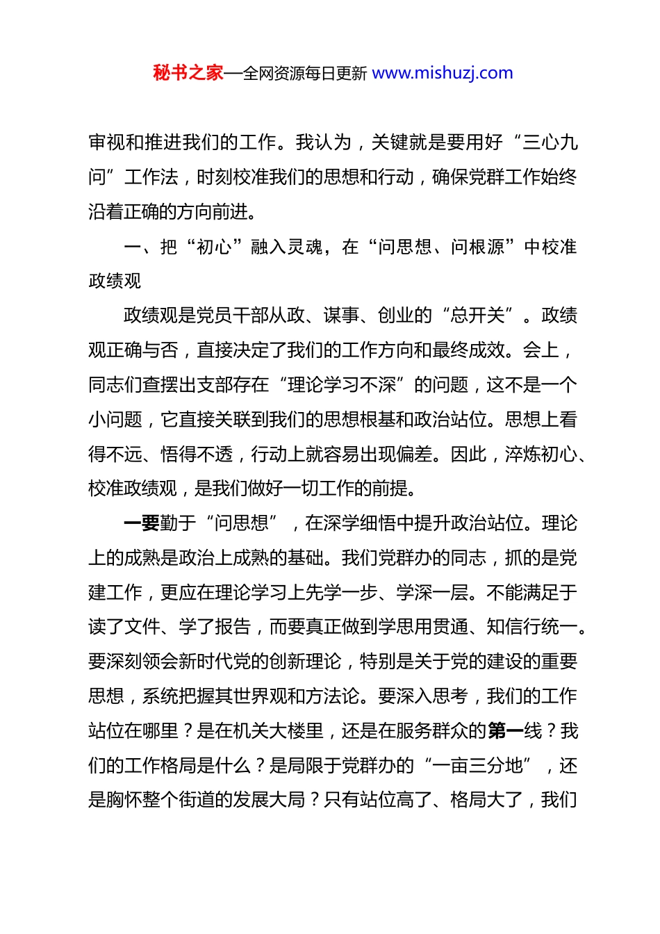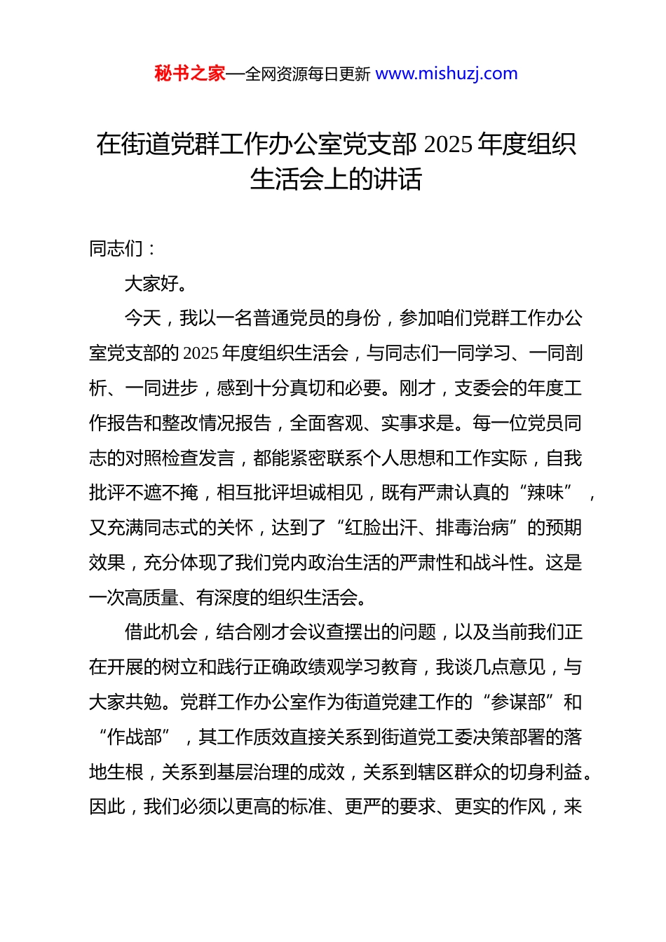 秘书之家—全网资源每日更新 www.mishuzj.com在街道党群工作办公室党支部 2025 年度组织生活会上的讲话 同志们:大家好。今天,我以一名普通党员的身份,参加咱们党群工作办公室党支部的 2025 年度组织生活会,与同志们一同学习、一同剖析、一同进步,感到十分真切和必要。刚才,支委会的年度工作报告和整改情况报告,全面客观、实事求是。每一位党员同志的对照检查发言,都能紧密联系个人思想和工作实际,自我批评不遮不掩,相互批评坦诚相见,既有严肃认真的“辣味”,又充满同志式的关怀,达到了“红脸出汗、排毒治病”的预期效果,充分体现了我们党内政治生活的严肃性和战斗性。这是一次高质量、有深度的组织生活会。借此机会,结合刚才会议查摆出的问题,以及当前我们正在开展的树立和践行正确政绩观学习教育,我谈几点意见,与大家共勉。党群工作办公室作为街道党建工作的“参谋部”和“作战部”,其工作质效直接关系到街道党工委决策部署的落地生根,关系到基层治理的成效,关系到辖区群众的切身利益。因此,我们必须以更高的标准、更严的要求、更实的作风,来秘书之家—全网资源每日更新 www.mishuzj.com审视和推进我们的工作。我认为,关键就是要用好“三心九问”工作法,时刻校准我们的思想和行动,确保党群工作始终沿着正确的方向前进。一、把“初心”融入灵魂,在“问思想、问根源”中校准政绩观政绩观是党员干部从政、谋事、创业的“总开关”。政绩观正确与否,直接决定了我们的工作方向和最终成效。会上,同志们查摆出支部存在“理论学习不深”的问题,这不是一个小问题,它直接关联到我们的思想根基和政治站位。思想上看得不远、悟得不透,行动上就容易出现偏差。因此,淬炼初心、校准政绩观,是我们做好一切工作的前提。一要勤于“问思想”,在深学细悟中提升政治站位。理论上的成熟是政治上成熟的基础。我们党群办的同志,抓的是党建工作,更应在理论学习上先学一步、学深一层。不能满足于读了文件、学了报告,而要真正做到学思用贯通、知信行统一。要深刻领会新时代党的创新理论,特别是关于党的建设的重要思想,系统把握其世界观和方法论。要深入思考,我们的工作站位在哪里?是在机关大楼里,还是在服务群众的第一线?我们的工作格局是什么?是局限于党群办的“一亩三分地”,还是胸怀整个街道的发展大局?只有站位高了、格局大了,我们秘书之家—全网资源每日更新 www.mishuzj.com才能深刻认清党群办公室主抓街道党建工作的核心职能,确保我们的每一项工作部署,都精准契合上级要求、紧密服务中心大局、深切回应群众期盼。二要善于“问根源”,在正本清源中筑牢党性根基。我们党来自人民、植根人民、服务人民。践行正确政绩观,最根本的就是要解决好“为了谁、依靠谁、我是谁”这三个根本性问题。一是必须时刻叩问“为了谁”。我们手中的权力、所做的工作,是为了人民群众的幸福生活。我们推动的每一个党建项目,打造的每一个党建品牌,最终的落脚点都应该是让 XX 街道的百姓拥有更多的获得感、幸福感、安全感。任何脱离这个根本目的的“政绩”,都是虚假的、不可持续的。二是必须时刻叩问“依靠谁”。群众是真正的英雄。我们党最大的政治优势是密切联系群众。党群工作如果关起门来搞,坐而论道,必定会脱离实际、走入死胡同。要始终坚持从群众中来、到群众中去的根本工作路线,把群众的智慧和力量作为我们开展工作的力量源泉。三是必须时刻叩问“我是谁”。要时刻牢记自己的第一身份是共产党员,第一职责是为党工作。要不断加强党性锤炼,在严肃的党内政治生活中砥砺品格,在艰苦的工作实践中磨砺秘书之家—全网资源每日更新 www.mishuzj.com意志,永葆共产党员的政治本色。二、把“民心”刻在心上,在“问需求、问实效”中检验政绩观民心是最大的政治。我们工作的成效好不好,不能自己说了算,要由群众来评价,由实践来检验。这次会议查摆出的“服务群众质效不高”问题,根子就在于我们与群众的联系还不够紧密,对群众的需求把握还不够精准。“政绩”二字,离了“民心”这个内核,就失去了应有的分量和光彩。一要带着真心“问需求”,在深入基层...