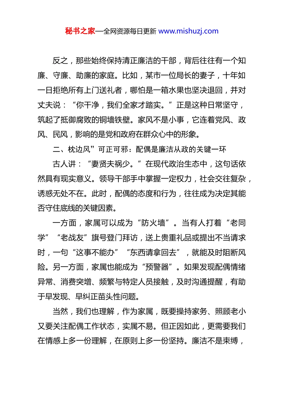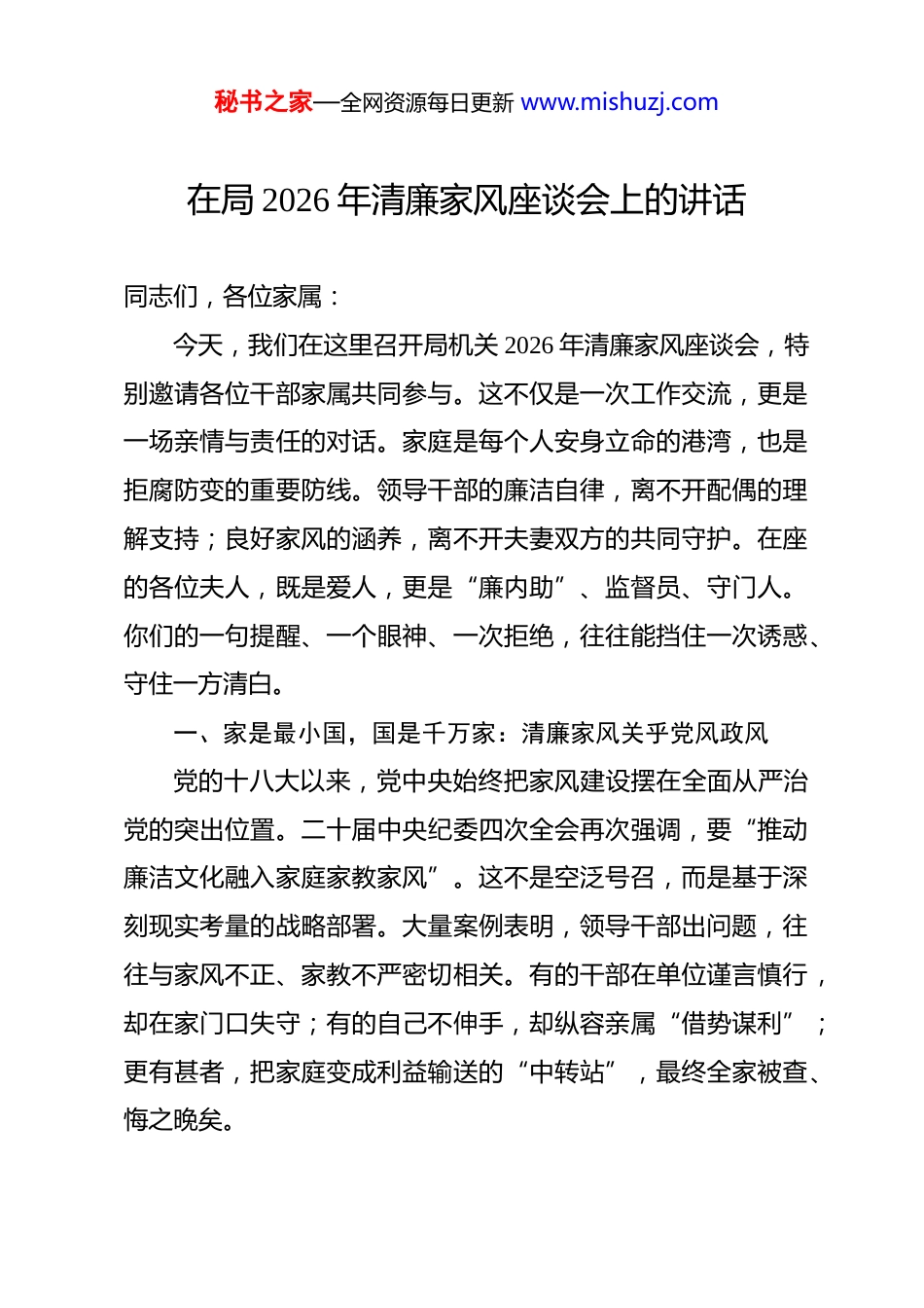 秘书之家—全网资源每日更新 www.mishuzj.com在局 2026 年清廉家风座谈会上的讲话 同志们,各位家属:今天,我们在这里召开局机关 2026 年清廉家风座谈会,特别邀请各位干部家属共同参与。这不仅是一次工作交流,更是一场亲情与责任的对话。家庭是每个人安身立命的港湾,也是拒腐防变的重要防线。领导干部的廉洁自律,离不开配偶的理解支持;良好家风的涵养,离不开夫妻双方的共同守护。在座的各位夫人,既是爱人,更是“廉内助”、监督员、守门人。你们的一句提醒、一个眼神、一次拒绝,往往能挡住一次诱惑、守住一方清白。一、家是最小国,国是千万家:清廉家风关乎党风政风党的十八大以来,党中央始终把家风建设摆在全面从严治党的突出位置。二十届中央纪委四次全会再次强调,要“推动廉洁文化融入家庭家教家风”。这不是空泛号召,而是基于深刻现实考量的战略部署。大量案例表明,领导干部出问题,往往与家风不正、家教不严密切相关。有的干部在单位谨言慎行,却在家门口失守;有的自己不伸手,却纵容亲属“借势谋利”;更有甚者,把家庭变成利益输送的“中转站”,最终全家被查、悔之晚矣。秘书之家—全网资源每日更新 www.mishuzj.com反之,那些始终保持清正廉洁的干部,背后往往有一个知廉、守廉、助廉的家庭。比如,某市一位局长的妻子,十年如一日拒绝所有上门送礼者,哪怕是一箱水果也坚决退回,并对丈夫说:“你干净,我们全家才踏实。”正是这种日常坚守,筑起了抵御腐败的铜墙铁壁。家风不是小事,它连着党风、政风、民风,影响的是党和政府在群众心中的形象。二、枕边风”可正可邪:配偶是廉洁从政的关键一环古人讲:“妻贤夫祸少。”在现代政治生态中,这句话依然具有现实意义。领导干部手中掌握一定权力,社会交往复杂,诱惑无处不在。此时,配偶的态度和行为,往往成为决定其能否守住底线的关键因素。一方面,家属可以成为“防火墙”。当有人打着“老同学”“老战友”旗号登门拜访,送上贵重礼品或提出不当请求时,一句“这事不能办”“东西请拿回去”,就能及时阻断风险。另一方面,家属也能成为“预警器”。如果发现配偶情绪异常、消费突增、频繁与特定人员接触,及时沟通提醒,有助于早发现、早纠正苗头性问题。当然,我们也理解,作为家属,既要操持家务、照顾老小又要关注配偶工作状态,实属不易。但正因如此,更需要我们在情感上多一份理解,在原则上多一份坚持。廉洁不是束缚,秘书之家—全网资源每日更新 www.mishuzj.com而是对家庭最深沉的保护。一时的“通融”可能换来长久的悔恨,而坚定的“拒绝”才能换来一生的安宁。三、共建“廉之家”:让清廉成为家庭生活的底色清廉家风不是高高在上的道德说教,而是融入日常的生活方式。它体现在——一是合理消费不攀比。不追求奢侈品牌,不盲目跟风高消费,量入为出、勤俭持家;二是社交往来有分寸。不参与可能影响公正执行公务的宴请、聚会,不与管理服务对象建立私人利益关系;三是教育子女重品行。不炫耀父母职位,不利用家庭资源谋取特殊照顾,引导孩子靠努力赢得未来;四是重大事项共商量。涉及房产购置、投资理财、亲属就业等敏感问题,夫妻坦诚沟通,避免一人独断酿成隐患。局机关近年来持续开展“家庭助廉”活动,包括发放《致家属的一封信》、组织参观廉政教育基地、举办“廉洁家书”征集等。这些举措旨在搭建组织与家庭之间的桥梁,形成内外联动的监督合力。我们也鼓励各位家属主动了解党风廉政相关要求,熟悉纪律红线,做到心中有数、行动有界。四、组织与家庭同向发力:织密廉洁防护网局党组始终认为,关心干部不仅要关心其工作表现,更要秘书之家—全网资源每日更新 www.mishuzj.com关心其家庭状况。我们将进一步完善三项机制:一是家访机制常态化。由分管领导定期走访干部家庭,既传递组织温暖,也了解家风情况;二是信息互通机制。对干部个人有关事项报告中涉及配偶子女的内容,加强核查与反馈;三是关爱帮扶机制。对因坚持原则而遭遇困难的家庭,给予必要支持,不让老实人吃亏。同时,我们也希望各位家属继续当好“三员”:——当好“宣传员”,向亲友传播廉洁理念,抵制歪风邪气;—...