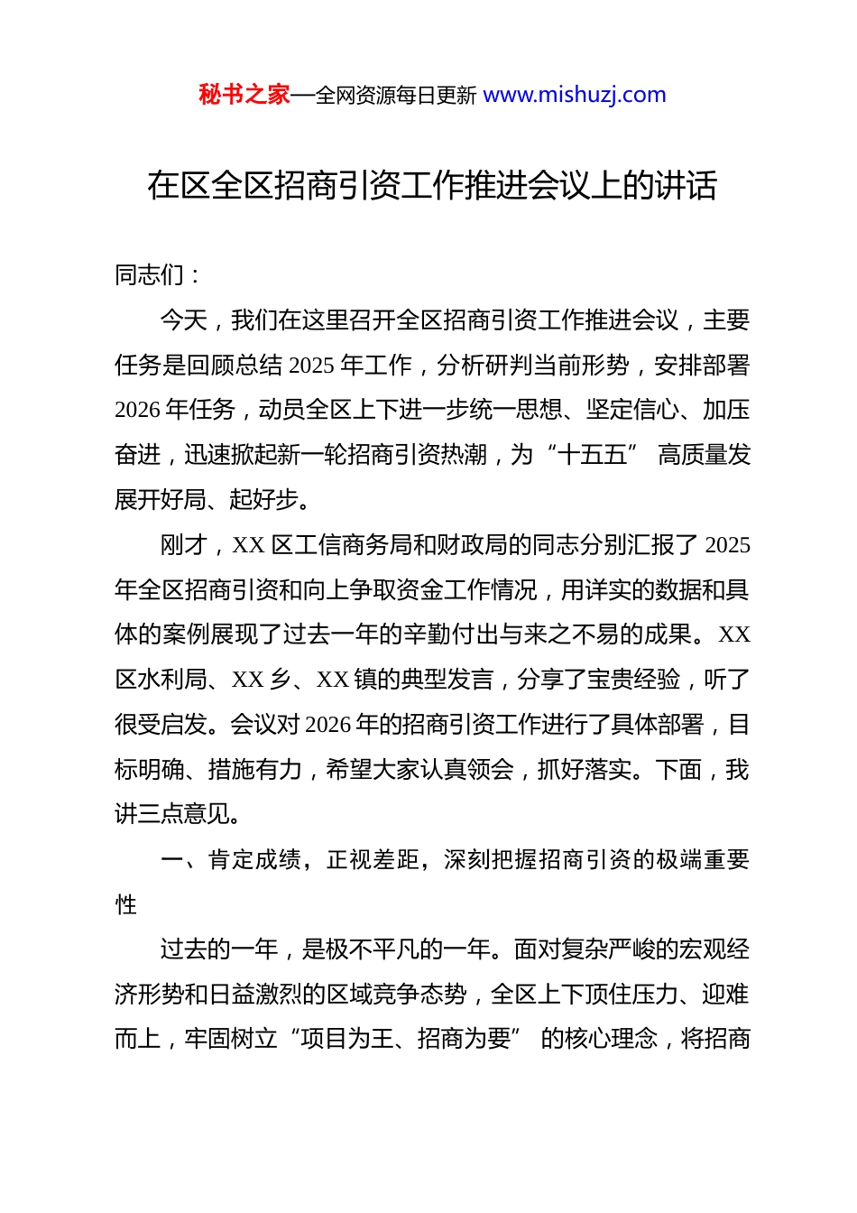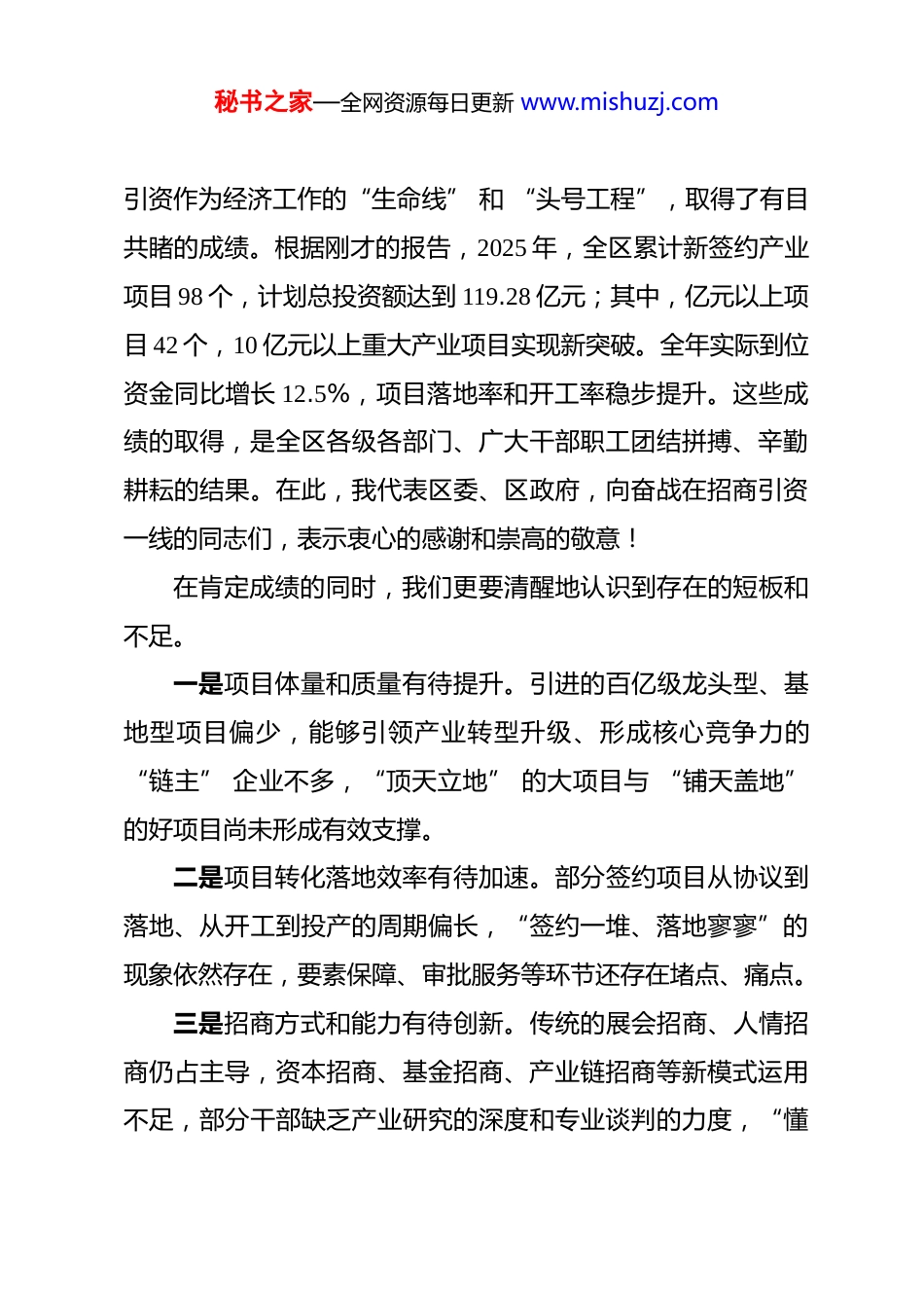 秘书之家—全网资源每日更新 www.mishuzj.com在区全区招商引资工作推进会议上的讲话 同志们:今天,我们在这里召开全区招商引资工作推进会议,主要任务是回顾总结 2025 年工作,分析研判当前形势,安排部署2026 年任务,动员全区上下进一步统一思想、坚定信心、加压奋进,迅速掀起新一轮招商引资热潮,为“十五五” 高质量发展开好局、起好步。刚才,XX 区工信商务局和财政局的同志分别汇报了 2025年全区招商引资和向上争取资金工作情况,用详实的数据和具体的案例展现了过去一年的辛勤付出与来之不易的成果。XX区水利局、XX 乡、XX 镇的典型发言,分享了宝贵经验,听了很受启发。会议对 2026 年的招商引资工作进行了具体部署,目标明确、措施有力,希望大家认真领会,抓好落实。下面,我讲三点意见。一、肯定成绩,正视差距,深刻把握招商引资的极端重要性过去的一年,是极不平凡的一年。面对复杂严峻的宏观经济形势和日益激烈的区域竞争态势,全区上下顶住压力、迎难而上,牢固树立“项目为王、招商为要” 的核心理念,将招商秘书之家—全网资源每日更新 www.mishuzj.com引资作为经济工作的“生命线” 和 “头号工程”,取得了有目共睹的成绩。根据刚才的报告,2025 年,全区累计新签约产业项目 98 个,计划总投资额达到 119.28 亿元;其中,亿元以上项目 42 个,10 亿元以上重大产业项目实现新突破。全年实际到位资金同比增长 12.5%,项目落地率和开工率稳步提升。这些成绩的取得,是全区各级各部门、广大干部职工团结拼搏、辛勤耕耘的结果。在此,我代表区委、区政府,向奋战在招商引资一线的同志们,表示衷心的感谢和崇高的敬意!在肯定成绩的同时,我们更要清醒地认识到存在的短板和不足。一是项目体量和质量有待提升。引进的百亿级龙头型、基地型项目偏少,能够引领产业转型升级、形成核心竞争力的“链主” 企业不多,“顶天立地” 的大项目与 “铺天盖地”的好项目尚未形成有效支撑。二是项目转化落地效率有待加速。部分签约项目从协议到落地、从开工到投产的周期偏长,“签约一堆、落地寥寥”的现象依然存在,要素保障、审批服务等环节还存在堵点、痛点。三是招商方式和能力有待创新。传统的展会招商、人情招商仍占主导,资本招商、基金招商、产业链招商等新模式运用不足,部分干部缺乏产业研究的深度和专业谈判的力度,“懂秘书之家—全网资源每日更新 www.mishuzj.com产业、通政策、善谈判、能落地”的复合型招商人才队伍亟待加强。同志们,招商引资是经济工作的永恒主题,是区域发展的源头活水。抓招商就是抓发展,谋项目就是谋未来。当前,我们正处在“十五五”规划开局起步的关键节点,推动经济社会高质量发展,比以往任何时候都更加需要强有力的项目支撑。全区上下必须把思想和行动统一到区委、区政府的决策部署上来,深刻认识到招商引资是稳定经济增长的“压舱石”,是调整产业结构的 “动力源”,是增强发展后劲的“生命线”,必须以 “坐不住” 的紧迫感、“等不起”的责任感、“慢不得” 的危机感,全力以赴投入到这场事关全局的攻坚战中。二、聚焦重点,精准发力,奋力开创招商引资的崭新局面做好 2026 年的招商引资工作,必须坚持目标导向和问题导向相结合,既要仰望星空,也要脚踏实地,在精准、创新、落实上狠下功夫,确保取得实实在在的成效。全年力争实现招商引资到位资金突破 50 亿元,新签约亿元以上产业项目超过 100个,其中 10 亿元以上项目不少于 5 个。为实现这一目标,必须抓好以下三个方面工作。第一个方面,突出产业链条,在“精准招引” 上实现新突破招商引资不能再搞“大水漫灌”“捡到篮里都是菜”,必须秘书之家—全网资源每日更新 www.mishuzj.com摒弃粗放模式,转向精准滴灌。要围绕产业重点、政策导向和自身资源优势,按图索骥,靶向出击,提高招商引资的成功率和匹配度。一要聚焦产业地图精准定位。要立足我区产业基础,锚定高端装备制造、新材料、电子信息、大健康食品、现代服务业等五大经济发展主攻方向,加快完善产业链招商地图和产业生态发展路径图。各产业招商专班要深入研究产业链...