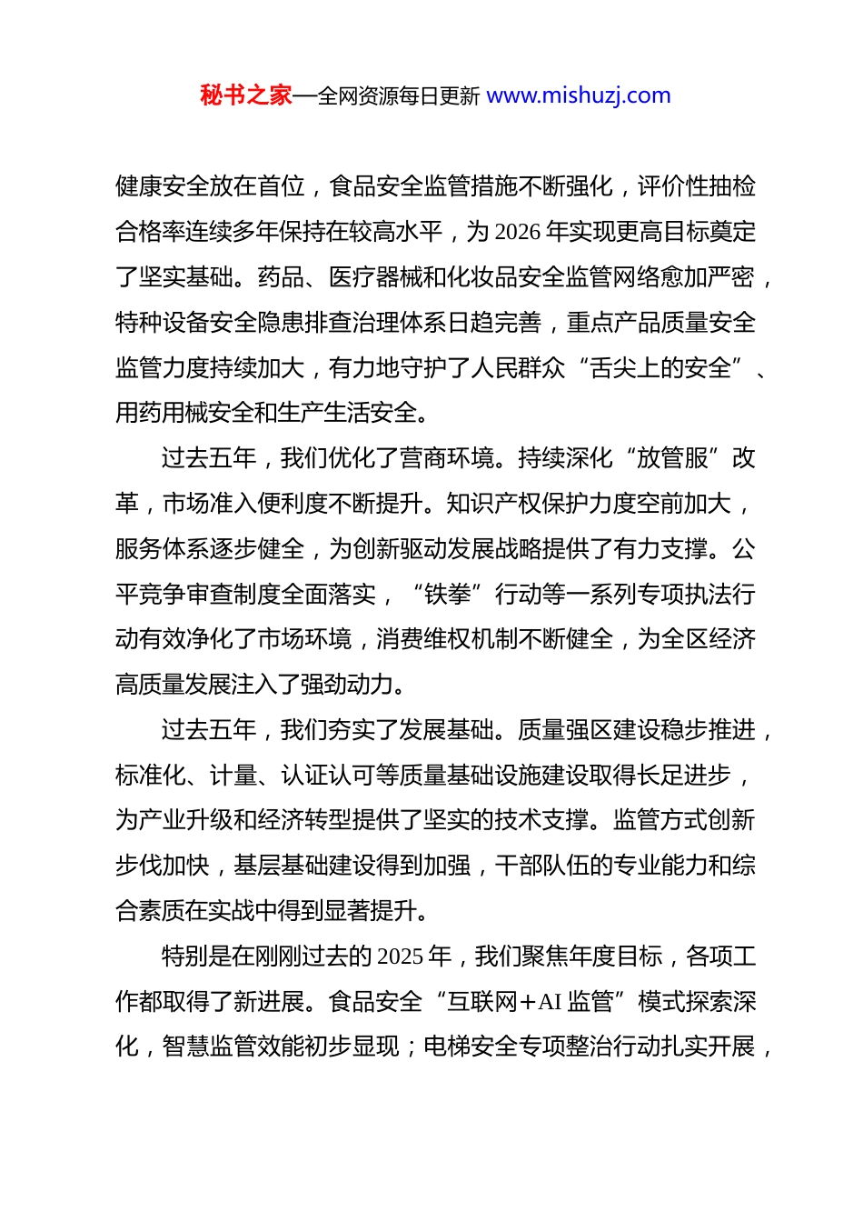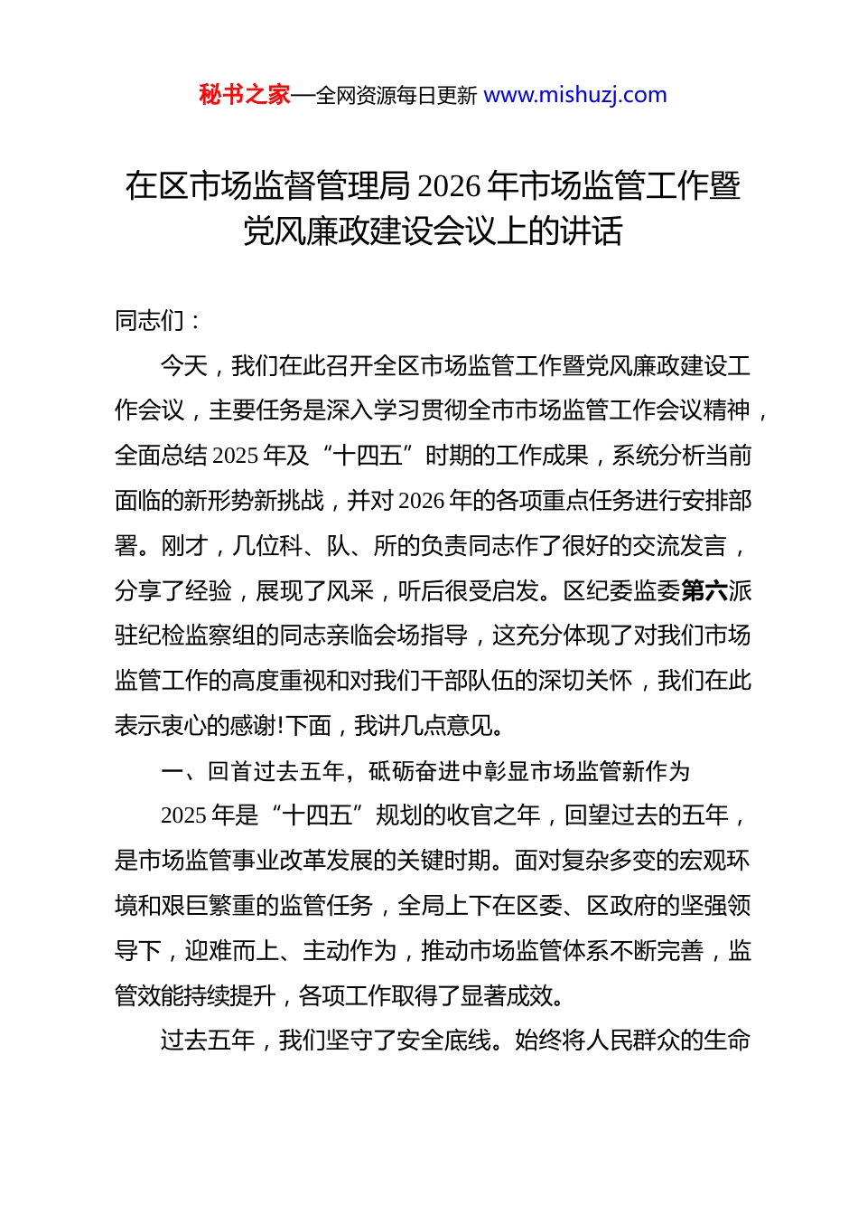 秘书之家—全网资源每日更新 www.mishuzj.com在区市场监督管理局 2026 年市场监管工作暨党风廉政建设会议上的讲话 同志们:今天,我们在此召开全区市场监管工作暨党风廉政建设工作会议,主要任务是深入学习贯彻全市市场监管工作会议精神,全面总结 2025 年及“十四五”时期的工作成果,系统分析当前面临的新形势新挑战,并对 2026 年的各项重点任务进行安排部署。刚才,几位科、队、所的负责同志作了很好的交流发言,分享了经验,展现了风采,听后很受启发。区纪委监委第六派驻纪检监察组的同志亲临会场指导,这充分体现了对我们市场监管工作的高度重视和对我们干部队伍的深切关怀,我们在此表示衷心的感谢!下面,我讲几点意见。一、回首过去五年,砥砺奋进中彰显市场监管新作为2025 年是“十四五”规划的收官之年,回望过去的五年,是市场监管事业改革发展的关键时期。面对复杂多变的宏观环境和艰巨繁重的监管任务,全局上下在区委、区政府的坚强领导下,迎难而上、主动作为,推动市场监管体系不断完善,监管效能持续提升,各项工作取得了显著成效。过去五年,我们坚守了安全底线。始终将人民群众的生命秘书之家—全网资源每日更新 www.mishuzj.com健康安全放在首位,食品安全监管措施不断强化,评价性抽检合格率连续多年保持在较高水平,为 2026 年实现更高目标奠定了坚实基础。药品、医疗器械和化妆品安全监管网络愈加严密,特种设备安全隐患排查治理体系日趋完善,重点产品质量安全监管力度持续加大,有力地守护了人民群众“舌尖上的安全”、用药用械安全和生产生活安全。过去五年,我们优化了营商环境。持续深化“放管服”改革,市场准入便利度不断提升。知识产权保护力度空前加大,服务体系逐步健全,为创新驱动发展战略提供了有力支撑。公平竞争审查制度全面落实,“铁拳”行动等一系列专项执法行动有效净化了市场环境,消费维权机制不断健全,为全区经济高质量发展注入了强劲动力。过去五年,我们夯实了发展基础。质量强区建设稳步推进,标准化、计量、认证认可等质量基础设施建设取得长足进步,为产业升级和经济转型提供了坚实的技术支撑。监管方式创新步伐加快,基层基础建设得到加强,干部队伍的专业能力和综合素质在实战中得到显著提升。特别是在刚刚过去的 2025 年,我们聚焦年度目标,各项工作都取得了新进展。食品安全“互联网+AI 监管”模式探索深化,智慧监管效能初步显现;电梯安全专项整治行动扎实开展,秘书之家—全网资源每日更新 www.mishuzj.com守住了特种设备安全运行的生命线;知识产权成果转化服务更加精准,公平竞争与消费维权机制运行更为顺畅。这些成绩的取得,是区委、区政府正确领导的结果,是全局干部职工团结拼搏、无私奉献的结果。在此,我代表局党组,向全体同志们表示诚挚的感谢和崇高的敬意!在肯定成绩的同时,我们必须清醒地认识到,对标新时代高质量发展的新要求,对标人民群众对美好生活的新期待,我们的工作还存在一些短板和不足。例如,智慧监管的应用深度和广度仍有待拓展,部分领域安全风险隐患依然存在,干部队伍的专业化、复合型能力还需要进一步加强,党风廉-政建设的长期性、复杂性、艰巨性要求我们必须时刻保持警醒。这些问题,我们必须在今后的工作中高度重视,并采取有力措施,切实加以解决。二、认清当前形势,在时代变局中把握市场监管新方位2026 年是实施“十五五”规划的开局之年,也是推进市场监管现代化的关键一年。做好今年的工作,对于开好局、起好步至关重要。我们必须胸怀“国之大者”,准确识变、科学应变、主动求变,深刻认识和把握当前市场监管工作面临的新形势、新任务。从宏观层面看,高质量发展是全面建设社会主义现代化国秘书之家—全网资源每日更新 www.mishuzj.com家的首要任务。市场监管作为维护市场秩序、激发市场活力、保障和改善民生的重要职能部门,在服务构建新发展格局、推动高质量发展中肩负着不可替代的重要使命。中央和省、市对市场监管工作提出了一系列新要求,强调要统筹发展和安全,深化改革创新,这为我们指明了前进方向,也对我们的工作标准和能力水平提出了更高要求。从...