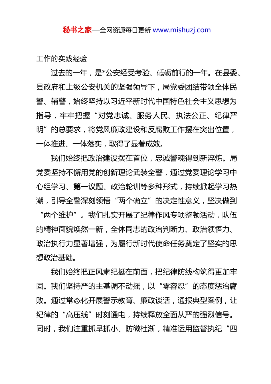 秘书之家—全网资源每日更新 www.mishuzj.com在全局 2026 年党风廉政建设暨廉政警示教育月动员部署会上的讲话 同志们:今天,我们在这里召开全局党风廉政建设暨廉政警示教育月动员部署会,主要任务是深入学习贯彻习近平总书记在二十届中央纪委五次全会上的重要讲话精神,全面落实省、市、县纪委全会和全国、全省、全市公安机关党风廉政建设会议的各项部署要求,总结回顾我局 2025 年的党风廉政建设工作,深刻分析当前我们面临的形势与挑战,并对 2026 年全局党风廉政建设工作和即将开展的“廉政警示教育月”活动进行全面动员和安排部署。刚才,*同志主持会议,介绍了会议议程,希望大家认真领会,抓好落实。参加今天会议的有在家的局领导、局属各单位双正职以及除值班执勤外的全体民警、事业人员、流动人口协管员,可以说,这是一次覆盖全局、关乎全局的重要会议。全局上下要进一步统一思想、提高认识、明确任务、压实责任,以更加坚定的决心、更加有力的举措,推动全面从严管党治警向纵深发展,为开创新时代*公安工作新局面提供坚强有力的纪律作风保障。下面,我讲三点意见。一、回顾过去,肯定成绩,深刻总结 2025 年党风廉政建设秘书之家—全网资源每日更新 www.mishuzj.com工作的实践经验过去的一年,是*公安经受考验、砥砺前行的一年。在县委、县政府和上级公安机关的坚强领导下,局党委团结带领全体民警、辅警,始终坚持以习近平新时代中国特色社会主义思想为指导,牢牢把握“对党忠诚、服务人民、执法公正、纪律严明”的总要求,将党风廉政建设和反腐败工作摆在突出位置,一体推进、一体落实,取得了显著成效。我们始终把政治建设摆在首位,忠诚警魂得到新淬炼。局党委坚持不懈用党的创新理论武装全警,通过党委理论学习中心组学习、第一议题、政治轮训等多种形式,持续掀起学习热潮,引导全警深刻领悟“两个确立”的决定性意义,坚决做到“两个维护”。我们扎实开展了纪律作风专项整顿活动,队伍的精神面貌焕然一新,全体同志的政治判断力、政治领悟力、政治执行力显著增强,为履行新时代使命任务奠定了坚实的思想政治基础。我们始终把正风肃纪挺在前面,把纪律防线构筑得更加牢固。我们坚持严的主基调不动摇,以“零容忍”的态度惩治腐败。通过常态化开展警示教育、廉政谈话,通报典型案例,让纪律的“高压线”时刻通电,持续释放全面从严的强烈信号。同时,我们注重抓早抓小、防微杜渐,精准运用监督执纪“四秘书之家—全网资源每日更新 www.mishuzj.com种形态”,对苗头性、倾向性问题及时提醒、果断处置,有效防止了小问题演变成大问题。全局民警、辅警的纪律规矩意识明显增强,队伍的纯洁性和战斗力得到有效保障,风清气正的政治生态进一步巩固。我们始终把服务人民作为根本,执法公信力实现新提升。我们聚焦主责主业,严厉打击各类违法犯罪活动,全力维护社会大局稳定,保障人民群众生命财产安全,切实增强了人民群众的安全感。在工作中,我们深入整治执法领域存在的顽瘴痼疾,不断规范执法行为,提升执法办案质效,努力让每一次执法活动都经得起检验。同时,我们积极回应人民群众的新期待,持续深化“放管服”改革,推出一系列便民利企举措,努力让人民群众在每一起案件办理、每一件事情处理中都能感受到公平正义,公安工作的“民生成绩单”更有厚度、更有温度,赢得了社会各界的广泛认可。我们始终把队伍建设作为保障,队伍战斗力获得新增强。过去的一年,我局党委被市委表彰为全市先进基层党组织,多个集体和个人受到了县级以上表彰奖励,这既是上级对我们工作的肯定,更是对我们全体同志辛勤付出的最好褒奖。这些荣誉的取得,充分展现了我们这支队伍昂扬向上的精神风貌和扎实过硬的能力素质,也激励着我们继续砥砺前行,为维护一方秘书之家—全网资源每日更新 www.mishuzj.com平安稳定贡献更大力量。这些成绩的取得,是县委、县政府和上级公安机关正确领导的结果,是全局上下团结一心、顽强拼搏的结果,凝聚着每一位同志的心血和汗水。在此,我代表局党委,向全体民警、事业人员、流动人口协管员及其家属,表示衷心的感谢和崇高的敬意!在肯定成绩...