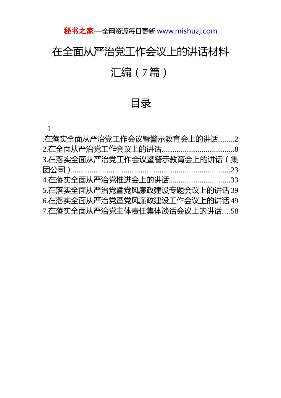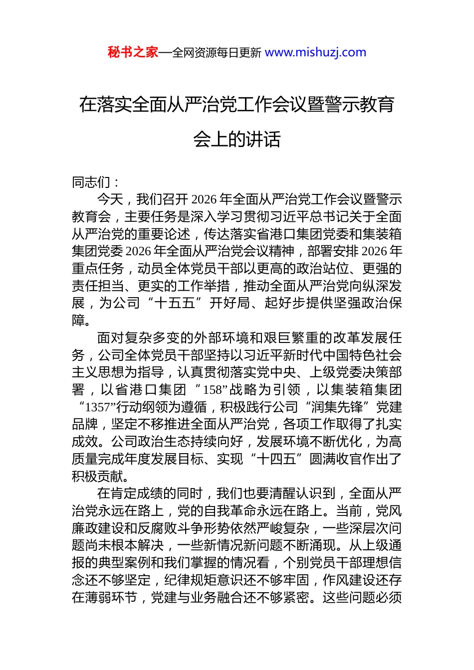 秘书之家—全网资源每日更新 www.mishuzj.com在全面从严治党工作会议上的讲话材料汇编(7 篇)目录1.在落实全面从严治党工作会议暨警示教育会上的讲话........22.在全面从严治党工作会议上的讲话......................................83.在落实全面从严治党工作会议暨警示教育会上的讲话(集团公司)...................................................................................234.在落实全面从严治党推进会上的讲话................................335.在落实全面从严治党暨党风廉政建设专题会议上的讲话 396.在落实全面从严治党暨党风廉政建设工作会议上的讲话 497.在落实全面从严治党主体责任集体谈话会议上的讲话....58秘书之家—全网资源每日更新 www.mishuzj.com在落实全面从严治党工作会议暨警示教育会上的讲话同志们:今天,我们召开 2026 年全面从严治党工作会议暨警示教育会,主要任务是深入学习贯彻习近平总书记关于全面从严治党的重要论述,传达落实省港口集团党委和集装箱集团党委 2026 年全面从严治党会议精神,部署安排 2026 年重点任务,动员全体党员干部以更高的政治站位、更强的责任担当、更实的工作举措,推动全面从严治党向纵深发展,为公司“十五五”开好局、起好步提供坚强政治保障。面对复杂多变的外部环境和艰巨繁重的改革发展任务,公司全体党员干部坚持以习近平新时代中国特色社会主义思想为指导,认真贯彻落实党中央、上级党委决策部署,以省港口集团“ 158”战略为引领,以集装箱集团“1357”行动纲领为遵循,积极践行公司“润集先锋”党建品牌,坚定不移推进全面从严治党,各项工作取得了扎实成效。公司政治生态持续向好,发展环境不断优化,为高质量完成年度发展目标、实现“十四五”圆满收官作出了积极贡献。在肯定成绩的同时,我们也要清醒认识到,全面从严治党永远在路上,党的自我革命永远在路上。当前,党风廉政建设和反腐败斗争形势依然严峻复杂,一些深层次问题尚未根本解决,一些新情况新问题不断涌现。从上级通报的典型案例和我们掌握的情况看,个别党员干部理想信念还不够坚定,纪律规矩意识还不够牢固,作风建设还存在薄弱环节,党建与业务融合还不够紧密。这些问题必须秘书之家—全网资源每日更新 www.mishuzj.com引起我们高度重视,采取有力措施切实加以解决。同志们,刚才我们集中观看了专题警示教育片,片中揭露的违纪违法案例触目惊心、发人深省。这些曾经的领导干部,有的在权力面前迷失方向,有的在金钱面前丧失底线,有的在小节问题上逐步滑向深渊。他们用惨痛教训警示我们,全面从严治党丝毫不能松懈,拒腐防变必须警钟长鸣。全体党员干部要以案为鉴、以案促改,深刻汲取教训,时刻保持清醒头脑,筑牢思想防线,守住纪律底线。2026 年是“十五五”开局之年,也是公司高质量发展的关键之年。做好今年全面从严治党工作,意义重大、责任重大。我们要坚持以习近平新时代中国特色社会主义思想为指导,全面贯彻党的二十大和二十届历次全会精神,深入落实习近平总书记关于全面从严治党的重要论述,按照上级党委部署要求,坚持稳中求进工作总基调,以党的政治建设为统领,全面推进党的各项建设,把严的基调、严的措施、严的氛围长期坚持下去,为公司高质量发展提供坚强保障。围绕 2026 年全面从严治党工作任务,全体党员干部要着重做好以下五个方面工作。第一,凝心铸魂强根基,把准发展“方向盘”。政治建设是党的根本性建设,决定党的建设方向和效果。要坚持把政治建设摆在首位,引导党员干部深刻领悟“两个确立”的决定性意义,增强“四个意识”、坚定“四个自信”、做到“两个维护”,始终在思想上政治上行动上同以习近平同志为核心的党中央保持高度一致。要把学习贯彻习近平新时代中国特色社会主义思想作为首要政治任务,持续深化理论武装,坚持读原著、学原文、悟原理,做到学思用贯通、知信行统一。要严格落实“第一议题”制度,及时跟进学习习近平总书记重要讲话和重要指示批示精神,确保党中央决策部署在公司落地生根、开花结秘书之家—全网资源每日更新 www.mishuzj.com果。要严明政治纪律和...