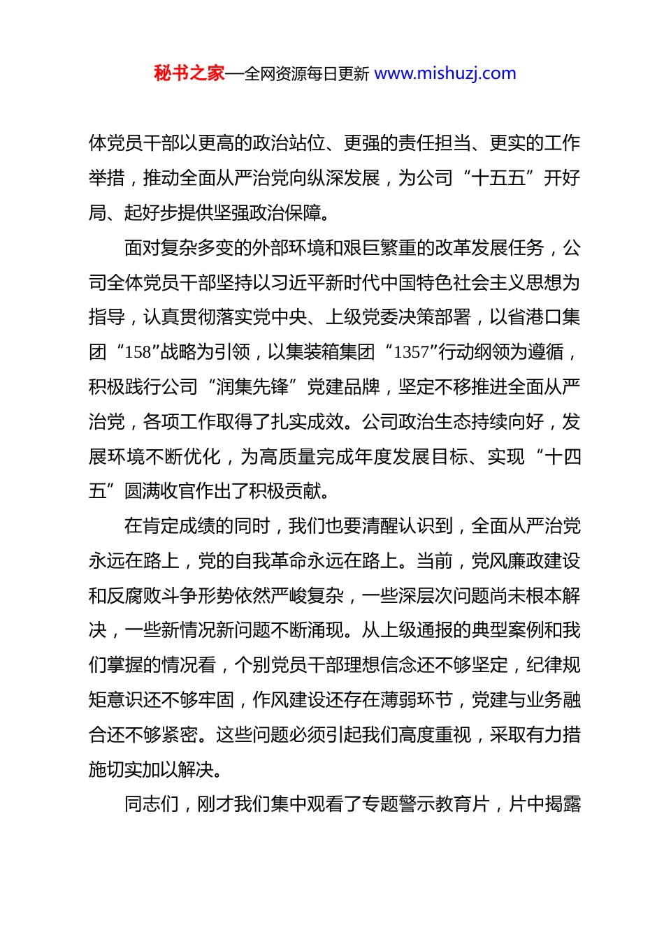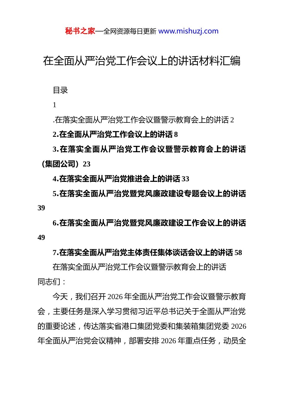 秘书之家—全网资源每日更新 www.mishuzj.com在全面从严治党工作会议上的讲话材料汇编 目录1.在落实全面从严治党工作会议暨警示教育会上的讲话 22.在全面从严治党工作会议上的讲话 83.在落实全面从严治党工作会议暨警示教育会上的讲话(集团公司)234.在落实全面从严治党推进会上的讲话 335.在落实全面从严治党暨党风廉政建设专题会议上的讲话396.在落实全面从严治党暨党风廉政建设工作会议上的讲话497.在落实全面从严治党主体责任集体谈话会议上的讲话 58在落实全面从严治党工作会议暨警示教育会上的讲话同志们:今天,我们召开 2026 年全面从严治党工作会议暨警示教育会,主要任务是深入学习贯彻习近平总书记关于全面从严治党的重要论述,传达落实省港口集团党委和集装箱集团党委 2026年全面从严治党会议精神,部署安排 2026 年重点任务,动员全秘书之家—全网资源每日更新 www.mishuzj.com体党员干部以更高的政治站位、更强的责任担当、更实的工作举措,推动全面从严治党向纵深发展,为公司“十五五”开好局、起好步提供坚强政治保障。面对复杂多变的外部环境和艰巨繁重的改革发展任务,公司全体党员干部坚持以习近平新时代中国特色社会主义思想为指导,认真贯彻落实党中央、上级党委决策部署,以省港口集团“158”战略为引领,以集装箱集团“1357”行动纲领为遵循,积极践行公司“润集先锋”党建品牌,坚定不移推进全面从严治党,各项工作取得了扎实成效。公司政治生态持续向好,发展环境不断优化,为高质量完成年度发展目标、实现“十四五”圆满收官作出了积极贡献。在肯定成绩的同时,我们也要清醒认识到,全面从严治党永远在路上,党的自我革命永远在路上。当前,党风廉政建设和反腐败斗争形势依然严峻复杂,一些深层次问题尚未根本解决,一些新情况新问题不断涌现。从上级通报的典型案例和我们掌握的情况看,个别党员干部理想信念还不够坚定,纪律规矩意识还不够牢固,作风建设还存在薄弱环节,党建与业务融合还不够紧密。这些问题必须引起我们高度重视,采取有力措施切实加以解决。同志们,刚才我们集中观看了专题警示教育片,片中揭露秘书之家—全网资源每日更新 www.mishuzj.com的违纪违法案例触目惊心、发人深省。这些曾经的领导干部,有的在权力面前迷失方向,有的在金钱面前丧失底线,有的在小节问题上逐步滑向深渊。他们用惨痛教训警示我们,全面从严治党丝毫不能松懈,拒腐防变必须警钟长鸣。全体党员干部要以案为鉴、以案促改,深刻汲取教训,时刻保持清醒头脑,筑牢思想防线,守住纪律底线。2026 年是“十五五”开局之年,也是公司高质量发展的关键之年。做好今年全面从严治党工作,意义重大、责任重大。我们要坚持以习近平新时代中国特色社会主义思想为指导,全面贯彻党的二十大和二十届历次全会精神,深入落实习近平总书记关于全面从严治党的重要论述,按照上级党委部署要求,坚持稳中求进工作总基调,以党的政治建设为统领,全面推进党的各项建设,把严的基调、严的措施、严的氛围长期坚持下去,为公司高质量发展提供坚强保障。围绕 2026 年全面从严治党工作任务,全体党员干部要着重做好以下五个方面工作。第一,凝心铸魂强根基,把准发展“方向盘”。政治建设是党的根本性建设,决定党的建设方向和效果。要坚持把政治建设摆在首位,引导党员干部深刻领悟“两个确立”的决定性意义,增强“四个意识”、坚定“四个自信”、做到“两个维秘书之家—全网资源每日更新 www.mishuzj.com护”,始终在思想上政治上行动上同以习近平同志为核心的党中央保持高度一致。要把学习贯彻习近平新时代中国特色社会主义思想作为首要政治任务,持续深化理论武装,坚持读原著、学原文、悟原理,做到学思用贯通、知信行统一。要严格落实“第一议题”制度,及时跟进学习习近平总书记重要讲话和重要指示批示精神,确保党中央决策部署在公司落地生根、开花结果。要严明政治纪律和政治规矩,坚决防止“七个有之”,做到“五个必须”,确保党的路线方针政策不折不扣贯彻执行。要把政治标准贯穿干部选拔任用全过程,突出政治忠诚、政治定力、政治担当、政治能力、政治...