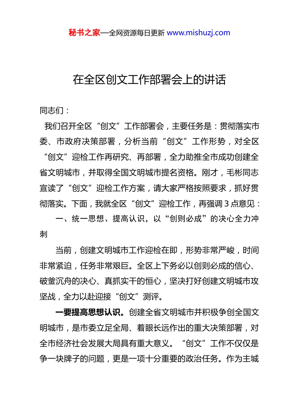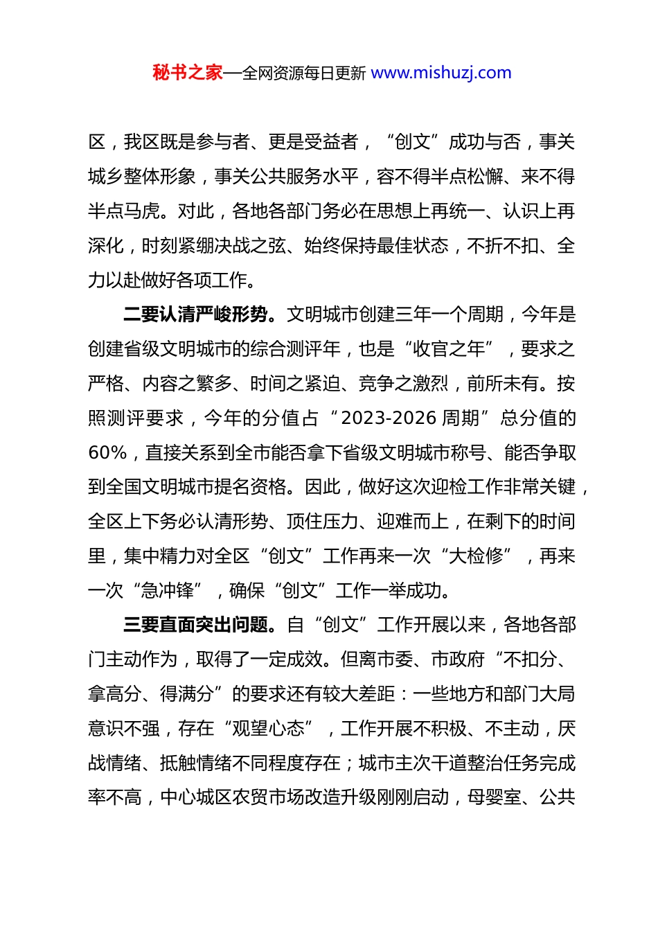 秘书之家—全网资源每日更新 www.mishuzj.com在全区创文工作部署会上的讲话同志们: 我们召开全区“创文”工作部署会,主要任务是:贯彻落实市委、市政府决策部署,分析当前“创文”工作形势,对全区“创文”迎检工作再研究、再部署,全力助推全市成功创建全省文明城市,并取得全国文明城市提名资格。刚才,毛彬同志宣读了“创文”迎检工作方案,请大家严格按照要求,抓好贯彻落实。下面,我就全区“创文”迎检工作,再强调 3 点意见:一、统一思想、提高认识,以“创则必成”的决心全力冲刺当前,创建文明城市工作迎检在即,形势非常严峻,时间非常紧迫,任务非常艰巨。全区上下务必以创则必成的信心、破釜沉舟的决心、真抓实干的恒心,坚决打好创建文明城市攻坚战,全力以赴迎接“创文”测评。一要提高思想认识。创建全省文明城市并积极争创全国文明城市,是市委立足全局、着眼长远作出的重大决策部署,对全市经济社会发展大局具有重大意义。“创文”工作不仅仅是争一块牌子的问题,更是一项十分重要的政治任务。作为主城秘书之家—全网资源每日更新 www.mishuzj.com区,我区既是参与者、更是受益者,“创文”成功与否,事关城乡整体形象,事关公共服务水平,容不得半点松懈、来不得半点马虎。对此,各地各部门务必在思想上再统一、认识上再深化,时刻紧绷决战之弦、始终保持最佳状态,不折不扣、全力以赴做好各项工作。二要认清严峻形势。文明城市创建三年一个周期,今年是创建省级文明城市的综合测评年,也是“收官之年”,要求之严格、内容之繁多、时间之紧迫、竞争之激烈,前所未有。按照测评要求,今年的分值占“2023-2026 周期”总分值的60%,直接关系到全市能否拿下省级文明城市称号、能否争取到全国文明城市提名资格。因此,做好这次迎检工作非常关键,全区上下务必认清形势、顶住压力、迎难而上,在剩下的时间里,集中精力对全区“创文”工作再来一次“大检修”,再来一次“急冲锋”,确保“创文”工作一举成功。三要直面突出问题。自“创文”工作开展以来,各地各部门主动作为,取得了一定成效。但离市委、市政府“不扣分、拿高分、得满分”的要求还有较大差距:一些地方和部门大局意识不强,存在“观望心态”,工作开展不积极、不主动,厌战情绪、抵触情绪不同程度存在;城市主次干道整治任务完成率不高,中心城区农贸市场改造升级刚刚启动,母婴室、公共秘书之家—全网资源每日更新 www.mishuzj.com厕所等基础设施还不完善,“创文”硬件建设进度较为滞后;一些不文明“城市病”久治不愈,占道经营、“牛皮癣”禁而未绝,违规驾驶、乱停乱放等交通违法行为屡禁不止,扬尘治理、噪音污染等“老大难”问题尚未根治,严重影响了我区的整体形象。以上这些问题,必须下大力气,真正从根本上予以解决,决不能因小失大、影响全市“创文”工作大局。二、突出重点、精准发力,以“一鼓作气”的拼劲奋力攻坚第一,要围绕迎检内容,把准关键点位。迎检越到紧要时刻,越要理清思路、掌握方法,决不能眉毛胡子一把抓、忙于应付,必须对照测评点位、分值和要求,客观审视我区点位现状、存在问题,扭住关键、有的放矢。一要攻克重点。要紧扣测评重点内容,突出抓好市场环境、文化环境、生活环境、社会环境等八大环境整治,按照“缺什么补什么”的原则,查找差距、补齐短板。要紧盯主次干道、主要路口、商业街、商场、车站、广场等重点部位,全员下沉、集中攻坚。要聚焦学校、图书馆、文化馆、培训机构、爱国主义教育基地等测评重点单位,扎实抓好迎检工作;其主管部门务必加强统筹、督导,决不能缺位、漏项。二要攻克难点。要对难以覆盖的盲区、难以重视的细节、秘书之家—全网资源每日更新 www.mishuzj.com难以规范的陋习进行收集归纳、分析研究,既要治标、更要治本。特别是对建筑工地、城郊结合部、街头报刊亭、公共厕所、残疾人无障碍设施、出租车服务等点位存在的问题,要有针对性地出重拳、下猛药。即便是一个烟头、一块“牛皮癣”,都要坚持“零容忍”,并除之务尽。三要攻克热点。市民满意率是这次测评的重要指标,若低于 75%,将直接取消参评资格。从当前来看,人...