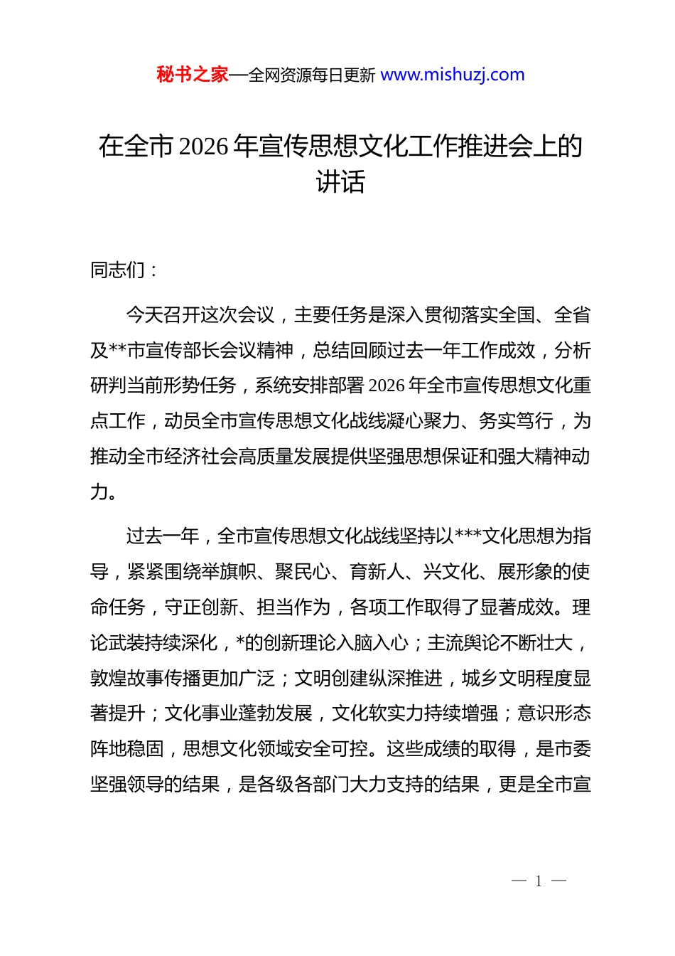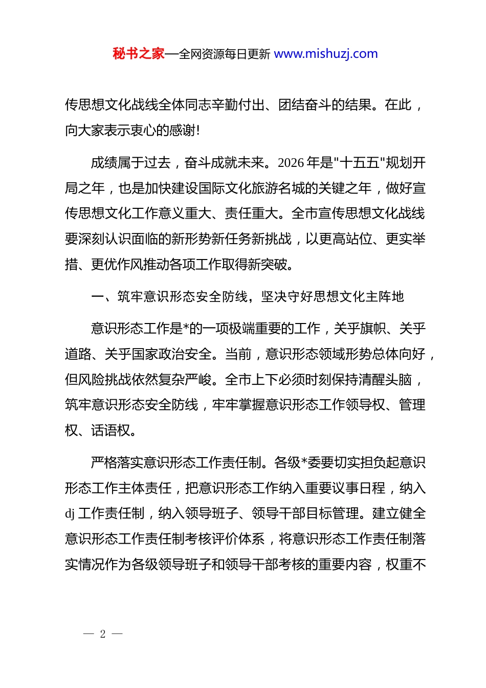 秘书之家—全网资源每日更新 www.mishuzj.com在全市 2026 年宣传思想文化工作推进会上的讲话同志们:今天召开这次会议,主要任务是深入贯彻落实全国、全省及**市宣传部长会议精神,总结回顾过去一年工作成效,分析研判当前形势任务,系统安排部署 2026 年全市宣传思想文化重点工作,动员全市宣传思想文化战线凝心聚力、务实笃行,为推动全市经济社会高质量发展提供坚强思想保证和强大精神动力。过去一年,全市宣传思想文化战线坚持以***文化思想为指导,紧紧围绕举旗帜、聚民心、育新人、兴文化、展形象的使命任务,守正创新、担当作为,各项工作取得了显著成效。理论武装持续深化,*的创新理论入脑入心;主流舆论不断壮大,敦煌故事传播更加广泛;文明创建纵深推进,城乡文明程度显著提升;文化事业蓬勃发展,文化软实力持续增强;意识形态阵地稳固,思想文化领域安全可控。这些成绩的取得,是市委坚强领导的结果,是各级各部门大力支持的结果,更是全市宣— 1 —秘书之家—全网资源每日更新 www.mishuzj.com传思想文化战线全体同志辛勤付出、团结奋斗的结果。在此,向大家表示衷心的感谢!成绩属于过去,奋斗成就未来。2026 年是"十五五"规划开局之年,也是加快建设国际文化旅游名城的关键之年,做好宣传思想文化工作意义重大、责任重大。全市宣传思想文化战线要深刻认识面临的新形势新任务新挑战,以更高站位、更实举措、更优作风推动各项工作取得新突破。一、筑牢意识形态安全防线,坚决守好思想文化主阵地意识形态工作是*的一项极端重要的工作,关乎旗帜、关乎道路、关乎国家政治安全。当前,意识形态领域形势总体向好,但风险挑战依然复杂严峻。全市上下必须时刻保持清醒头脑,筑牢意识形态安全防线,牢牢掌握意识形态工作领导权、管理权、话语权。严格落实意识形态工作责任制。各级*委要切实担负起意识形态工作主体责任,把意识形态工作纳入重要议事日程,纳入dj 工作责任制,纳入领导班子、领导干部目标管理。建立健全意识形态工作责任制考核评价体系,将意识形态工作责任制落实情况作为各级领导班子和领导干部考核的重要内容,权重不— 2 —秘书之家—全网资源每日更新 www.mishuzj.com低于百分之十五。*委主要负责同志要履行好第一责任人职责,带头抓意识形态工作,带头管阵地、把导向、强队伍,做到重要工作亲自部署、重要问题亲自过问、重大事件亲自处置。分管领导要履行好直接责任人职责,协助*委书记抓好统筹协调。班子成员要履行好"一岗双责",抓好分管领域的意识形态工作。强化意识形态阵地管理。坚持主管主办原则,加强对各类意识形态阵地的管理。新闻媒体要坚持正确舆论导向,严格执行三审三校制度,确保新闻宣传政治方向正确、舆论导向鲜明、价值取向健康。互联网是意识形态斗争的主战场,要依法加强网络空间治理,建立健全网络舆情监测预警、研判分析、应对处置机制。去年全市监测上报负面舆情一百五十二条,及时公开情况、正面回应一百三十二条,有效化解了一批网络舆情风险。今年要进一步完善网络舆情应对处置办法和流程,健全网络舆情会商研判机制,提升快速响应、精准处置能力,做到早发现、早研判、早处置、早化解。加强网评员队伍建设,做好网上舆论引导工作,营造清朗网络空间。加强风险排查和研判预警。建立健全意识形态领域风险点排查机制,定期开展风险排查和分析研判。去年全市共梳理出十七个意识形态风险点,建立了风险台账,实行动态跟踪管理。— 3 —秘书之家—全网资源每日更新 www.mishuzj.com今年要持续深化风险排查工作,重点关注意识形态领域苗头性、倾向性问题,加强对敏感热点问题的分析研判,及时预警、妥善应对。健全意识形态领域情况通报制度,定期通报意识形态领域情况,及时向市委报告重大情况。守牢文化安全底线。加强文化市场监管,深入开展"扫黄打非"专项行动,严厉打击各类非法出版物和有害信息。加强对演出市场、娱乐场所、网吧等文化市场的监管,净化社会文化环境。强化对博物馆、图书馆、文化馆等公共文化场所的管理,确保文化阵地安全。加强对重点文化活动的审核把关,严把政治关、内容关、人员关。二、深化...