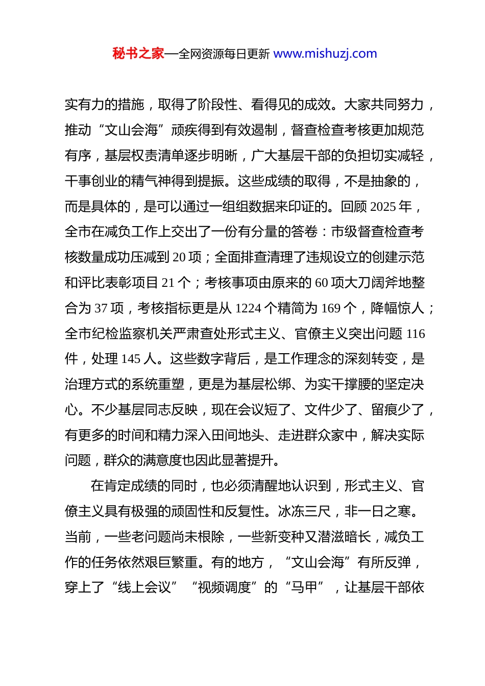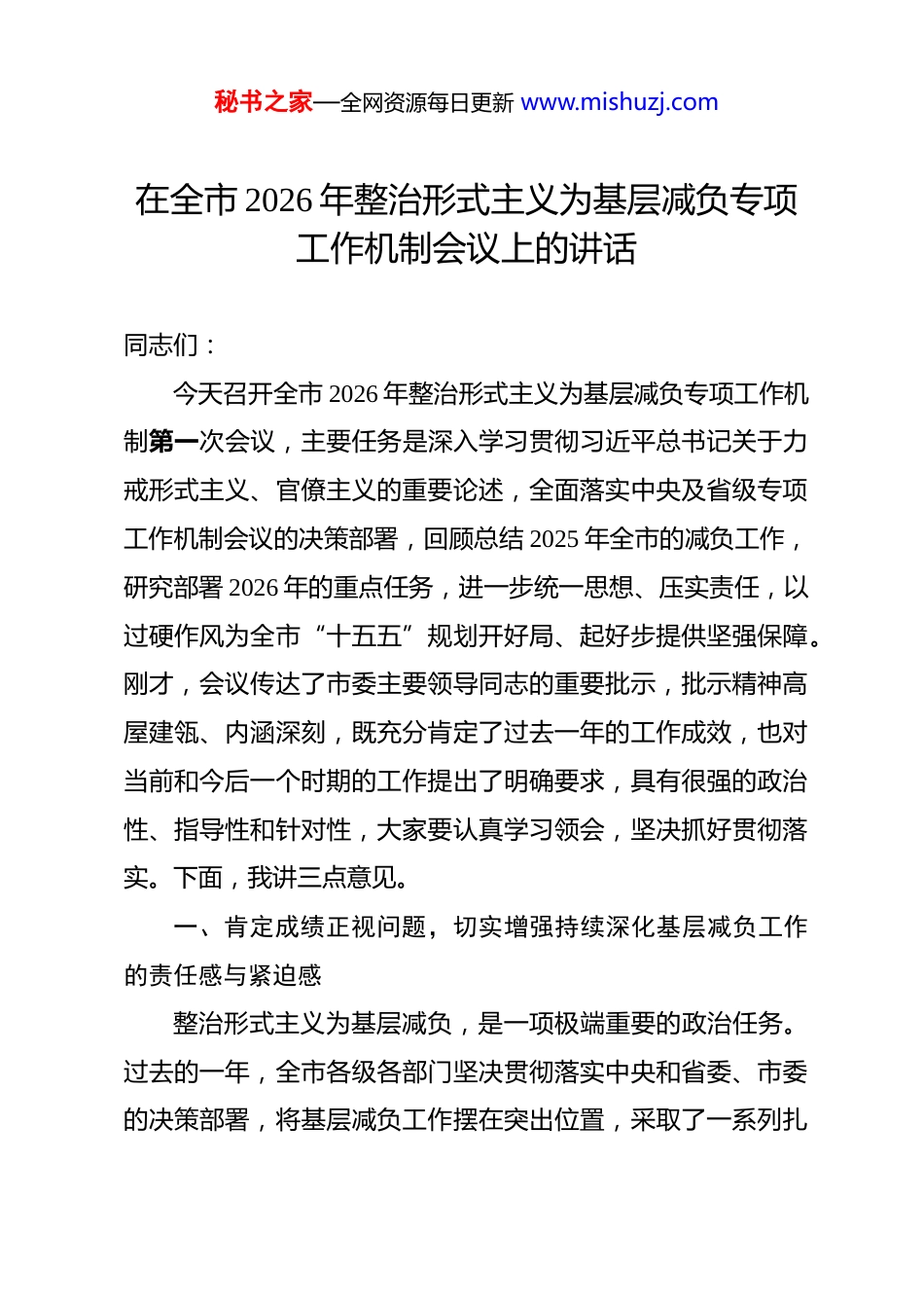 秘书之家—全网资源每日更新 www.mishuzj.com在全市 2026 年整治形式主义为基层减负专项工作机制会议上的讲话 同志们:今天召开全市 2026 年整治形式主义为基层减负专项工作机制第一次会议,主要任务是深入学习贯彻习近平总书记关于力戒形式主义、官僚主义的重要论述,全面落实中央及省级专项工作机制会议的决策部署,回顾总结 2025 年全市的减负工作,研究部署 2026 年的重点任务,进一步统一思想、压实责任,以过硬作风为全市“十五五”规划开好局、起好步提供坚强保障。刚才,会议传达了市委主要领导同志的重要批示,批示精神高屋建瓴、内涵深刻,既充分肯定了过去一年的工作成效,也对当前和今后一个时期的工作提出了明确要求,具有很强的政治性、指导性和针对性,大家要认真学习领会,坚决抓好贯彻落实。下面,我讲三点意见。一、肯定成绩正视问题,切实增强持续深化基层减负工作的责任感与紧迫感整治形式主义为基层减负,是一项极端重要的政治任务。过去的一年,全市各级各部门坚决贯彻落实中央和省委、市委的决策部署,将基层减负工作摆在突出位置,采取了一系列扎秘书之家—全网资源每日更新 www.mishuzj.com实有力的措施,取得了阶段性、看得见的成效。大家共同努力,推动“文山会海”顽疾得到有效遏制,督查检查考核更加规范有序,基层权责清单逐步明晰,广大基层干部的负担切实减轻,干事创业的精气神得到提振。这些成绩的取得,不是抽象的,而是具体的,是可以通过一组组数据来印证的。回顾 2025 年,全市在减负工作上交出了一份有分量的答卷:市级督查检查考核数量成功压减到 20 项;全面排查清理了违规设立的创建示范和评比表彰项目 21 个;考核事项由原来的 60 项大刀阔斧地整合为 37 项,考核指标更是从 1224 个精简为 169 个,降幅惊人;全市纪检监察机关严肃查处形式主义、官僚主义突出问题 116件,处理 145 人。这些数字背后,是工作理念的深刻转变,是治理方式的系统重塑,更是为基层松绑、为实干撑腰的坚定决心。不少基层同志反映,现在会议短了、文件少了、留痕少了,有更多的时间和精力深入田间地头、走进群众家中,解决实际问题,群众的满意度也因此显著提升。在肯定成绩的同时,也必须清醒地认识到,形式主义、官僚主义具有极强的顽固性和反复性。冰冻三尺,非一日之寒。当前,一些老问题尚未根除,一些新变种又潜滋暗长,减负工作的任务依然艰巨繁重。有的地方,“文山会海”有所反弹,穿上了“线上会议”“视频调度”的“马甲”,让基层干部依秘书之家—全网资源每日更新 www.mishuzj.com旧奔波于各种屏幕之间;有的领域,“指尖上的形式主义”愈演愈烈,各类政务 APP、工作群、小程序层出不穷,数据重复填报、强制打卡晒实绩等问题,成为基层干部新的“数字枷锁”;有的单位,对“过度留痕”的依赖根深蒂固,把“有没有记录”等同于“干没干工作”,致使基层干部耗费大量心力制作台账、应付检查,陷入了“事事留痕”的怪圈;还有的干部,政绩观出现偏差,热衷于搞“盆景式”的“形象工程”“政绩工程”,不计成本、不求实效,给地方发展留下隐患,也给基层增加了不必要的负担。更有甚者,个别干部在工作中不担当、不作为,对上级的决策部署“一签了之”,导致工作延误,对群众的急难愁盼漠不关心,严重损害了党和政府的形象。这些问题的存在,警示我们整治形式主义为基层减负工作绝不能有丝毫松懈,必须常抓不懈、久久为功。2026 年是实施“十五五”规划的开局之年,开局关系全局,起步决定后程。全市上下必须站在政治和全局的高度,深刻认识这项工作的极端重要性,以更大的决心、更强的力度、更实的举措,坚决打赢这场作风建设的攻坚战、持久战。二、明确目标聚焦关键,全力打好新征程上减负增效的攻坚战做好 2026 年的基层减负工作,必须坚持目标导向和问题导秘书之家—全网资源每日更新 www.mishuzj.com向相结合,既要巩固已有成果,又要紧盯突出问题,以钉钉子精神抓好深化拓展。要紧紧围绕为“十五五”规划顺利开局清障护航这一核心目标,聚焦关键环节,实施精准治理,务求取得实效。第一,在源头治理上再深化...