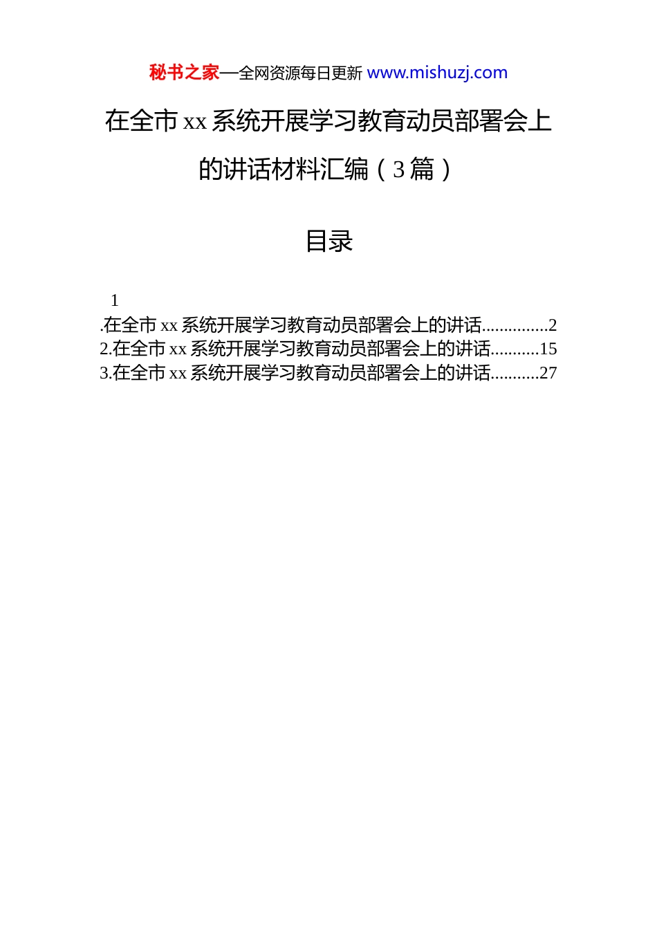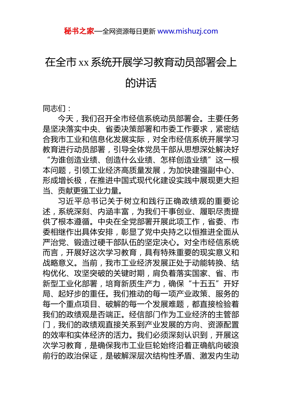 秘书之家—全网资源每日更新 www.mishuzj.com在全市 xx 系统开展学习教育动员部署会上的讲话材料汇编(3 篇)目录1.在全市 xx 系统开展学习教育动员部署会上的讲话...............22.在全市 xx 系统开展学习教育动员部署会上的讲话...........153.在全市 xx 系统开展学习教育动员部署会上的讲话...........27秘书之家—全网资源每日更新 www.mishuzj.com在全市 xx 系统开展学习教育动员部署会上的讲话同志们:今天,我们召开全市经信系统动员部署会。主要任务是坚决落实中央、省委决策部署和市委工作要求,紧密结合我市工业和信息化发展实际,对全市经信系统开展学习教育进行动员部署,引导全体党员干部从思想深处解决好“为谁创造业绩、创造什么业绩、怎样创造业绩”这一根本问题,引领工业经济高质量发展,为加快建强副中心、形成增长极,在推进中国式现代化建设实践中展现更大担当、贡献更强工业力量。习近平总书记关于树立和践行正确政绩观的重要论述,系统深刻、内涵丰富,为我们干事创业、履职尽责提供了根本遵循。中央在全党部署开展此项工作,省委、市委相继作出具体安排,彰显了党中央持之以恒推进全面从严治党、锻造过硬干部队伍的坚定决心。对全市经信系统而言,开展好这次学习教育,具有特殊重要的现实意义和战略意义。当前,我市工业经济发展正处于动能转换、结构优化、攻坚突破的关键时期,肩负着落实国家、省、市新型工业化部署,培育新质生产力,确保“十五五”开好局、起好步的重任。我们推动的每一项产业政策、服务的每一个重点项目、破解的每一个发展难题,都直接检验着我们的政绩观是否端正。经信部门作为工业经济的主管部门,我们的政绩观直接关系到产业发展的方向、资源配置的效率和实体经济的活力。我们必须深刻认识到,开展这次学习教育,是确保我市工业巨轮始终沿着正确航向破浪前行的政治保证,是破解深层次结构性矛盾、激发内生动秘书之家—全网资源每日更新 www.mishuzj.com力的思想武器,是锻造一支“懂工业、爱工业、兴工业”高素质专业化经信铁军的迫切需要。下面,根据中央精神和省委、市委部署,结合我市经信工作实际,我就扎实开展好全市经信系统树立和践行正确政绩观学习教育,讲几点意见。一、提高政治站位,深刻领会树立和践行正确政绩观对推动我市工业高质量发展的极端重要性党的十八大以来,习近平总书记围绕政绩观这一重大命题,作出一系列重要论述。我们必须从政治和全局高度,深刻认识这次学习教育的重大意义,切实增强思想自觉、政治自觉和行动自觉。(一)这是确保党中央关于新型工业化重大战略部署在落地生根的必然要求。推进新型工业化是中国式现代化建设的战略支撑。工信领域是主战场,经信部门是主力军。当前,我市工业经济稳中向好,2025 年全市规模以上工业增加值同比增长约 x.x%,工业投资增速保持两位数增长,但产业结构偏重、创新能力亟待提升、产业链供应链韧性和安全水平有待加强等问题依然突出。正确的政绩观,是我们完整、准确、全面贯彻新发展理念,落实国家制造强国、网络强国战略的“导航仪”。如果政绩观出现偏差,就容易在落实中央决策时搞变通、打折扣,热衷于追逐投资规模大、短期内能拉动 GDP 的“显绩”项目,而忽视强基固本、培育长远竞争力的“潜绩”工作;就可能为了一时数据“好看”,忽视发展的质量和效益,甚至触碰生态红线、安全底线。只有牢固树立和践行正确政绩观,我们才能始终心怀“国之大者”,自觉将工业发展放在全国、全省大局中去谋划推进,确保产业发展的每一步都符合中央精神、顺应时代潮流、服务发展全局。(二)这是破解当前工业发展难题、推动工业行稳致远的迫切需要。当前,我市工业发展机遇与挑战交织。从机遇看,“一带一路”建设、中部地区崛起、黄河流域生秘书之家—全网资源每日更新 www.mishuzj.com态保护和高质量发展等国家战略叠加,省委、省政府对副中心城市建设支持力度持续加大,我市产业基础、区位交通、人力资源等优势明显。从挑战看,外部环境的复杂性、严峻性、不确定性上升,国内有效需求不足,部分传统行业和企业经营压力较大,战略性新兴产业和未来...