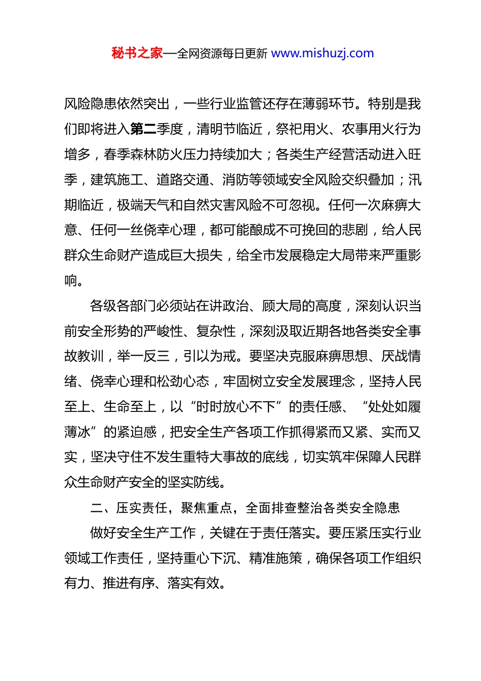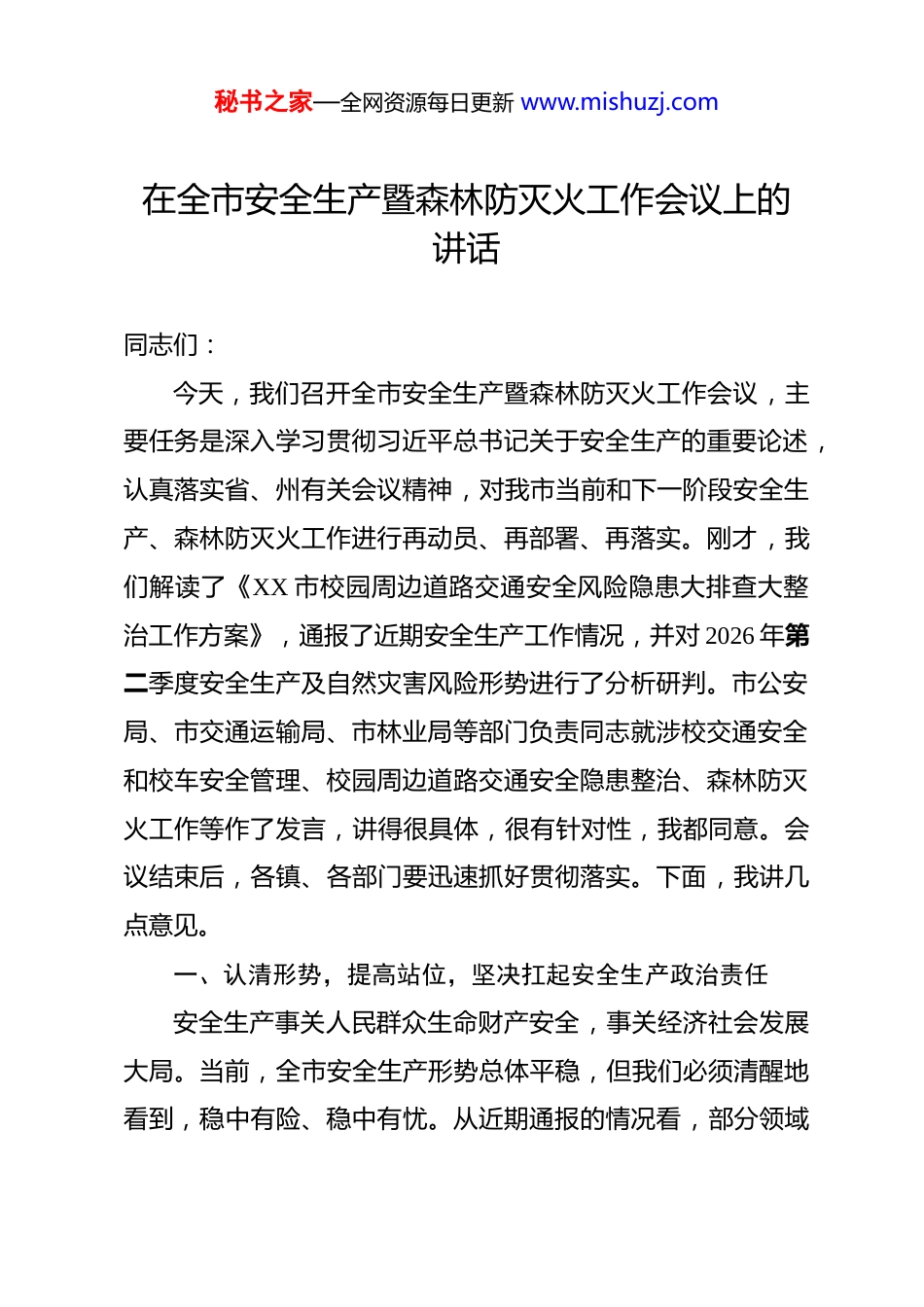 秘书之家—全网资源每日更新 www.mishuzj.com在全市安全生产暨森林防灭火工作会议上的讲话同志们:今天,我们召开全市安全生产暨森林防灭火工作会议,主要任务是深入学习贯彻习近平总书记关于安全生产的重要论述,认真落实省、州有关会议精神,对我市当前和下一阶段安全生产、森林防灭火工作进行再动员、再部署、再落实。刚才,我们解读了《XX 市校园周边道路交通安全风险隐患大排查大整治工作方案》,通报了近期安全生产工作情况,并对 2026 年第二季度安全生产及自然灾害风险形势进行了分析研判。市公安局、市交通运输局、市林业局等部门负责同志就涉校交通安全和校车安全管理、校园周边道路交通安全隐患整治、森林防灭火工作等作了发言,讲得很具体,很有针对性,我都同意。会议结束后,各镇、各部门要迅速抓好贯彻落实。下面,我讲几点意见。一、认清形势,提高站位,坚决扛起安全生产政治责任安全生产事关人民群众生命财产安全,事关经济社会发展大局。当前,全市安全生产形势总体平稳,但我们必须清醒地看到,稳中有险、稳中有忧。从近期通报的情况看,部分领域秘书之家—全网资源每日更新 www.mishuzj.com风险隐患依然突出,一些行业监管还存在薄弱环节。特别是我们即将进入第二季度,清明节临近,祭祀用火、农事用火行为增多,春季森林防火压力持续加大;各类生产经营活动进入旺季,建筑施工、道路交通、消防等领域安全风险交织叠加;汛期临近,极端天气和自然灾害风险不可忽视。任何一次麻痹大意、任何一丝侥幸心理,都可能酿成不可挽回的悲剧,给人民群众生命财产造成巨大损失,给全市发展稳定大局带来严重影响。各级各部门必须站在讲政治、顾大局的高度,深刻认识当前安全形势的严峻性、复杂性,深刻汲取近期各地各类安全事故教训,举一反三,引以为戒。要坚决克服麻痹思想、厌战情绪、侥幸心理和松劲心态,牢固树立安全发展理念,坚持人民至上、生命至上,以“时时放心不下”的责任感、“处处如履薄冰”的紧迫感,把安全生产各项工作抓得紧而又紧、实而又实,坚决守住不发生重特大事故的底线,切实筑牢保障人民群众生命财产安全的坚实防线。二、压实责任,聚焦重点,全面排查整治各类安全隐患做好安全生产工作,关键在于责任落实。要压紧压实行业领域工作责任,坚持重心下沉、精准施策,确保各项工作组织有力、推进有序、落实有效。秘书之家—全网资源每日更新 www.mishuzj.com一是要把安全责任链条拧得更紧。严格落实“党政同责、一岗双责、齐抓共管、失职追责”要求,坚持管行业必须管安全、管业务必须管安全、管生产经营必须管安全。各级领导干部特别是主要负责同志,要亲自研究、亲自部署、亲自推动,分管同志要具体抓、抓具体,形成一级抓一级、层层抓落实的工作格局。各行业主管部门要切实履行监管责任,敢于动真碰硬,抓常抓长、严管严控。企业要严格落实主体责任,加大安全投入,完善规章制度,加强教育培训,把安全生产责任落实到每一个岗位、每一个员工、每一个环节,确保责任不悬空、不落空。二是要把隐患排查整治做得更细。隐患就是事故,必须坚持关口前移、源头治理。要紧盯消防、道路交通、建筑施工、煤矿、非煤矿山、森林防火、地质灾害等重点行业领域,聚焦校园交通安全、农用车辆载人、清明祭祀、农事用火、旅游踏青等关键环节和特殊时段,开展全覆盖、拉网式风险隐患大排查。对排查出的隐患,要建立问题清单、责任清单、整改清单,实行台账化管理、动态化销号,确保各类隐患见底、整改彻底、清零到位。特别是在校园周边交通安全方面,要按照《工作方案》部署,对安全视距、交通组织、安全设施、科技设施进行逐一排查,完善标志标线、减速带、隔离护栏等设施,优化接秘书之家—全网资源每日更新 www.mishuzj.com送区域,严厉查处超速、超载、乱停乱放、非法营运等违法行为,形成“一校一策”整治档案,切实保障师生出行安全。在森林防火方面,要严格野外火源管控,加大对进山入林路口、墓地集中区、农林交错区等重点部位的巡查值守密度,依法严厉打击违规用火行为。三、强化值守,做实准备,着力提升应急处突能力安全生产和防灾减灾工作,预防...