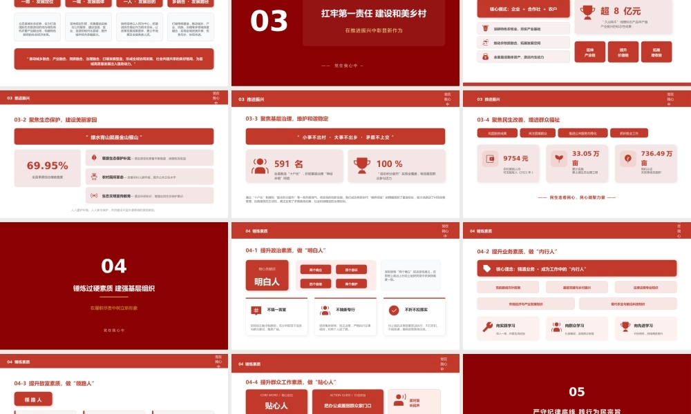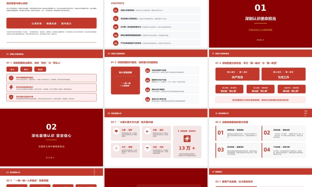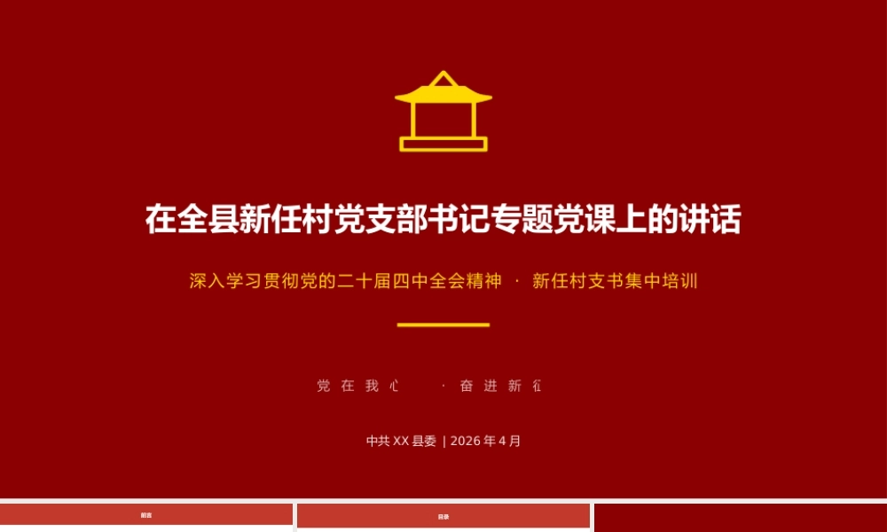 在全县新任村党支部书记专题党课上的讲话深入学习贯彻党的二十届四中全会精神 · 新任村支书集中培训党 在 我 心 中 · 奋 进 新 征 程中共 XX 县委 | 2026 年 4 月前言培训背景与核心目标深入学习贯彻党的二十届四中全会精神,切实把思想和行动统一到全会的决策部署上来。本次对新当选的村党支部书记、村委会主任开展集中培训,是立足基层发展实际的重要举措,旨在帮助大家全面、系统地认清当前“三农”工作的新形势,精准把握乡村振兴的新任务。认 清 形 势 · 明 确 任 务 · 提 升 能 力村党支部书记是党在基层的“领头雁”,肩负着组织群众、宣传群众、凝聚群众、服务群众的重要职责。作为连接党心与民心的桥梁纽带,各位的能力素质直接关系到乡村振兴战略的落地成效,希望大家珍惜培训机会,真正做到学以致用、履职尽责。目录CONTENTS01深刻认识使命担当 | 在政治站位上达到新高度,明确核心职责与方向02深化县情认识坚定信心 | 在服务大局中展现新担当,凝聚发展共识与力量03扛牢第一责任建设和美乡村 | 在推进振兴中彰显新作为,落实乡村建设具体举措04锤炼过硬素质建强基层组织 | 在履职尽责中树立新形象,打造坚强战斗堡垒05严守纪律底线践行为民宗旨 | 在清正廉洁中塑造新风尚,永葆党员干部政治本色01深刻认识使命担当在政治站位上达到新高度党在我心中01 深刻认识使命担当01-1 深刻把握政治属性,当好“班长”与“带头人”班 长带头人领头雁党中央提倡的坚决响应对党中央发出的号召、提倡的做法,必须第一时间传达学习、领会精神,结合实际坚决贯彻落实。党中央决定的坚决执行对党中央作出的重大决策部署,必须不打折扣、不搞变通,以钉钉子精神一抓到底,确保落地见效。党中央禁止的坚决不做时刻绷紧政治纪律和政治规矩这根弦,对党中央明令禁止的行为,必须立场坚定、态度鲜明,坚决杜绝。01 深刻认识使命担当01-2 深刻把握时代使命,抢抓重大机遇叠加核心发展战略“ 一地一城一人多融合”01年保玉则保护与发展坚持生态优先,探索生态保护与全域旅游协同发展新路径02国家现代农业产业园聚焦特色产业,打造集生产、加工、物流于一体的农业高地03团结水库工程建设补齐水利短板,为区域经济社会可持续发展提供坚实保障04县城三年大变样行动提升城市品质,构建宜居宜业宜游的现代化县城发展新格局01 深刻认识使命担当01-3 深刻把握为民宗旨,牢记“第一身份”与“第一职责”核心定位 · 第一身份共产党员核心定位 · 第一职责为党工作用心用情 · 着力解决群众的“操心事”深入基层 · 精准对接群众的“烦心事”担当作为 · 攻坚克难群众的“揪心事”把为民服务初心深深扎根雪域高原,用实际行动赢得群众的信任和支持02深化县情认识 坚定信心在服务大局中展现新担当党 在 我 心 中02 深化县情认识02-1 “ 大爱大美大方大道”的丰富内涵大爱 · 情怀秉持民族团结之爱、生态保护之爱与为民服务之爱,凝聚发展温情。大美 · 底色展现自然生态之美、民族文化之美与城乡发展之美,绘就宜居画卷。大方 · 胸襟拥有开放包容的胸襟、大气磅礴的格局,激发乡村振兴的内生动力。大道 · 方向坚定绿色发展之路、共同富裕之路与和谐善治之路,引领县域高质量发展。▌ 实践成果:励志积分13 万 +励志积分超市累计兑换积分(群众参与乡村治理的生动体现)02 深化县情认识党在我心中02-2 当前发展面临的重大机遇01政策机遇 · 顶层赋能国家和省州对我县生态保护、乡村振兴等方面给予了强有力的政策倾斜与资金支持,为县域发展指明了方向。02项目机遇 · 硬核支撑“ 年保玉则”生态旅游、“国家现代农业产业园”及“团结水库”等一批重大项目落地实施,有效拉动区域经济增长。03区位机遇 · 通道优势随着交通路网等基础设施的全面改善,我县的区域连接性显著增强,独特的地理区位优势日益凸显,发展空间不断拓宽。04产业机遇 · 特色引领牦牛养殖、生态旅游等特色产业基础扎实、链条完整,具备巨大的发展潜力,是推动我县经济高质量发展的核心引擎。02 深化县情认识党在我心中02-3 “ 一...