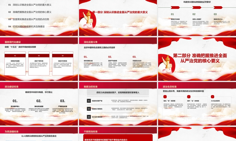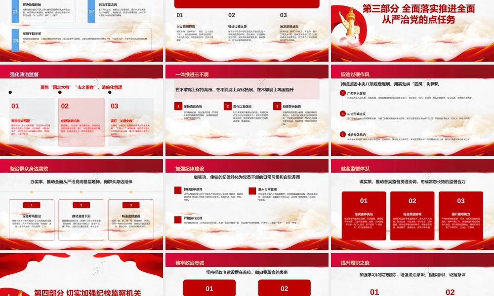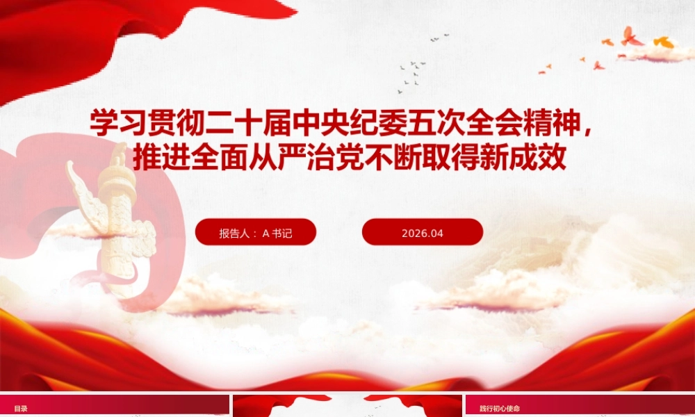 学习贯彻二十届中央纪委五次全会精神,推进全面从严治党不断取得新成效报告人: A 书记2026.044深刻认识推进全面从严治党的重大意义01准确把握推进全面从严治党的核心要义02全面落实推进全面从严治党的点任务03切实加强纪检监察机关自身建设04目录第一部分 深刻认识推进全面从严治党的重大意义34巩固党长期执政根基的必然要求赓续红色血脉回顾我市发展历程,每一项成就的取得,根本在于始终坚持党的领导。站在新的历史起点,必须以更高标准推进自我革命,确保党始终成为坚强领导核心。01赢得人民拥护当前我市正处于转型发展的关键期,人民群众对美好生活的向往更加强烈。必须通过全面从严治党,不断纯洁党的队伍,始终赢得全市人民的衷心拥护和支持。02确保红色江山推进全面从严治党是党永葆生机活力、走好新的赶考之路的必由之路,是确保红色江山永不变色的根本保障。03践行初心使命4保障“十五五”良好开局的现实需要保障宏伟蓝图•2026 年是“十五五”规划开局之年,市委确立了高质量发展的奋斗目标。关键在党,关键在人,必须以严明的纪律作风保障市委决策部署落到实处。01激发干事热情•面对繁重任务和严峻挑战,越需要坚强的纪律作风作保障。通过全面从严治党,有效激发全市党员干部干事创业的精气神,凝聚起强大发展合力。02确保开好新局•只有把全面从严治党贯穿于现代化我市建设的全过程,以零容忍态度惩治腐败,才能确保“十五五”时期目标任务顺利实现,开创新的发展局面。03服务现代化建设4走好中国特色反腐败之路的必然选择保持清醒头脑我市反腐败斗争压倒性态势已经形成,但形势依然严峻复杂,存量问题尚未清底,增量问题仍有发生,必须始终保持清醒头脑,增强忧患意识。01.坚持严的基调工程建设、国资国企、金融等重点领域腐败问题仍需高度警惕,“四风”问题隐形变异风险犹存,必须坚持严的基调、严的措施、严的氛围不动摇。02.巩固政治生态反腐败斗争容不得丝毫松懈,必须以更高标准深化标本兼治,一体推进不敢腐、不能腐、不想腐,坚决打赢反腐败斗争攻坚战持久战,不断巩固发展我市风清气正的政治生态。03.深化反腐斗争第二部分 准确把握推进全面从严治党的核心要义34确保党中央政令畅通、令行禁止坚决维护核心全市各级党组织和党员干部必须旗帜鲜明讲政治,深刻领悟“两个确立”的决定性意义,坚决做到“两个维护”,始终同党中央保持高度一致。01.强化政治监督紧紧围绕党中央重大部署和习近平总书记重要指示,聚焦市委中心工作,推进政治监督具体化、精准化、常态化。02.严明政治纪律坚决同各种违背党的路线方针政策的言行作斗争,严肃查处“七个有之”问题,清除对党不忠诚不老实的“两面人”,确保我市发展始终沿着正确政治方向前进。03.政治建设标准4把权力关进制度的笼子,实现用制度管权管事管人01结合我市实际,聚焦权力运行的关键环节,持续完善法规制度,堵塞漏洞,切实解决“牛栏关猫”问题,使制度篱笆扎得更紧更密。制度体系要严密02加强制度宣传教育,强化对制度执行情况的监督检查,对随意变通、无视制度的行为“零容忍”,坚决纠正有令不行、有禁不止现象。制度执行要刚性03深化党务、政务、司法和各领域办事公开,推进权力运行全过程可查询、可追溯,让权力在阳光下运行,压缩暗箱操作空间。权力运行要透明制度治权标准4营造山清水秀、海晏河清的政治生态和发展环境坚持有案必查、有腐必反,深化整治权力集中、资金密集、资源富集领域的腐败,坚决惩治群众身边的“蝇贪蚁腐”,不断清除政治生态“污染源”。强化“惩”的震慑1做深做实查办案件“后半篇文章”,加强类案分析,深化以案促改、以案促治,推动重点领域体制机制改革,实现查处一案、警示一片、治理一域的综合效果。提升“治”的效能2加强新时代廉洁文化建设,深入挖掘我市历史文化、红色文化中的廉洁元素,打造“清廉我市”品牌,教育引导党员干部修身律己、廉洁齐家。大力弘扬清风3政治生态标准4让人民群众感受到全面从严治党就在身边01解决急难愁盼把整治群众身边不正之风和腐败问题摆在更加突出位置,持续深化乡村振兴、教育医疗、养老社保等领域专项治理,以“小切口”推...