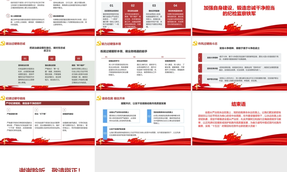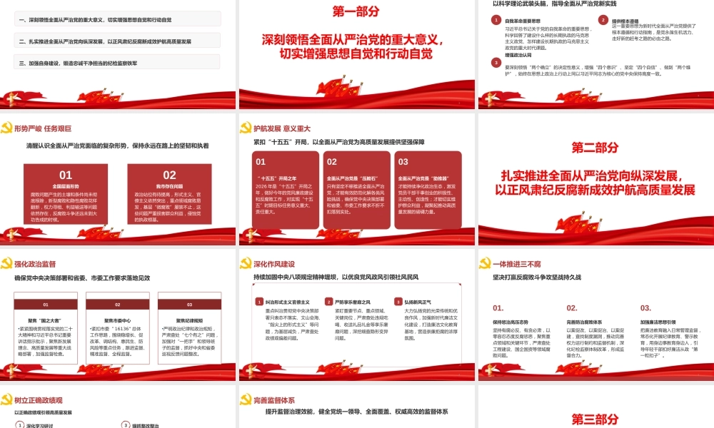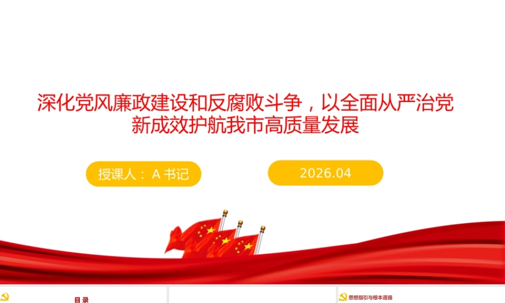 深化党风廉政建设和反腐败斗争,以全面从严治党新成效护航我市高质量发展授课人: A 书记2026.04目 录一、深刻领悟全面从严治党的重大意义,切实增强思想自觉和行动自觉二、扎实推进全面从严治党向纵深发展,以正风肃纪反腐新成效护航高质量发展三、加强自身建设,锻造忠诚干净担当的纪检监察铁军第一部分深刻领悟全面从严治党的重大意义,切实增强思想自觉和行动自觉34以科学理论武装头脑,指导全面从严治党新实践1习近平总书记关于党的自我革命的重要思想,科学回答了建设什么样的长期执政的马克思主义政党、怎样建设长期执政的马克思主义政党的重大时代课题。自我革命重要思想2这一重要思想为新时代全面从严治党提供了根本遵循和行动指南,是党永葆生机活力、走好新的赶考之路的必由之路。提供根本遵循3要深刻领悟“两个确立”的决定性意义,增强“四个意识”、坚定“四个自信”、做到“两个维护”,始终在思想上政治上行动上同以习近平同志为核心的党中央保持高度一致。增强政治认同思想指引与根本遵循4清醒认识全面从严治党面临的复杂形势,保持永远在路上的坚韧和执着全国层面形势腐败问题产生的土壤和条件尚未彻底根除,新型腐败和隐性腐败花样翻新,权力寻租、利益输送等问题依然存在,反腐败斗争还远未到大功告成的时候。01我市存在问题政治站位有待提高,形式主义、官僚主义依然突出,重点领域腐败易发,基层“微腐败”屡禁不止,这些问题严重损害群众利益,侵蚀党的执政根基。02形势严峻 任务艰巨4“ 十五五”开局之年2026 年是“十五五”开局之年,做好今年的党风廉政建设和反腐败工作,对实现“十五五”时期目标任务意义重大、责任重大。01全面从严治党是“压舱石”只有坚定不移推进全面从严治党,才能有效防范化解各类风险挑战,确保党中央决策部署和省委、市委工作要求不折不扣落到实处。02全面从严治党是“助推器”才能持续净化政治生态,激发党员干部干事创业的积极性、主动性、创造性;才能切实维护群众利益,凝聚起推动高质量发展的磅礴力量。03紧扣“十五五”开局,以全面从严治党为高质量发展提供坚强保障护航发展 意义重大第二部分扎实推进全面从严治党向纵深发展,以正风肃纪反腐新成效护航高质量发展34确保党中央决策部署和省委、市委工作要求落地见效聚焦“国之大者”•紧紧围绕贯彻落实党的二十大精神和习近平总书记重要讲话指示批示,聚焦新发展理念、高质量发展等重大战略部署,加强监督检查。01聚焦市委中心•紧扣市委“ 16136” 总体工作思路,围绕稳增长、促改革、调结构、惠民生、防风险等重点任务,跟进监督、精准监督、全程监督。02聚焦纪律规矩•严明政治纪律和政治规矩,严肃查处“七个有之”问题,加强对“一把手”和领导班子的监督,抓好中央和省委巡视反馈问题整改。03强化政治监督41纠治形式主义官僚主义重点纠治贯彻党中央决策部署只表态不落实、文山会海、“指尖上的形式主义”等问题,为基层减负,严肃查处政绩观偏差问题。2严防享乐奢靡之风紧盯重要节点、重点领域、关键岗位,严肃查处违规吃喝、收送礼品礼金等享乐奢靡问题,深挖细查隐形变异问题。3弘扬新风正气大力弘扬党的光荣传统和优良作风,加强新时代廉洁文化建设,打造廉洁文化教育基地,营造崇廉拒腐的浓厚氛围。持续加固中央八项规定精神堤坝,以优良党风政风引领社风民风深化作风建设4坚决打赢反腐败斗争攻坚战持久战保持惩治高压态势坚持有腐必反、有贪必肃,以零容忍态度反腐惩恶,聚焦重点领域和关键环节,严肃查处工程建设、国企国资等领域腐败问题。01.完善防治腐败体系以案促改、以案促治、以案促建,查找制度漏洞,推动完善权力运行制约和监督机制,深化纪检监察体制改革,形成监督合力。02.加强廉洁思想引领把廉洁教育融入日常管理监督,常态化开展纪律教育、警示教育,用身边事教育身边人,引导年轻干部扣好廉洁从政“第一粒扣子”。03.一体推进三不腐4以正确政绩观引领高质量发展深化学习研讨组织党员干部深入学习习近平总书记关于树立和践行正确政绩观的重要论述,深刻领会正确政绩观的核心要义和实践要求。1深入查摆问题通过多种途径查找政绩观方面...