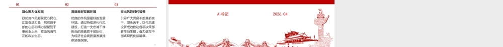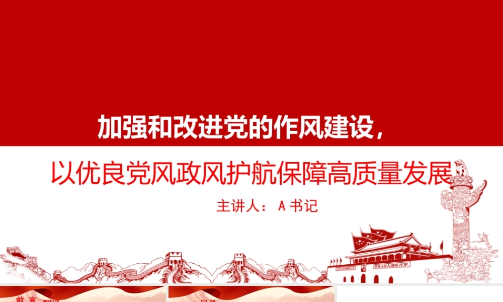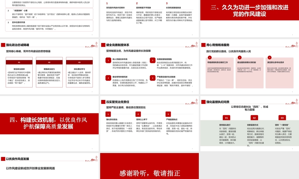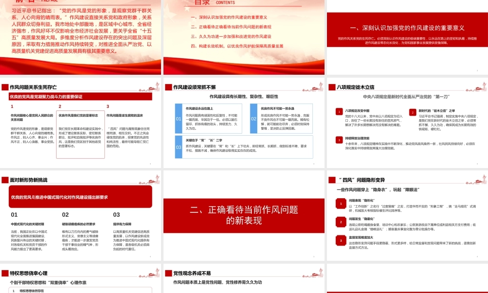 加强和改进党的作风建设,以优良党风政风护航保障高质量发展主讲人: A 书记版权声明感谢您下载工图网平台上提供的 PPT 作品,为了您和工图网以及原创作者的利益,请勿复制、传播、销售,否则将承担法律责任!工图网将对作品进行维权,按照传播下载次数进行十倍的索取赔偿!1. 在工图网出售的 PPT 模板是免版税类( RF : Royalty-Free )正版受《中华人民共和国著作权法》和《世界版权公约》的保护,作品的所有权、版权和著作权归工图网所有,您下载的是 PPT 模板素材的使用权。2. 不得将工图网的 PPT 模板、 PPT 素材,本身用于再出售,或者出租、出借、转让、分销、发布或者作为礼物供他人使用,不得转授权、出卖、转让本协议或者本协议中的权利。更多精品 PPT 模板: www.900ppt.com前 言 PREFACE习近平总书记指出:“党的作风是党的形象,是观察党群干群关系、人心向背的晴雨表。”作风建设直接关系党和政府形象,关系人民群众切身利益。我市地处中部腹地,是区域中心城市、全省经济强市,作风好坏不仅影响全市经济社会发展,更关乎全省“十五五”高质量发展大局。多维度分析作风建设存在的突出问题及深层原因,采取有力措施推动作风持续转变,对推进全面从严治党、以高质量机关党建促进高质量发展具有极其重要意义。版权声明感谢您下载工图网平台上提供的 PPT 作品,为了您和工图网以及原创作者的利益,请勿复制、传播、销售,否则将承担法律责任!工图网将对作品进行维权,按照传播下载次数进行十倍的索取赔偿!1. 在工图网出售的 PPT 模板是免版税类( RF : Royalty-Free )正版受《中华人民共和国著作权法》和《世界版权公约》的保护,作品的所有权、版权和著作权归工图网所有,您下载的是 PPT 模板素材的使用权。2. 不得将工图网的 PPT 模板、 PPT 素材,本身用于再出售,或者出租、出借、转让、分销、发布或者作为礼物供他人使用,不得转授权、出卖、转让本协议或者本协议中的权利。更多精品 PPT 模板: www.900ppt.com目录 CONTENTS一、深刻认识加强党的作风建设的重要意义二、正确看待正确看待当前作风问题的新表现三、久久为功进一步加强和改进党的作风建设四、构建长效机制,以优良作风护航保障高质量发展3一、深刻认识加强党的作风建设的重要意义党的作风关系党的生死存亡。必须深刻认识作风建设的极端重要性,以永远在路上的坚韧和执着,持续推进作风建设常态化长效化,为党和国家事业发展提供坚强保障。4优良的党风是党凝聚力战斗力的重要保证党的作风是党的形象,是观察党群干群关系、人心向背的晴雨表。作风正,则人心齐、事业兴;作风不正,则人心涣散、事业受损。作风问题核心是党同人民群众的关系问题1我们党在长期革命和建设实践中,形成了理论联系实际、密切联系群众、批评和自我批评等优良作风,这是我们党区别于其他政党的显著标志。优良作风是我们党的显著标志2“ 四风”问题与腐败现象往往同根同源、相互交织。不正之风会侵蚀党的肌体,损害党的先进性和纯洁性,最终可能导致亡党亡国的危险。作风问题是滋生腐败的温床3作风问题关系生死存亡4作风建设具有长期性、复杂性、艰巨性01作风建设永远在路上作风问题具有顽固性和反复性,不可能一蹴而就、毕其功于一役。必须以踏石留印、抓铁有痕的劲头,持续发力、久久为功。02优良作风不可能一劳永逸形成优良作风不可能一劳永逸,克服不良作风也不可能一蹴而就。稍有松懈,就可能前功尽弃,必须时刻保持警惕,坚决防止反弹回潮。03关键在于“常”“长”二字抓作风建设,关键要在“常”和“长”上下功夫,即经常抓、长期抓,做到标准不降、要求不松、措施不减,确保作风建设取得实实在在的成效。作风建设须常抓不懈4中央八项规定是新时代全面从严治党的“第一刀”1八项规定改变中国党的十八大以来,党中央以八项规定为切入口,刹住了一些长期没有刹住的歪风邪气,解决了许多长期想解决而没有解决的难题。2新时代的“徙木立信”之举习近平总书记强调,制定实施中央八项规定,是我们党在新时代的徙木立信之举,必须常抓不懈、久久为功,确保其成为长期有效的铁...