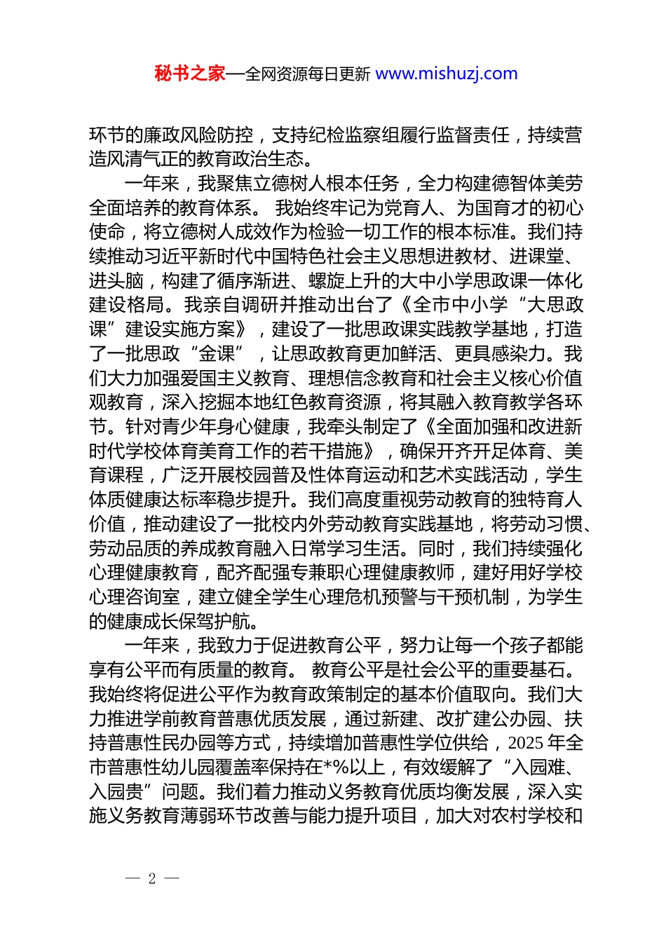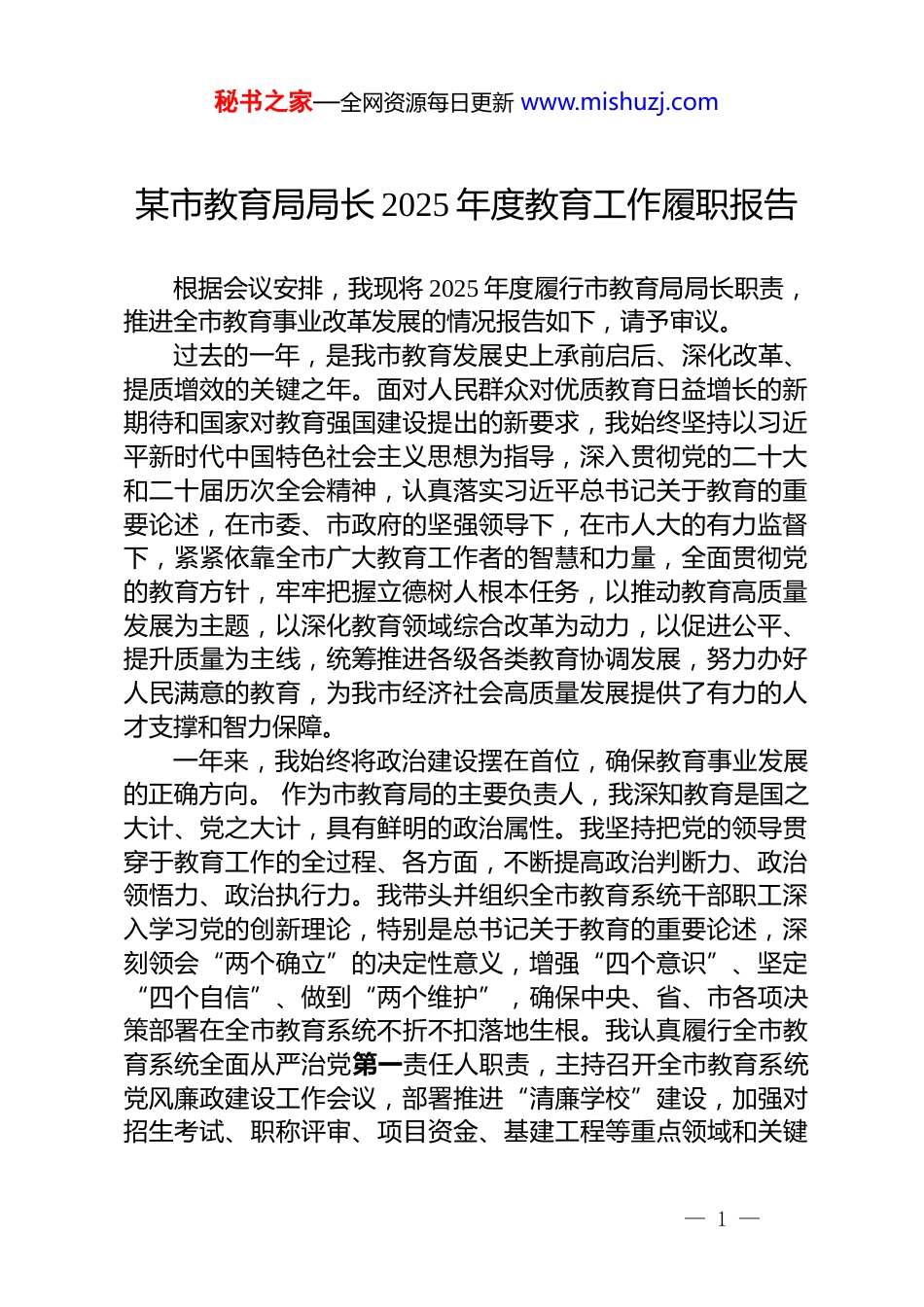 秘书之家—全网资源每日更新 www.mishuzj.com某市教育局局长 2025 年度教育工作履职报告根据会议安排,我现将 2025 年度履行市教育局局长职责,推进全市教育事业改革发展的情况报告如下,请予审议。过去的一年,是我市教育发展史上承前启后、深化改革、提质增效的关键之年。面对人民群众对优质教育日益增长的新期待和国家对教育强国建设提出的新要求,我始终坚持以习近平新时代中国特色社会主义思想为指导,深入贯彻党的二十大和二十届历次全会精神,认真落实习近平总书记关于教育的重要论述,在市委、市政府的坚强领导下,在市人大的有力监督下,紧紧依靠全市广大教育工作者的智慧和力量,全面贯彻党的教育方针,牢牢把握立德树人根本任务,以推动教育高质量发展为主题,以深化教育领域综合改革为动力,以促进公平、提升质量为主线,统筹推进各级各类教育协调发展,努力办好人民满意的教育,为我市经济社会高质量发展提供了有力的人才支撑和智力保障。一年来,我始终将政治建设摆在首位,确保教育事业发展的正确方向。 作为市教育局的主要负责人,我深知教育是国之大计、党之大计,具有鲜明的政治属性。我坚持把党的领导贯穿于教育工作的全过程、各方面,不断提高政治判断力、政治领悟力、政治执行力。我带头并组织全市教育系统干部职工深入学习党的创新理论,特别是总书记关于教育的重要论述,深刻领会“两个确立”的决定性意义,增强“四个意识”、坚定“四个自信”、做到“两个维护”,确保中央、省、市各项决策部署在全市教育系统不折不扣落地生根。我认真履行全市教育系统全面从严治党第一责任人职责,主持召开全市教育系统党风廉政建设工作会议,部署推进“清廉学校”建设,加强对招生考试、职称评审、项目资金、基建工程等重点领域和关键— 1 —秘书之家—全网资源每日更新 www.mishuzj.com环节的廉政风险防控,支持纪检监察组履行监督责任,持续营造风清气正的教育政治生态。一年来,我聚焦立德树人根本任务,全力构建德智体美劳全面培养的教育体系。 我始终牢记为党育人、为国育才的初心使命,将立德树人成效作为检验一切工作的根本标准。我们持续推动习近平新时代中国特色社会主义思想进教材、进课堂、进头脑,构建了循序渐进、螺旋上升的大中小学思政课一体化建设格局。我亲自调研并推动出台了《全市中小学“大思政课”建设实施方案》,建设了一批思政课实践教学基地,打造了一批思政“金课”,让思政教育更加鲜活、更具感染力。我们大力加强爱国主义教育、理想信念教育和社会主义核心价值观教育,深入挖掘本地红色教育资源,将其融入教育教学各环节。针对青少年身心健康,我牵头制定了《全面加强和改进新时代学校体育美育工作的若干措施》,确保开齐开足体育、美育课程,广泛开展校园普及性体育运动和艺术实践活动,学生体质健康达标率稳步提升。我们高度重视劳动教育的独特育人价值,推动建设了一批校内外劳动教育实践基地,将劳动习惯、劳动品质的养成教育融入日常学习生活。同时,我们持续强化心理健康教育,配齐配强专兼职心理健康教师,建好用好学校心理咨询室,建立健全学生心理危机预警与干预机制,为学生的健康成长保驾护航。一年来,我致力于促进教育公平,努力让每一个孩子都能享有公平而有质量的教育。 教育公平是社会公平的重要基石。我始终将促进公平作为教育政策制定的基本价值取向。我们大力推进学前教育普惠优质发展,通过新建、改扩建公办园、扶持普惠性民办园等方式,持续增加普惠性学位供给,2025 年全市普惠性幼儿园覆盖率保持在*%以上,有效缓解了“入园难、入园贵”问题。我们着力推动义务教育优质均衡发展,深入实施义务教育薄弱环节改善与能力提升项目,加大对农村学校和— 2 —秘书之家—全网资源每日更新 www.mishuzj.com薄弱学校的投入力度,改善办学条件。我重点推动并深化了“学区制管理”和“集团化办学”改革,组建了*个优质教育集团,覆盖了*所成员校,通过骨干教师交流、教研科研联动、课程资源共享等方式,有效扩大了优质教育资源的覆盖面,校际差距、城乡差距进一步缩小。我们特别关注特殊群体就学保障,加强了农...