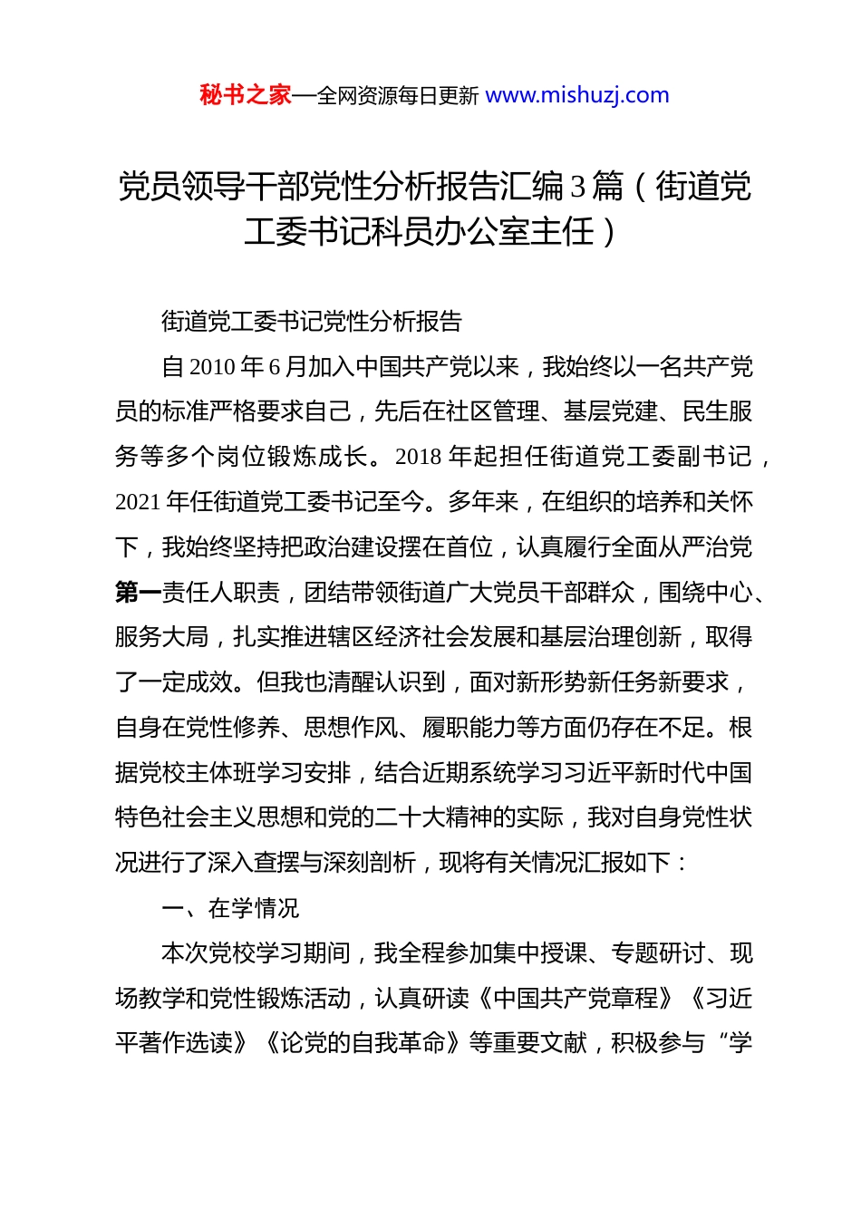 秘书之家—全网资源每日更新 www.mishuzj.com党员领导干部党性分析报告汇编 3 篇(街道党工委书记科员办公室主任)街道党工委书记党性分析报告自 2010 年 6 月加入中国共产党以来,我始终以一名共产党员的标准严格要求自己,先后在社区管理、基层党建、民生服务等多个岗位锻炼成长。2018 年起担任街道党工委副书记,2021 年任街道党工委书记至今。多年来,在组织的培养和关怀下,我始终坚持把政治建设摆在首位,认真履行全面从严治党第一责任人职责,团结带领街道广大党员干部群众,围绕中心、服务大局,扎实推进辖区经济社会发展和基层治理创新,取得了一定成效。但我也清醒认识到,面对新形势新任务新要求,自身在党性修养、思想作风、履职能力等方面仍存在不足。根据党校主体班学习安排,结合近期系统学习习近平新时代中国特色社会主义思想和党的二十大精神的实际,我对自身党性状况进行了深入查摆与深刻剖析,现将有关情况汇报如下:一、在学情况本次党校学习期间,我全程参加集中授课、专题研讨、现场教学和党性锻炼活动,认真研读《中国共产党章程》《习近平著作选读》《论党的自我革命》等重要文献,积极参与“学秘书之家—全网资源每日更新 www.mishuzj.com习贯彻党的二十大精神”“加强党的政治建设”“提升基层治理效能”等主题研讨交流。通过系统学习,进一步深化了对马克思主义中国化时代化最新成果的理解把握,增强了“四个意识”、坚定了“四个自信”、做到了“两个维护”的政治自觉。特别是在重温入党誓词、参观红色教育基地、开展廉政警示教育过程中,心灵受到深刻洗礼,理想信念更加坚定,宗旨意识更加牢固。在遵守校规校纪方面,我严格执行党校各项管理制度,按时上课、积极发言、认真完成学习笔记和心得体会,未发生迟到早退、无故缺课或违反廉洁纪律的行为。坚持理论联系实际,注重将所学所思转化为推动工作的思路举措,努力做到学思用贯通、知信行统一。二、查摆问题尽管近年来在工作中取得了一些成绩,但在深入学习《中国共产党章程》、对照先进典型、听取群众意见的基础上,我深刻认识到自身仍存在一些不容忽视的问题和差距,主要表现在以下几个方面:一是理想信念的坚定性有待进一步增强。虽然能够坚持政治理论学习,但在学深悟透、融会贯通上还有差距。有时满足于完成“规定动作”,对党的创新理论背后的历史逻辑、理论秘书之家—全网资源每日更新 www.mishuzj.com逻辑和实践逻辑钻研不够深入,导致在复杂形势面前政治敏锐性和鉴别力还需提升。例如,在应对网络舆情时,个别时候对苗头性、倾向性问题反应不够迅速,说明从政治高度观察、分析和处理问题的能力仍有待加强。二是宗旨意识践行不够充分。作为街道“一把手”,虽然经常下社区、访民情,但有时存在“走马观花”现象,真正蹲点调研、解剖麻雀式的工作做得不多。对群众反映的一些急难愁盼问题,虽然作了部署安排,但在跟踪问效、闭环落实上盯得不紧,个别事项推进缓慢,影响了群众获得感。比如老旧小区加装电梯项目,因协调难度大、资金筹措难等原因,进展不及预期,反映出为民服务的韧劲和攻坚克难的决心还需强化。三是作风建设仍需持续用力。工作中偶有重部署轻落实、重结果轻过程的现象,对干部提醒督促多,面对面指导帮助少。有时会议偏多,存在以会议落实会议的情况,一定程度上增加了基层负担。在反对形式主义、官僚主义方面,虽然态度坚决,但对隐形变异的新表现警惕不足,如个别汇报材料中仍存在“穿靴戴帽”、数据美化等问题未能及时纠正。四是纪律规矩意识需再绷紧。能够严守党的政治纪律和政治规矩,自觉净化社交圈、生活圈、朋友圈。但在执行中央八项规定及其实施细则精神方面,对分管领域干部的日常监督提秘书之家—全网资源每日更新 www.mishuzj.com醒还不够经常,廉政谈话有时流于形式。对家属和身边工作人员的教育管理也需进一步加强,防止“裙带关系”影响公正执行公务的风险意识有待提高。五是担当作为的锐气有所减弱。面对基层治理中的深层次矛盾和历史遗留问题,有时存在求稳怕乱思想,改革创新的勇气不足。例如,在推进社区减负增效改革中,担心影响稳定而步伐较...