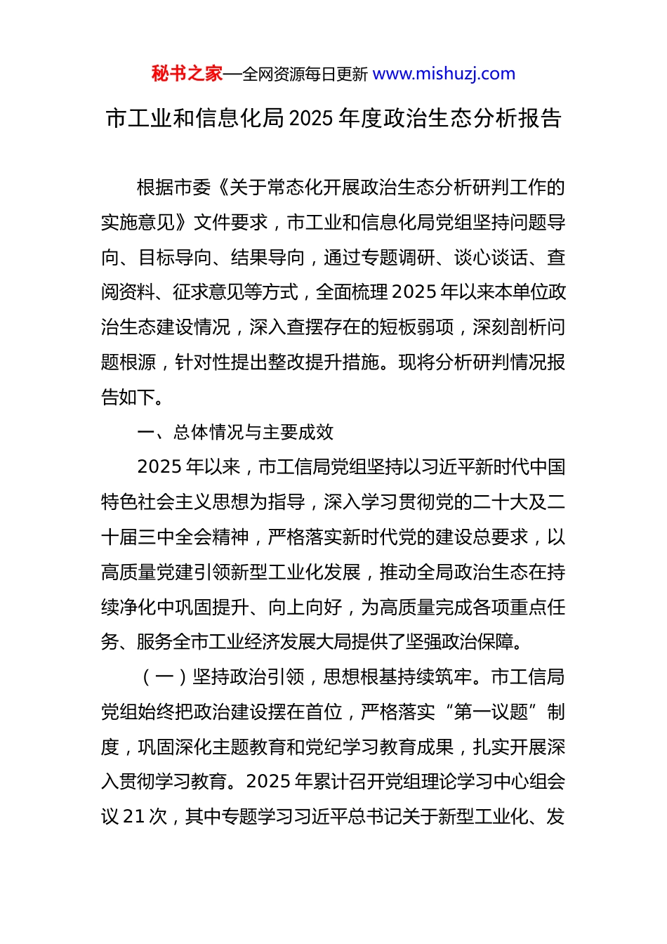 秘书之家—全网资源每日更新 www.mishuzj.com市工业和信息化局 2025 年度政治生态分析报告 根据市委《关于常态化开展政治生态分析研判工作的实施意见》文件要求,市工业和信息化局党组坚持问题导向、目标导向、结果导向,通过专题调研、谈心谈话、查阅资料、征求意见等方式,全面梳理 2025 年以来本单位政治生态建设情况,深入查摆存在的短板弱项,深刻剖析问题根源,针对性提出整改提升措施。现将分析研判情况报告如下。一、总体情况与主要成效2025 年以来,市工信局党组坚持以习近平新时代中国特色社会主义思想为指导,深入学习贯彻党的二十大及二十届三中全会精神,严格落实新时代党的建设总要求,以高质量党建引领新型工业化发展,推动全局政治生态在持续净化中巩固提升、向上向好,为高质量完成各项重点任务、服务全市工业经济发展大局提供了坚强政治保障。(一)坚持政治引领,思想根基持续筑牢。市工信局党组始终把政治建设摆在首位,严格落实“第一议题”制度,巩固深化主题教育和党纪学习教育成果,扎实开展深入贯彻学习教育。2025 年累计召开党组理论学习中心组会议 21 次,其中专题学习习近平总书记关于新型工业化、发秘书之家—全网资源每日更新 www.mishuzj.com展新质生产力等重要论述 13 次;组织开展专题研讨 6 场,覆盖干部职工 180 余人次。创新“理论+实践”学习模式,结合“工业企业服务月”“专精特新企业培育”等重要节点和重大活动,组织党员干部深入基层一线开展政策宣讲、实践服务 8 场,发放宣传资料 2000 余份。依托“学习强国”等线上平台,建立“每日打卡+每周晾晒+每月评比”激励机制,全局人均年度学习积分达 12800 分,在市直机关单位中排名前列。特别是在理论学习中涌现出一批先进典型,如产业政策科*同志,坚持手写学习笔记20 余万字,其结合*地区产业转型升级撰写的学习心得被《*日报》刊发,成为全局干部职工理论学习的鲜活榜样。(二)压实“两个责任”,管党治党向纵深推进。市工信局党组严格履行全面从严治党主体责任,年初即制定印发《2025 年党建工作要点》和《党风廉政建设责任清单》,将全年党建和廉政工作细化分解为 32 项具体任务,并组织全体党员干部签订《党风廉政建设承诺书》56 份,确保责任层层压实。构建起“一把手”负总责、班子成员履行“一岗双责”、科室负责人承担“直接责任”的三级责任传导体系。全年召开党风廉政建设专题会议 4 次,专题研究解决难点问题。常态化开展廉政风险点排查,全年共开展 12 轮动态排查,梳理出行政审批、资金分配、项目秘书之家—全网资源每日更新 www.mishuzj.com评审等重点岗位风险点 23 个,针对性制定防控措施 28条。创新实施“嵌入式”监督模式,在“*市先进制造业发展专项资金”评审、重点工业项目招投标等核心业务环节设置“纪律观察员”,2025 年以来对 12 个重点项目、56家服务对象开展“伴随式”监督,及时发现并整改苗头性、倾向性问题 7 个。突出“以案促改、以案促治”,组织全局干部职工集中观看警示教育片 4 场,开展“身边事教育身边人”以案说纪微课堂 6 次,全局干部职工的纪律意识、规矩意识显著增强。2025 年以来,全局未发生一起违纪违法案件。(三)聚焦中心大局,服务发展彰显担当。市工信局党组坚持将党建工作与中心工作同谋划、同部署、同落实,在服务全市工业经济高质量发展的战场上检验政治生态建设成效。2025 年,在市委、市政府的坚强领导下,全市工业经济保持稳中向好、进中提质的良好态势。截至第三季度,全市实现地区生产总值同比增长 7.2%,其中规模以上工业增加值同比增长 8.1%,固定资产投资同比增长9.5%,为全市经济稳定增长提供了有力支撑。成绩的背后,是全局干部队伍过硬政治素质和担当精神的集中体现。我们坚持在“急难险重”任务中考察和锻炼干部,围绕“*市重点产业链供应链韧性提升”“百家企业数字化转秘书之家—全网资源每日更新 www.mishuzj.com型”等攻坚行动,先后成立“党员突击队”7 支,设立“党员先锋岗”15 个。在推进*老工业基地产业转型升级专项工作中,相关党员干部连续奋战 60...